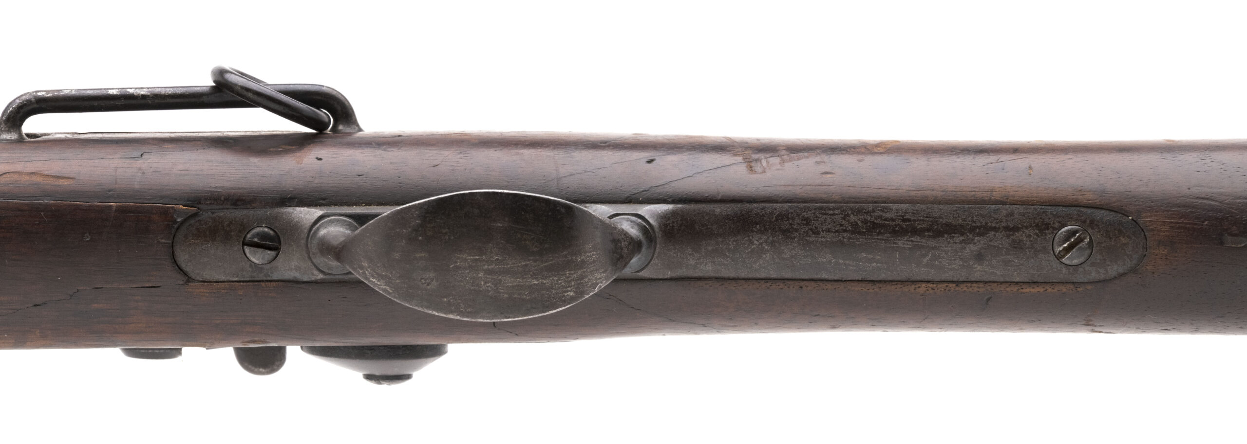 Serial No. 177217(STAR), made in 1882, .45-70, 22” round proofed barrel. Bore shows scattered oxidation with rifling visible. Metal parts have turned to a brown/grey patina. Rear sight is a 1st type 1879 buckhorn sight marked “C”. Traces of case coloring are present inside the breech block. Stock is marked with “SWP/1881” cartouche. The wrist has noticeable repairs visible. Action functions correctly.