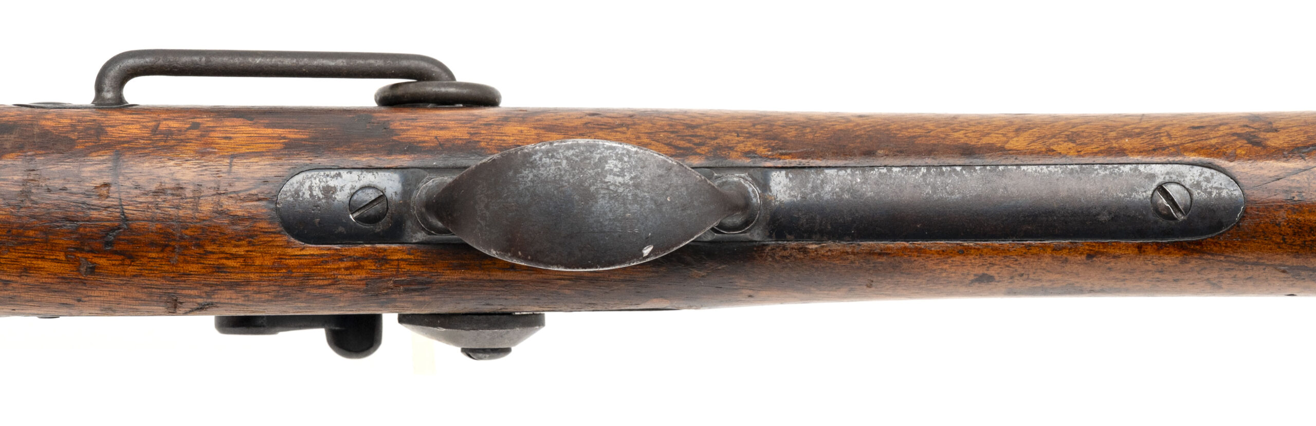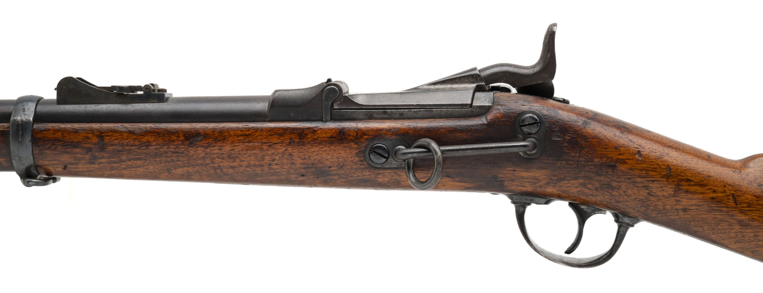 Serial No. 76082, manufactured circa April–June 1877, chambered in .45-70 with a 22” round barrel. Bore is bright with light frosting present. Metal surfaces have developed a brown patina with areas of light oxidation. Features the 1877 pattern updates, including the three-notch tumbler, shortened and thicker wrist, and 1877-style rear sight. The lock plate retains the original “1873” marking, typical of early transitional examples. Stock has been refurbished and varnished, with a faint, illegible cartouche still visible. Action functions correctly. Carbine comes with cleaning rods. A solid example of an early carbine reflecting the transitional features of 1877 updates.
