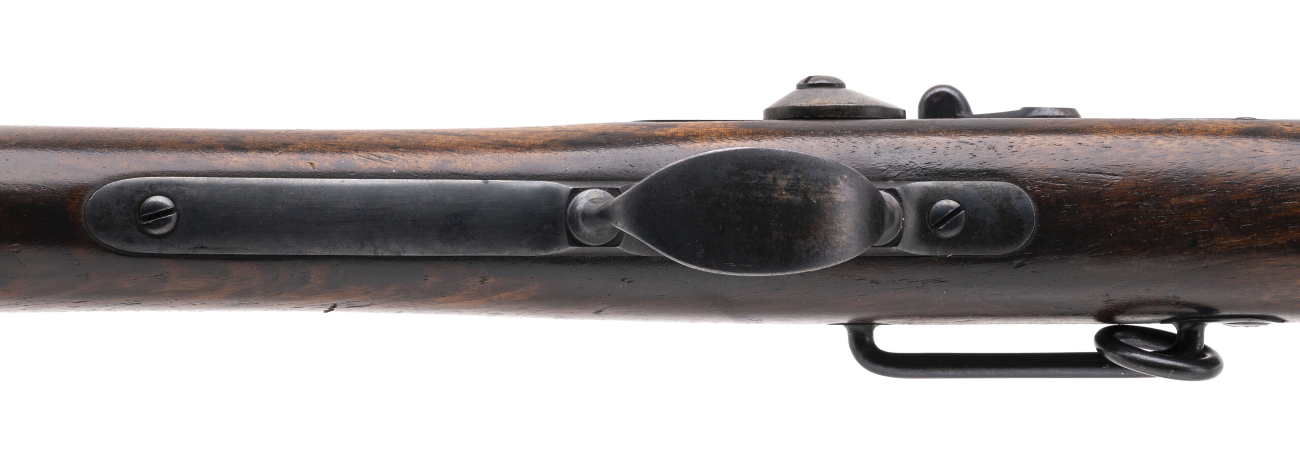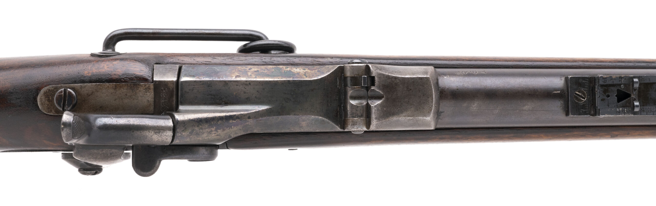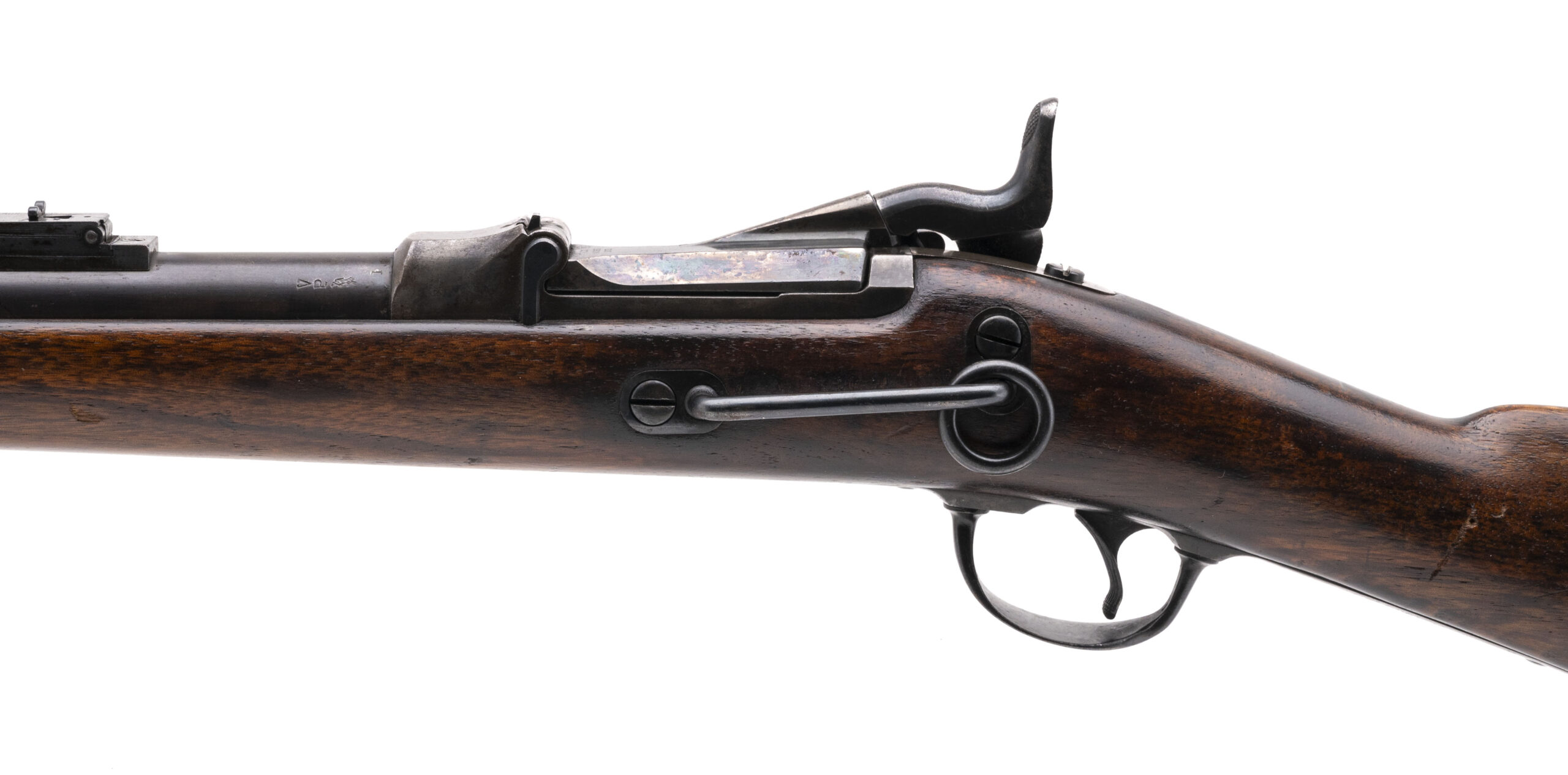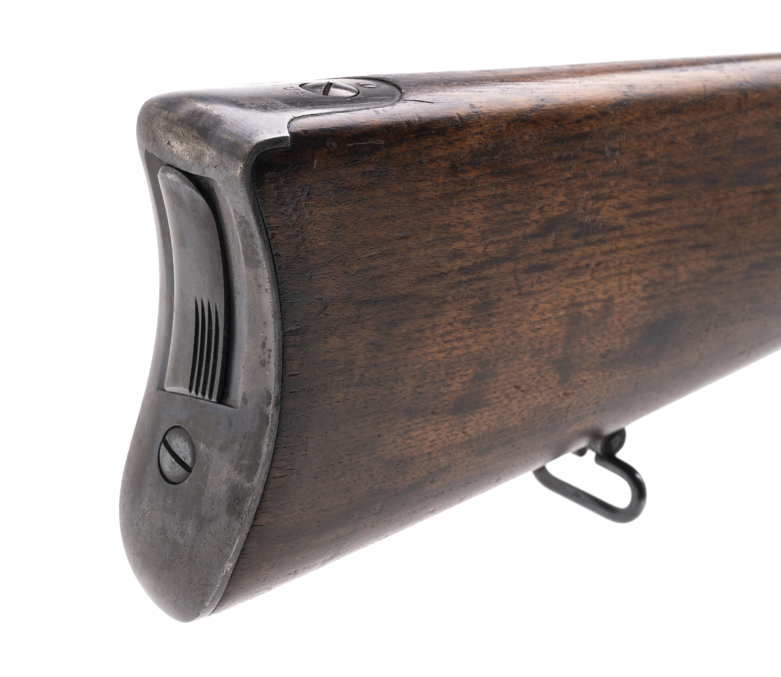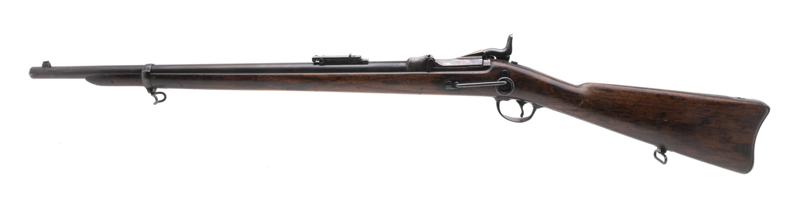 Serial No. 334358, made circa 1886, .45-70, 24” round barrel. Bore is bright and shiny with strong rifling visible. One of only 1000 trial rifles developed for the cavalry during the Indian wars. Barrel has an even brown patina with traces of case coloring visible on the breech. Buffington rear sight has the correct “XC” stamp visible. Stock is very good with a light coat of linseed oil applied. Mechanics function correctly.