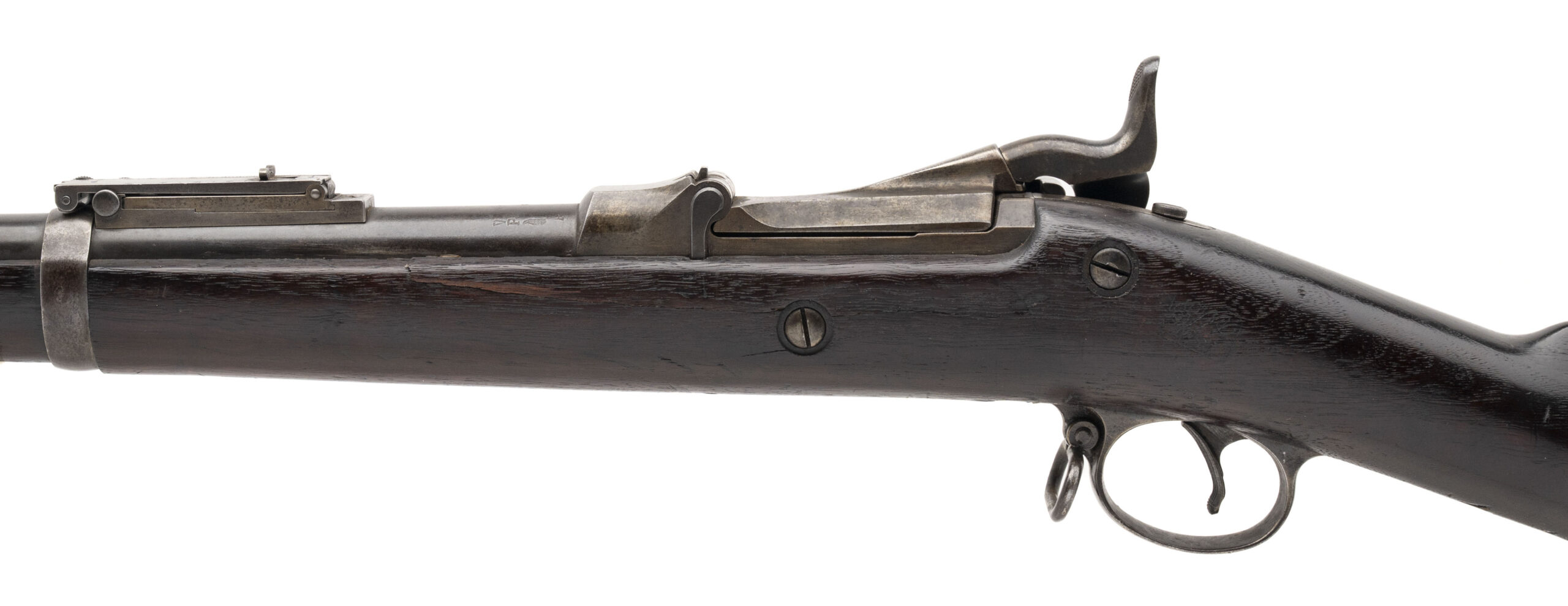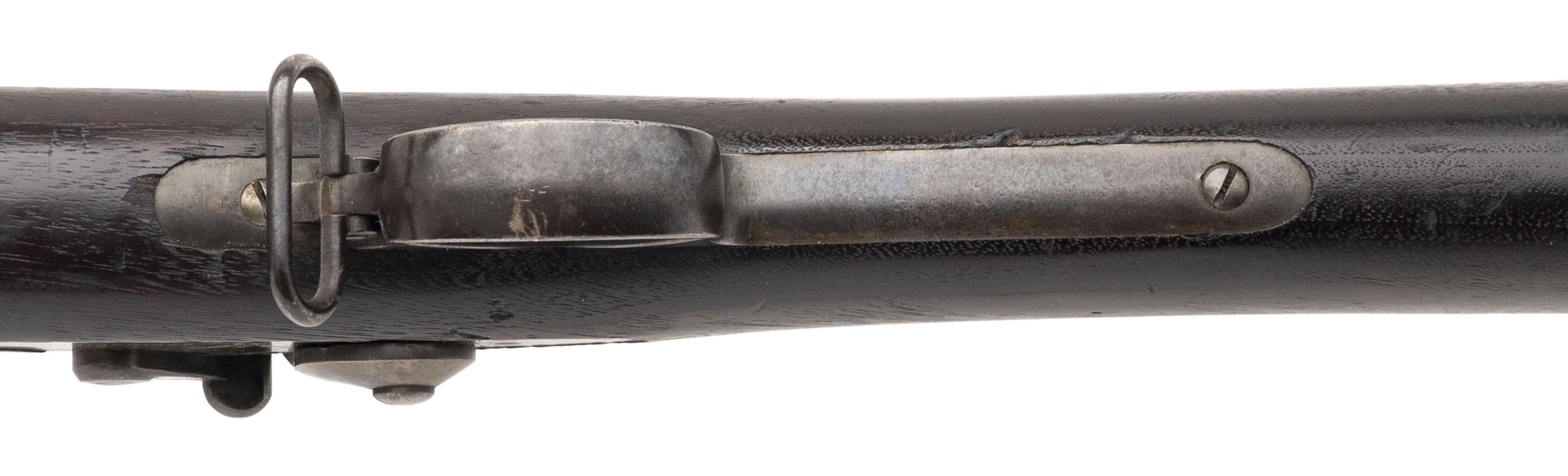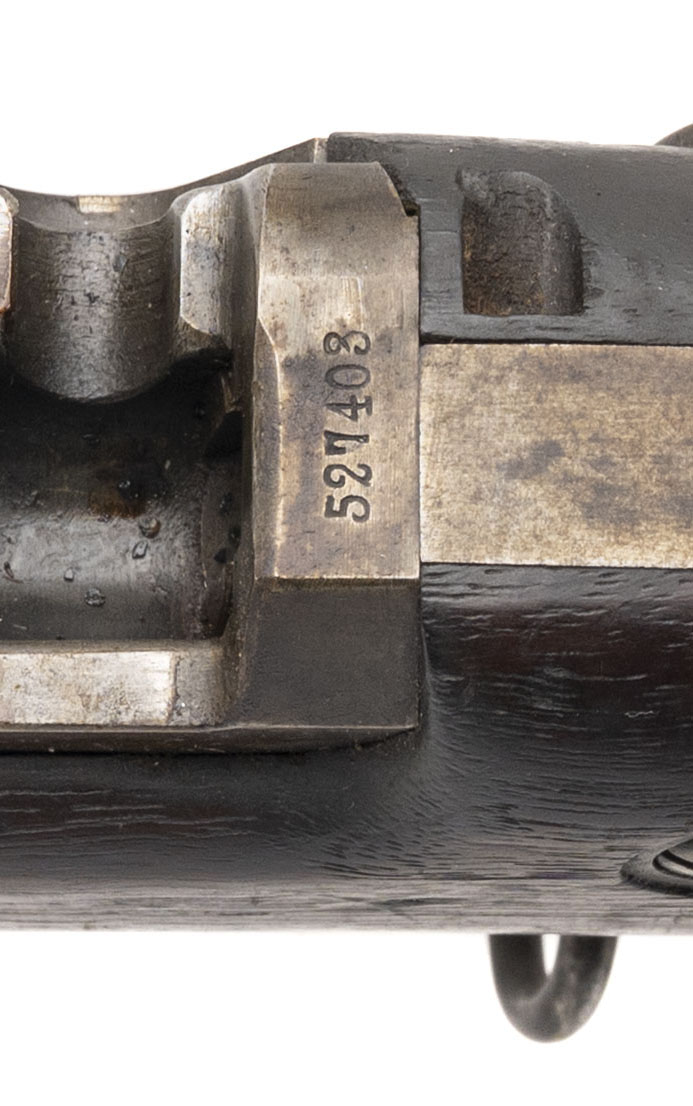 Serial No. 527403, manufactured in 1891. Chambered in .45-70 Government, featuring a 32 ½” round barrel. This example retains a smooth grey-brown patina on the barrel, with the breech and lock plate exhibiting a lighter grey finish. Factory markings on the barrel, breech, and lock plate remain crisp and legible. The stock is in very good condition, showing light handling marks and a sharp 1891-dated cartouche on the left wrist. Mechanically, the rifle is sound. The hammer locks securely at full cock, though the second click is soft when drawn back. Equipped with the distinctive integral ramrod bayonet, this Model 1888 represents the final iteration of the Springfield trapdoor series.
