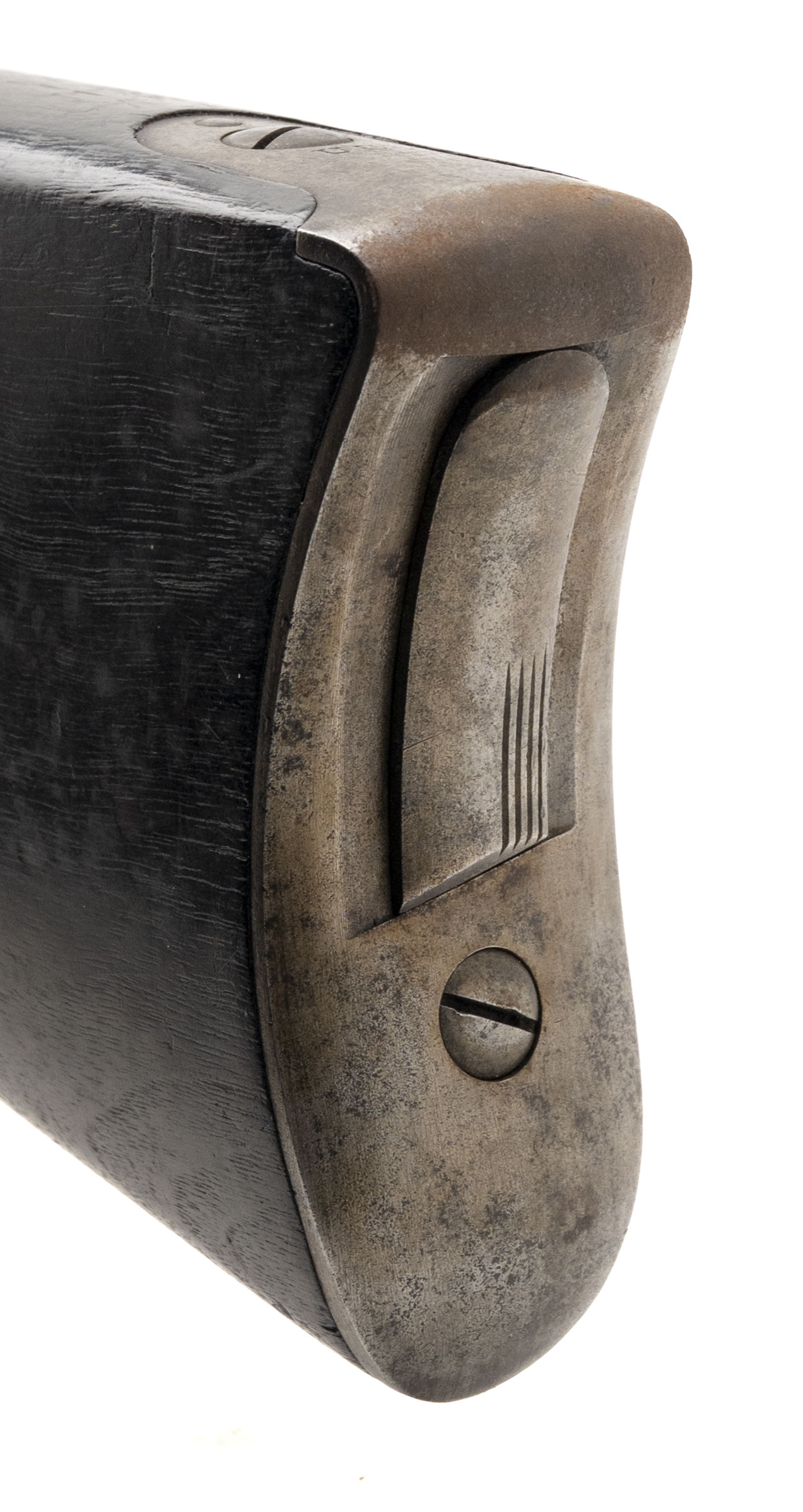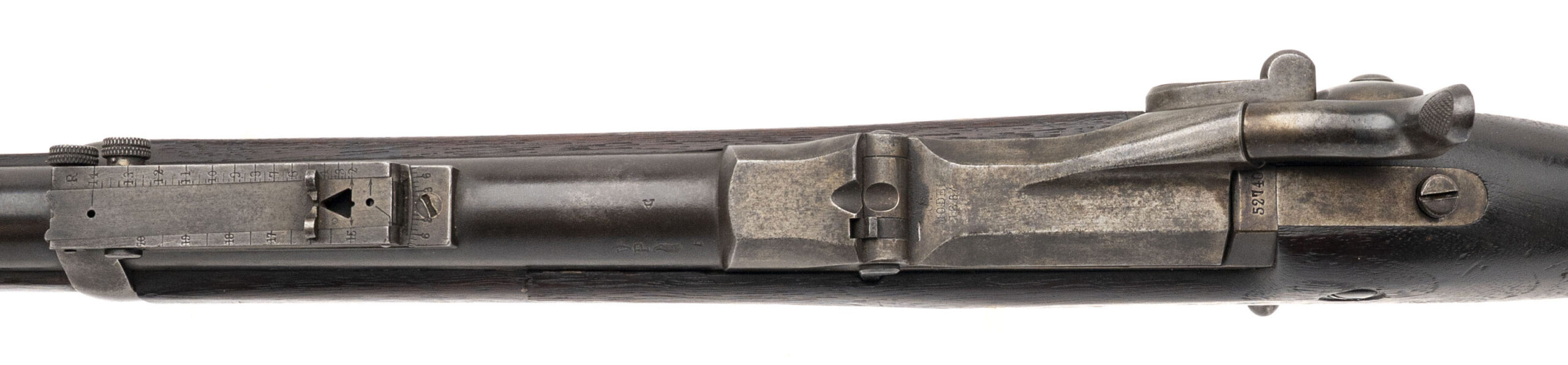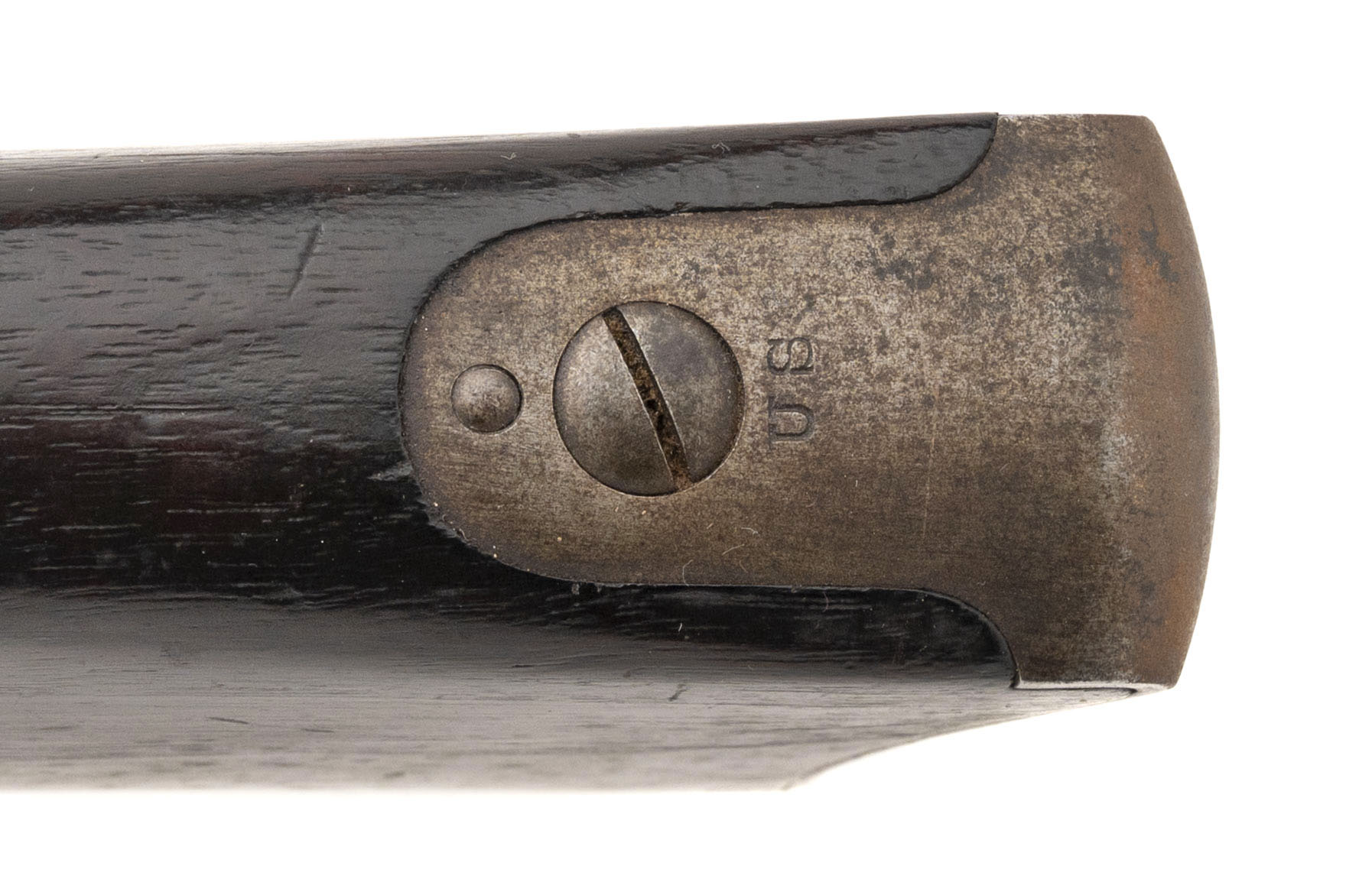 Serial No. 527403, manufactured in 1891. Chambered in .45-70 Government, featuring a 32 ½” round barrel. This example retains a smooth grey-brown patina on the barrel, with the breech and lock plate exhibiting a lighter grey finish. Factory markings on the barrel, breech, and lock plate remain crisp and legible. The stock is in very good condition, showing light handling marks and a sharp 1891-dated cartouche on the left wrist. Mechanically, the rifle is sound. The hammer locks securely at full cock, though the second click is soft when drawn back. Equipped with the distinctive integral ramrod bayonet, this Model 1888 represents the final iteration of the Springfield trapdoor series.