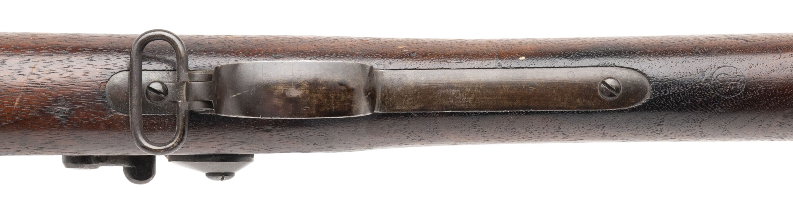 Serial No. 512004, manufactured in 1891, chambered in .45-70 Government, with a 32 ½” round barrel. This rifle exhibits a smooth and even brown/grey patina across all metal components, with strong factory markings clearly visible on the breech and lock plate. The stock is in good condition, showing light, expected handling marks, and retains a sharp 1891 cartouche on the left wrist. Mechanically, the action is tight and functions correctly. The rifle features the distinctive integral ramrod bayonet, unique to the Model 1888—the final evolution of the U.S. trapdoor rifle series that served through the Indian Wars and into the Spanish-American War era. A solid and honest example of a late-production Trapdoor