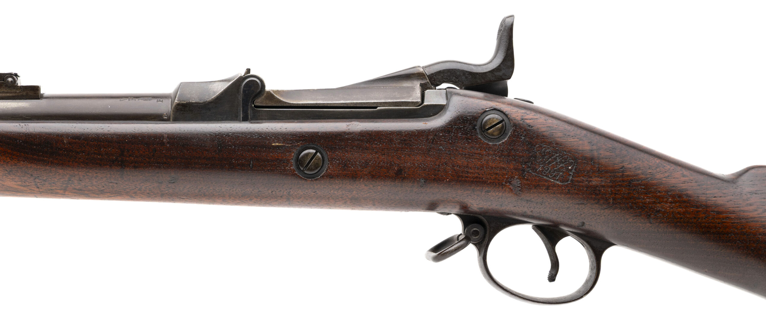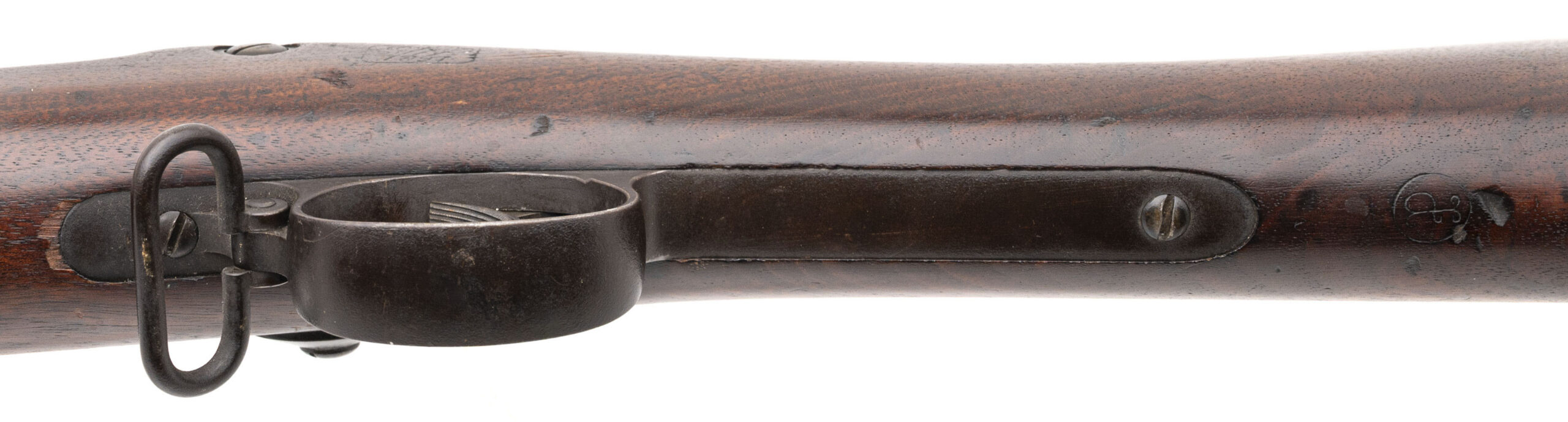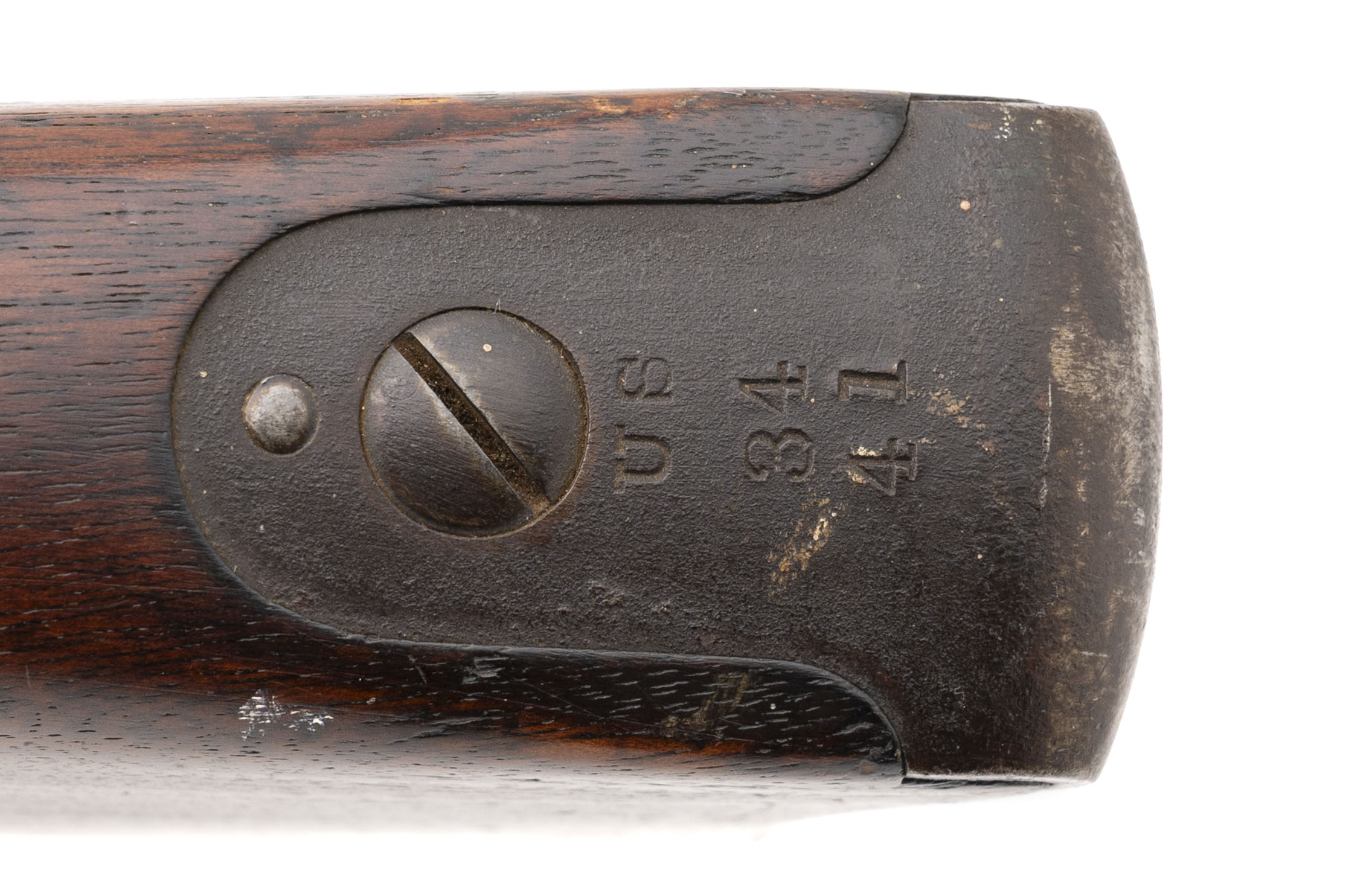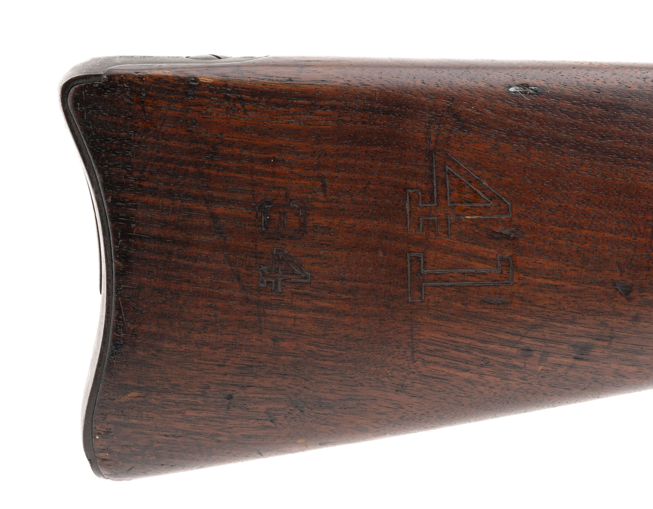 Serial No. 514583, manufactured in 1890, chambered in .45-70 Government with a 32.5" round barrel. The bore is excellent, retaining a bright mirror finish with strong rifling. The barrel has aged to a smooth brown patina, while factory markings on the breech and lock plate remain sharp and clearly defined. The stock is in very good condition and displays a handsome 1891-dated cartouche. The right side of the stock is marked “41/34,” adding to its period character. Overall presentation is clean and well preserved for a late Trapdoor Springfield. Action functions correctly.