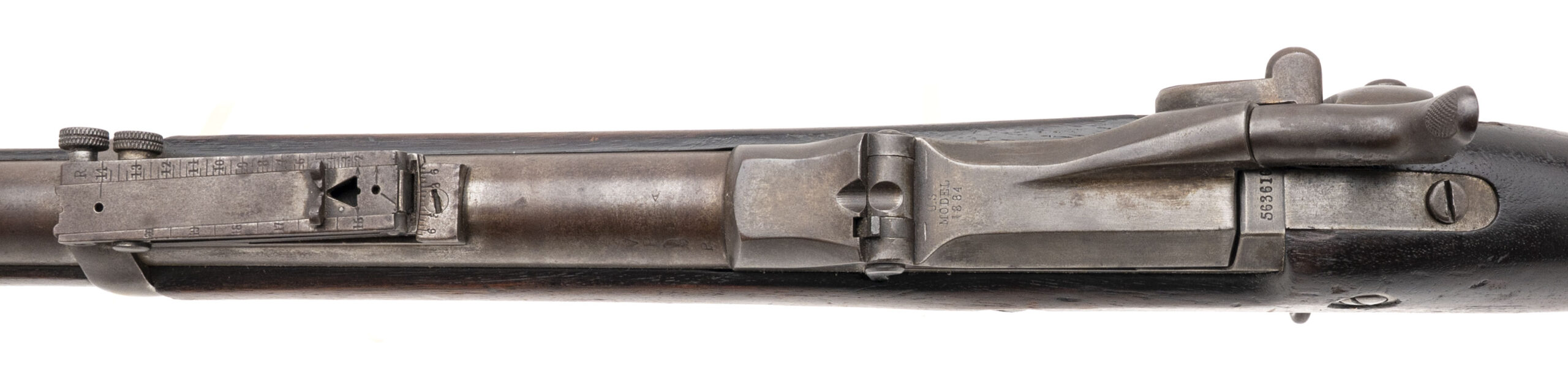 Serial No. 563616, manufactured circa January–March 1893, chambered in .45-70 with a 32 ½” round barrel. Bore is bright with strong rifling, showing light frosting in scattered areas. Metal has aged to a smooth brown/grey patina; factory markings on the breech and lock plate remain sharp and legible. Stock shows typical nicks, dings, and handling marks from service use, with a clear and attractive cartouche visible on the left side. Action is tight and functions correctly. A solid and representative example of a Spanish-American War era reserve rifle.