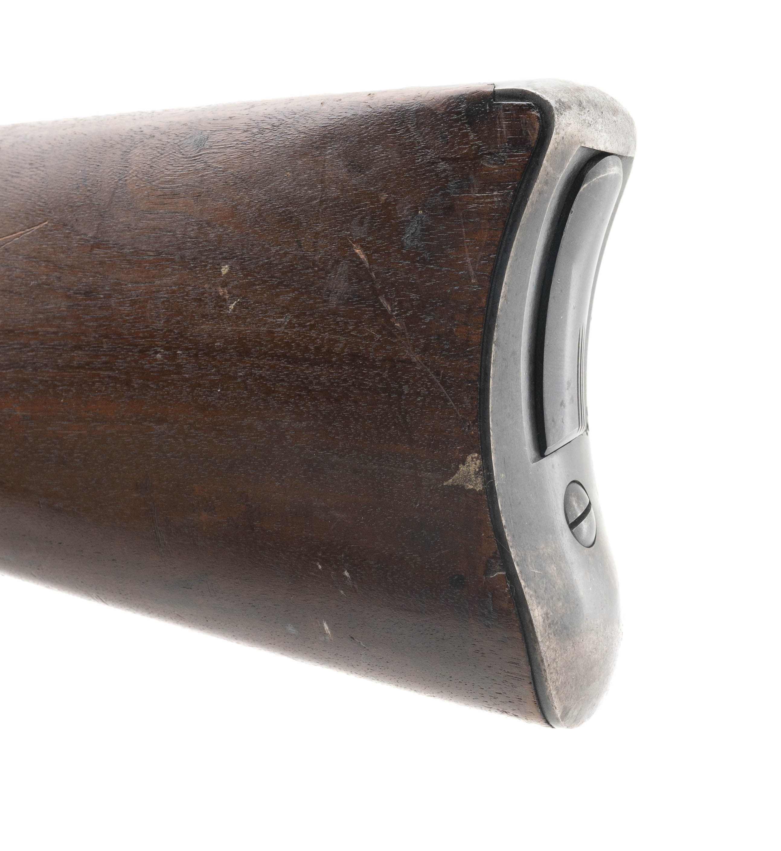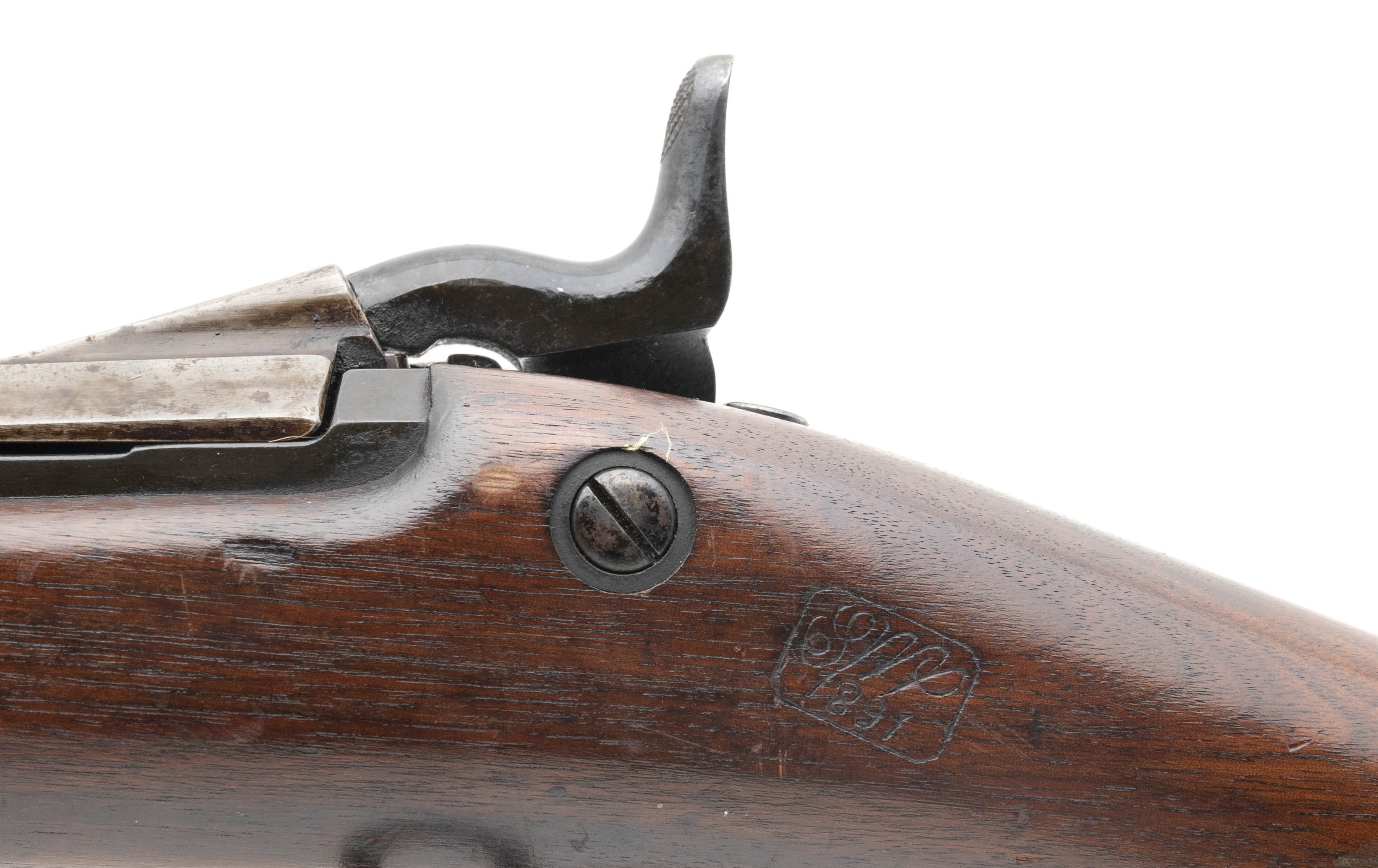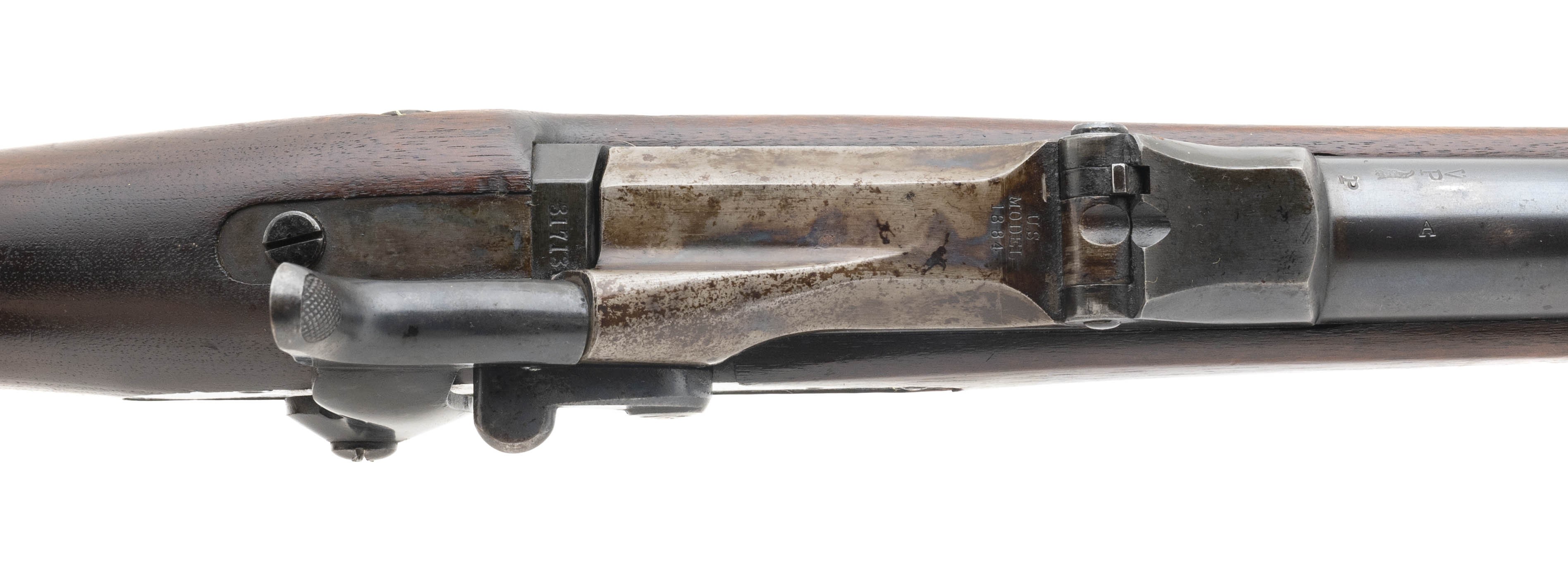 Serial No. 317131, 45-70, 32 5/8" round barrel circa 1884 upgraded with 1888 improvements with 93-95% original blue with some thinning noted on the trigger guard. Traces of case coloring are noted on the breech block, Wood shows usage and handling wear with a crips cartouche dated 1891. The Springfield Research Service states this rifle was issued to Company I of the 11th Infantry in October of 1889, this was a company of mostly Apache stationed in the Arizona territory.