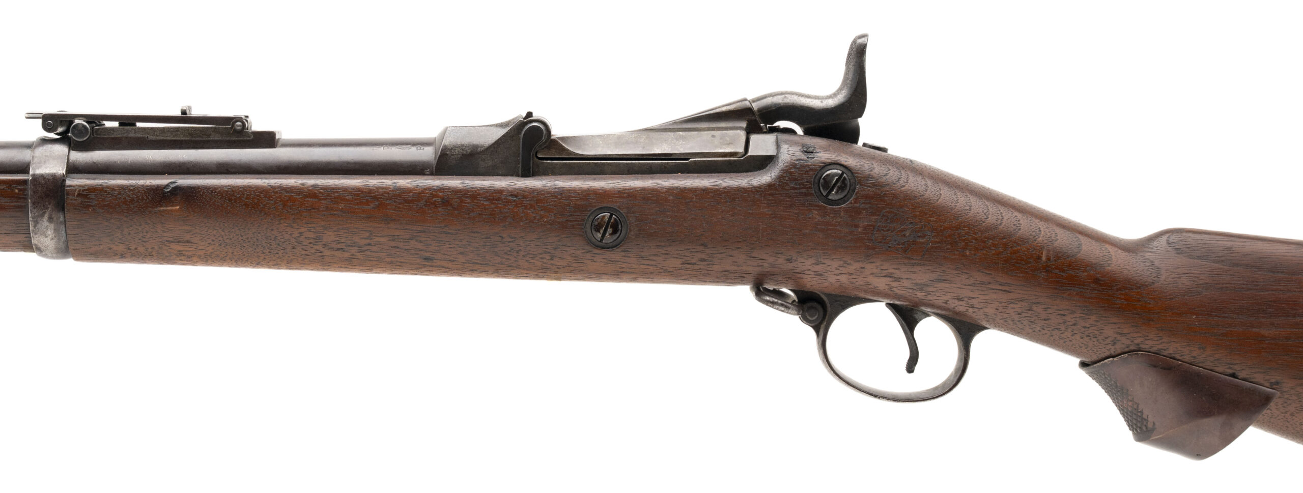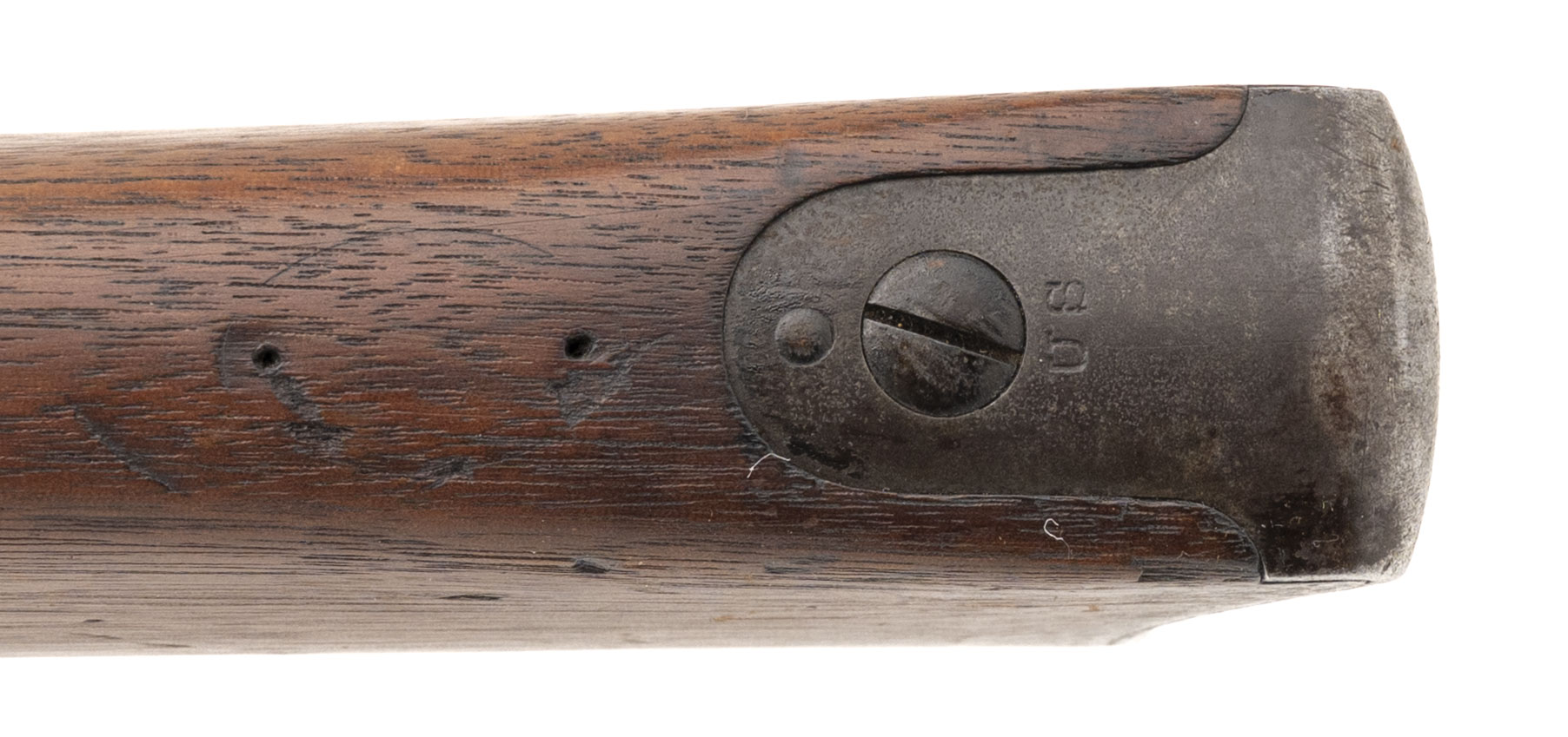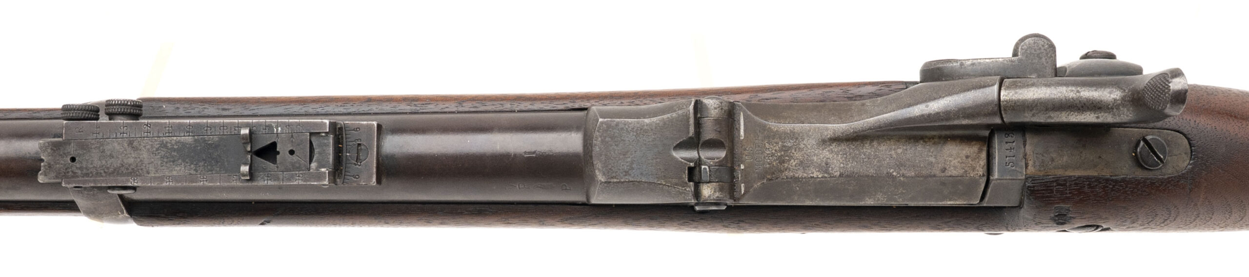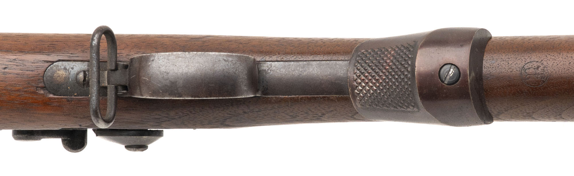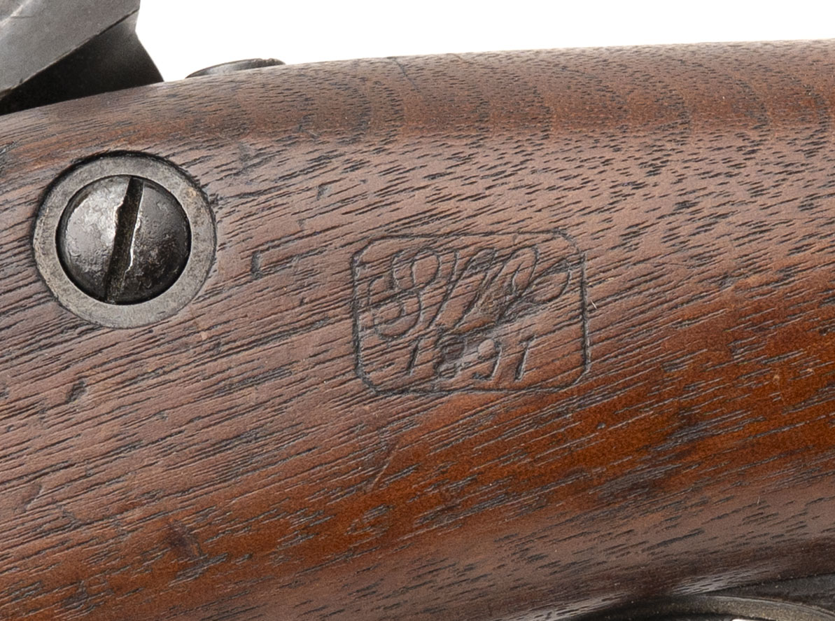 Serial No. 514133, manufactured in 1891, chambered in .45-70 Government, with a 32 ½” round barrel. This rifle features the final iteration of the Springfield “trapdoor” series, incorporating the distinctive integral ramrod bayonet—a dual-purpose design aimed at simplifying field gear for infantry troops. The barrel has developed a smooth brown patina from age, while the breech and lock plate retain traces of original blue with vibrant case coloring visible within the breech. The rifle is equipped with a detachable pistol grip and original front sight protector. The walnut stock remains in very good condition, bearing a crisp 1891 inspection cartouche on the left wrist. Action is mechanically sound and functions correctly. This is a well-preserved example of a transitional U.S. military rifle that bridged the gap between single-shot arms and the advent of repeating service rifles.