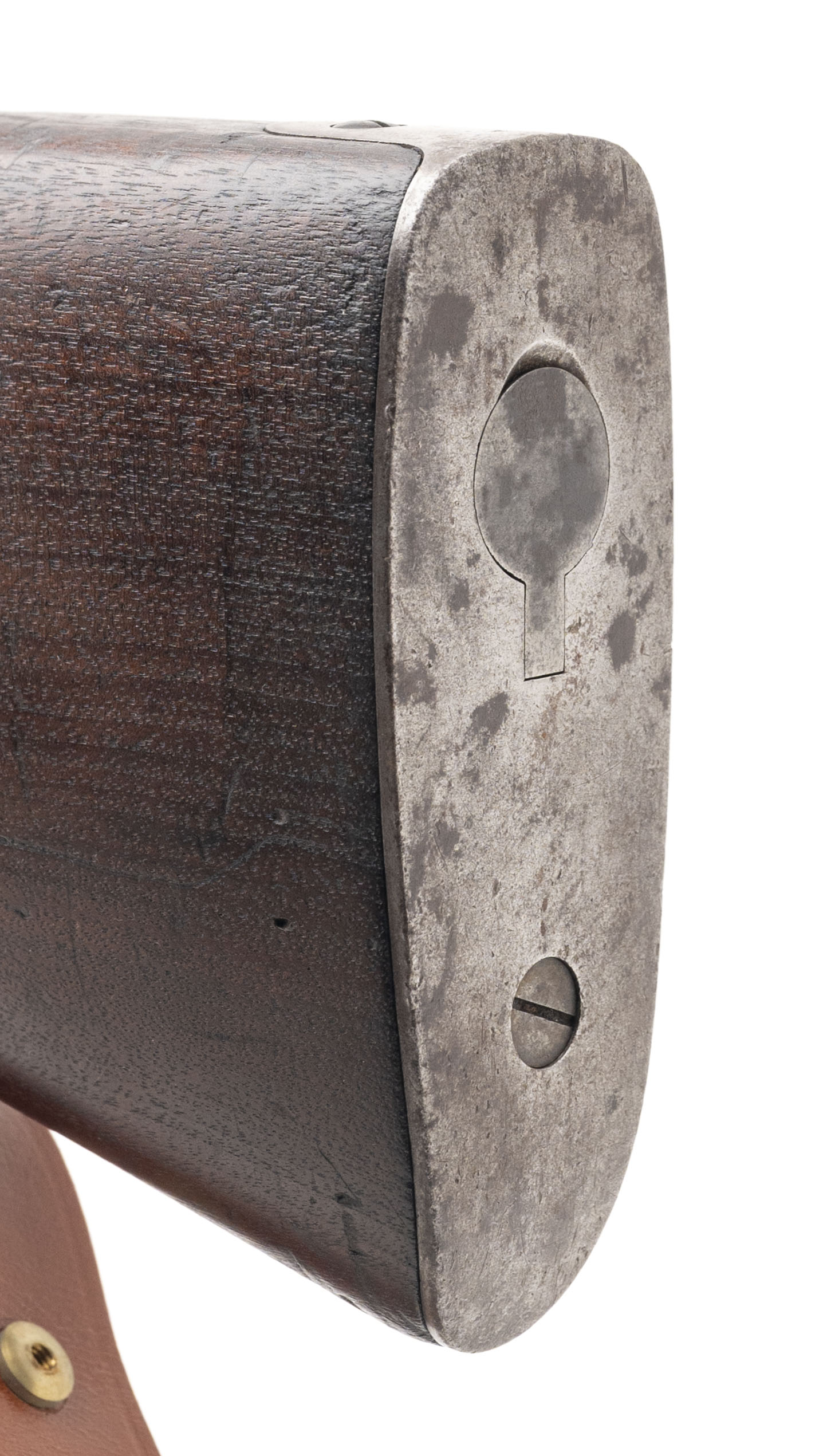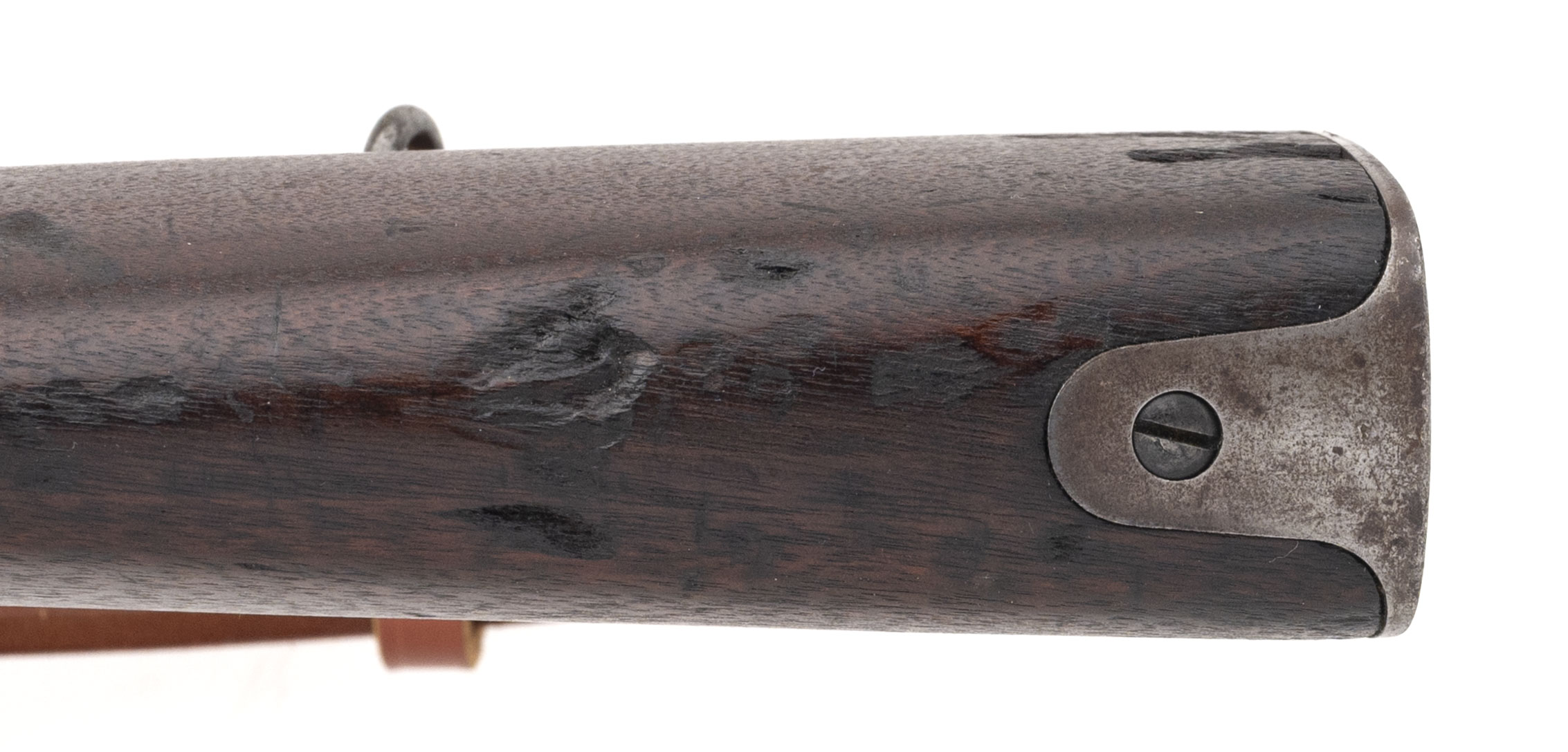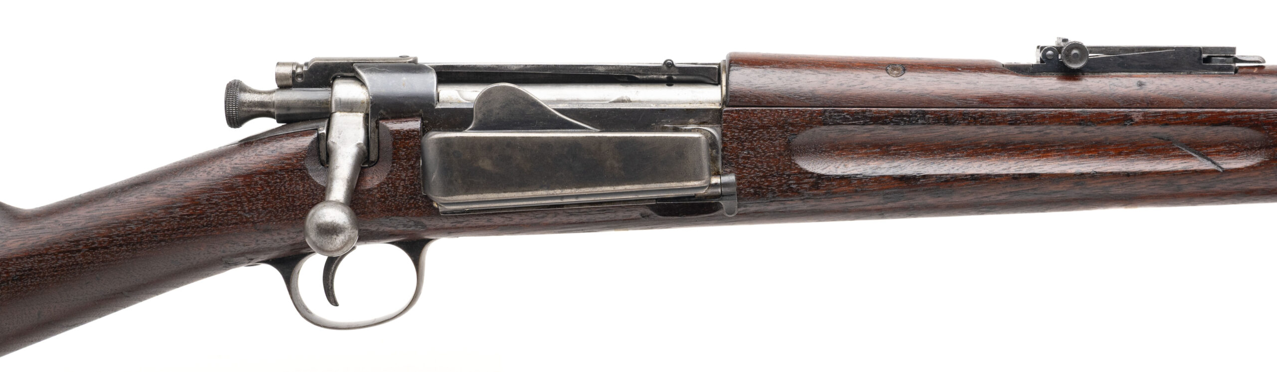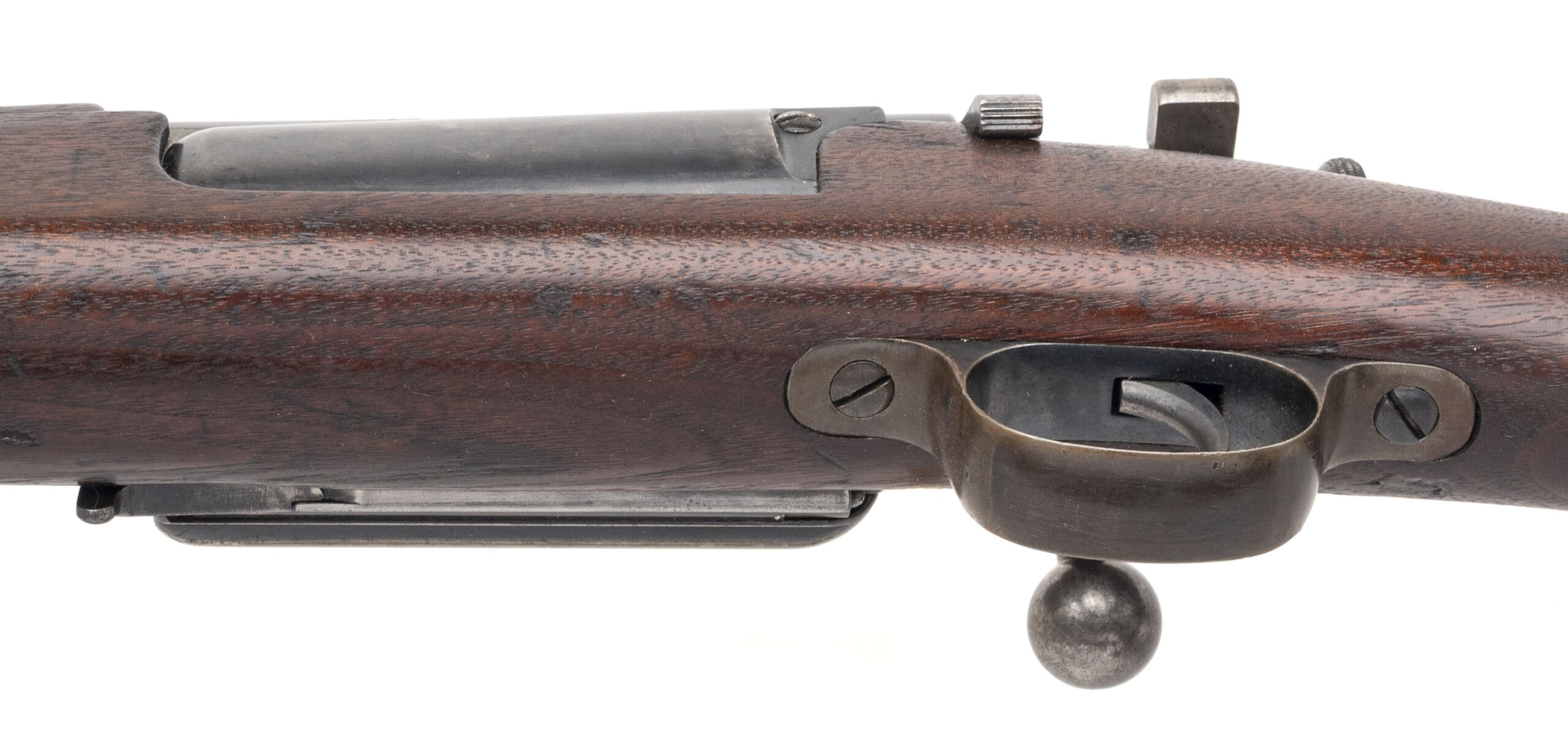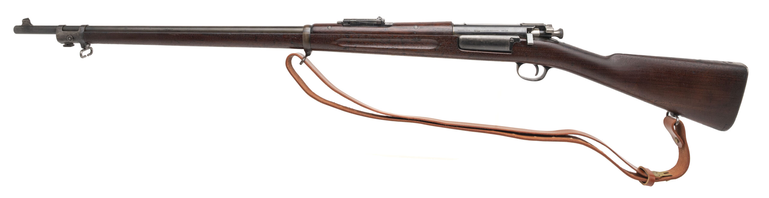 Serial No. 58013, manufactured in 1897, chambered in .30-40 Krag with a 30" round barrel. The bore is bright and shiny with strong rifling. The barrel’s bluing has mellowed to a smooth brown/grey patina, with traces of original blue remaining in protected areas. Receiver markings remain strong and legible, showing a scattered patina intermingled with areas of original blue. The stock is very good overall, displaying expected handling and usage marks from age and service, with a faint cartouche outline still visible. Action is smooth and functions correctly. A well-preserved and honest example of a late 19th-century U.S. Krag rifle.