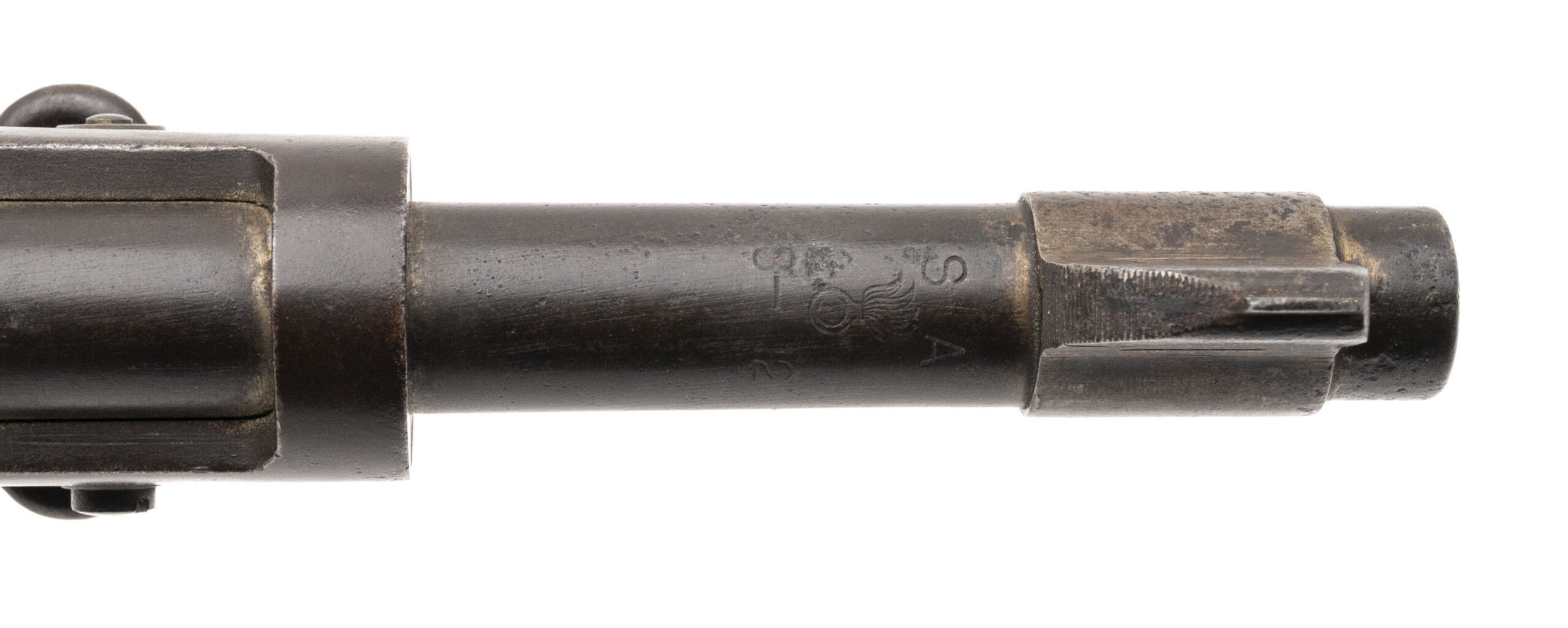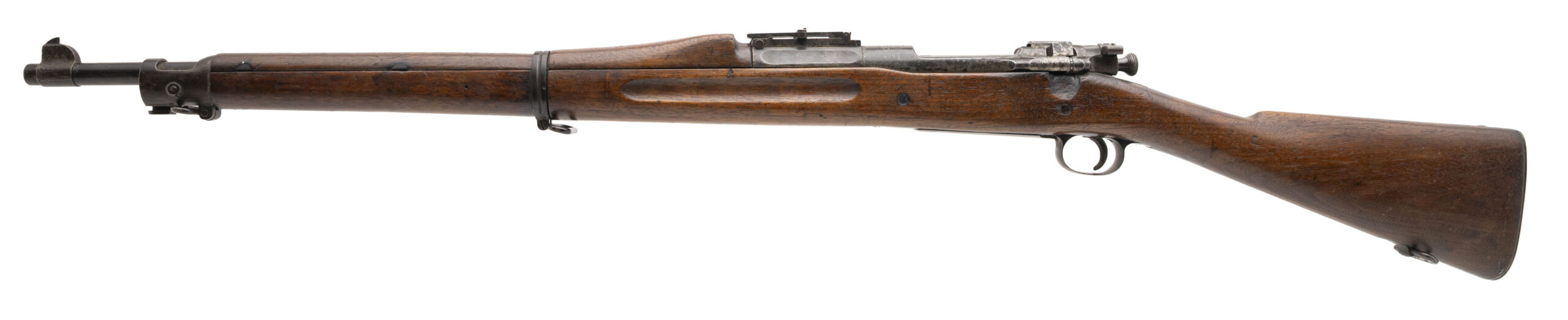 Serial No. 506716, manufactured in 1912, chambered in .30-06 with a 24" round barrel marked “S.A. / Flaming Bomb / 5-12.” The bore is good, showing frosting in the grooves while retaining strong rifling. Metal surfaces have thinned to a mottled grey patina on the receiver, consistent with age and service. The stock shows expected handling wear and impressions, with a faint G.H.D. cartouche still visible. Overall presentation is honest and representative of an early Springfield service rifle. Action is smooth and functions correctly.