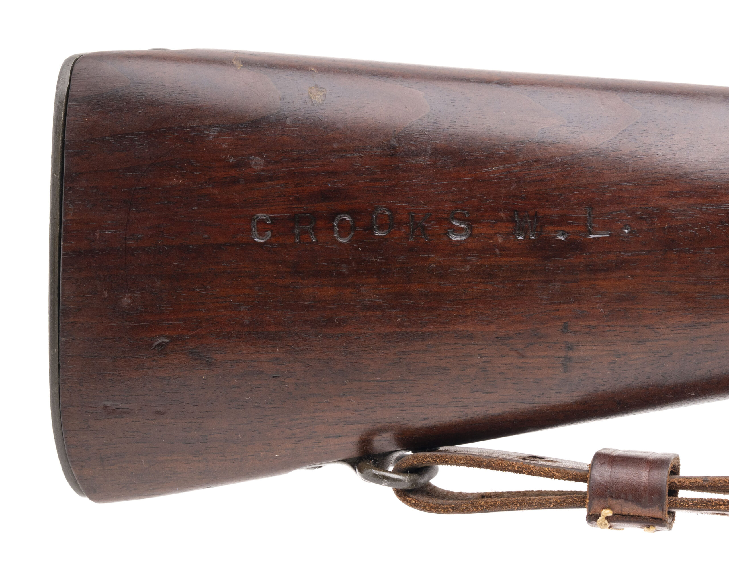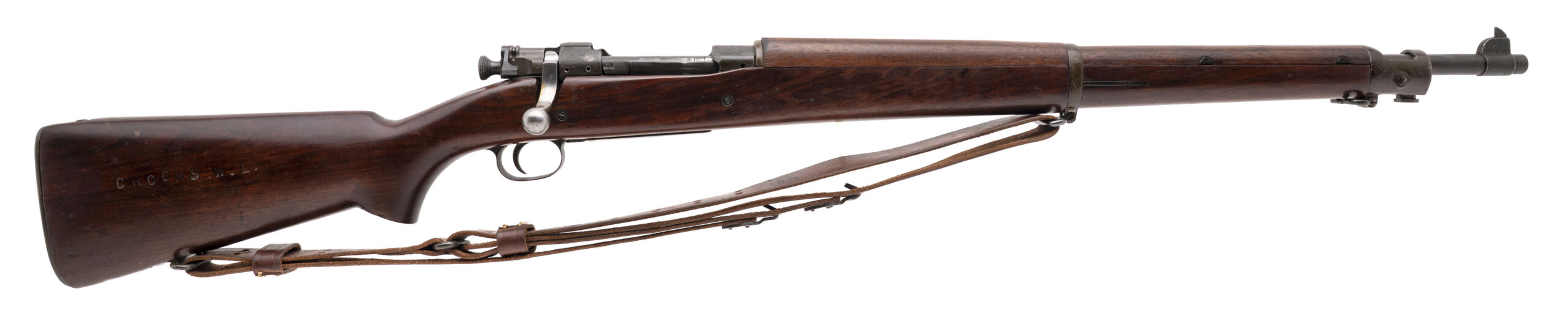Serial No. 989150, made in 1918, .30-06, 24” round barrel marked “RA/Flaming Bomb/8-43”. Bore is bright and shiny with strong rifling noted. Receiver has been drilled and tapped for a scope Stock is very good with minimal wear noted. The name “CROOKS W.L.” has been carved into the left side of the butt stock. Action is smooth and functions correctly. Consignment.