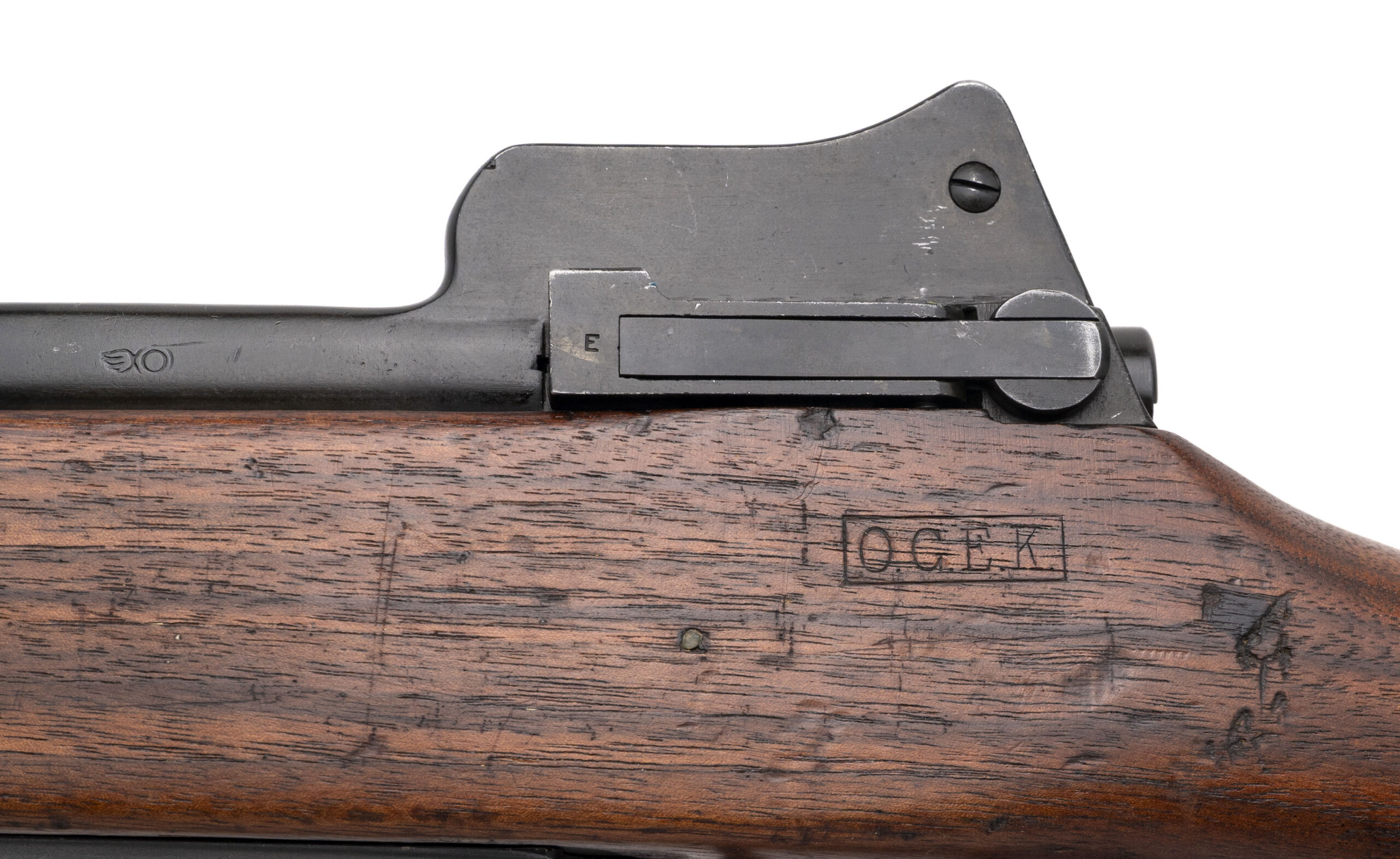 Serial no. 820796. Manufactured in July 1918 by Eddystone Rifle Plant, chambered in .30-06 Springfield,26" round barrel marked “E/Flaming Bomb/6-18.” The bore is bright and shiny with strong, well-defined rifling noted throughout. This rifle was refurbished for WWII service as indicated by the “OGEK” cartouche on the stock, reflecting arsenal inspection and reissue. The Model 1917 served as the primary U.S. service rifle during WWI and continued to see secondary use into WWII following refurbishment. The stock shows light handling impressions consistent with service use. Overall the rifle presents very well. The action is smooth, mechanically sound, and functions correctly.