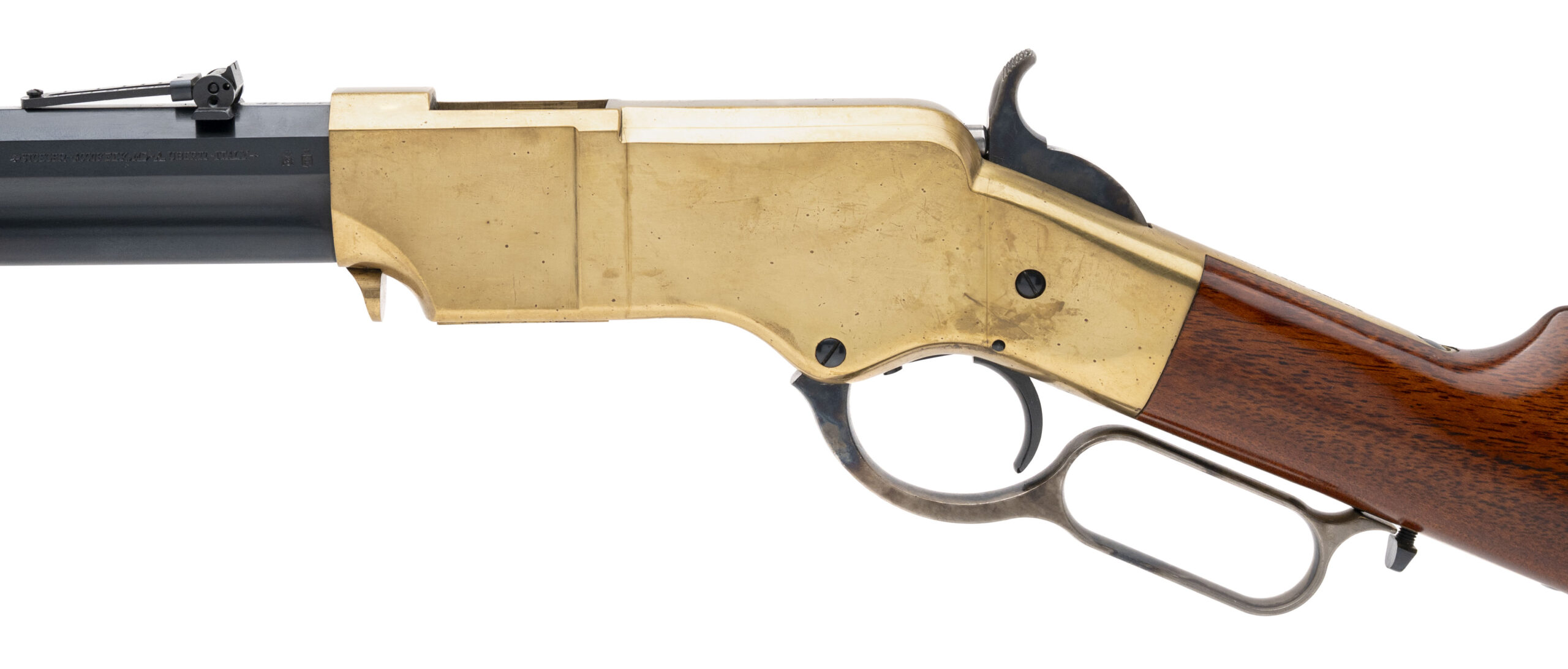 SN: W36676. Modern production, .45 Colt with a 18.5" octagon barrel. Bore is excellent. Italian made lever-action rifle with bladed front sight, adjustable rear sight, brass receiver w/case color hardened accents, blue finished barrel, and wood stock w/brass butt plate. Finish and stock show minor handling marks. Overall condition is very good.