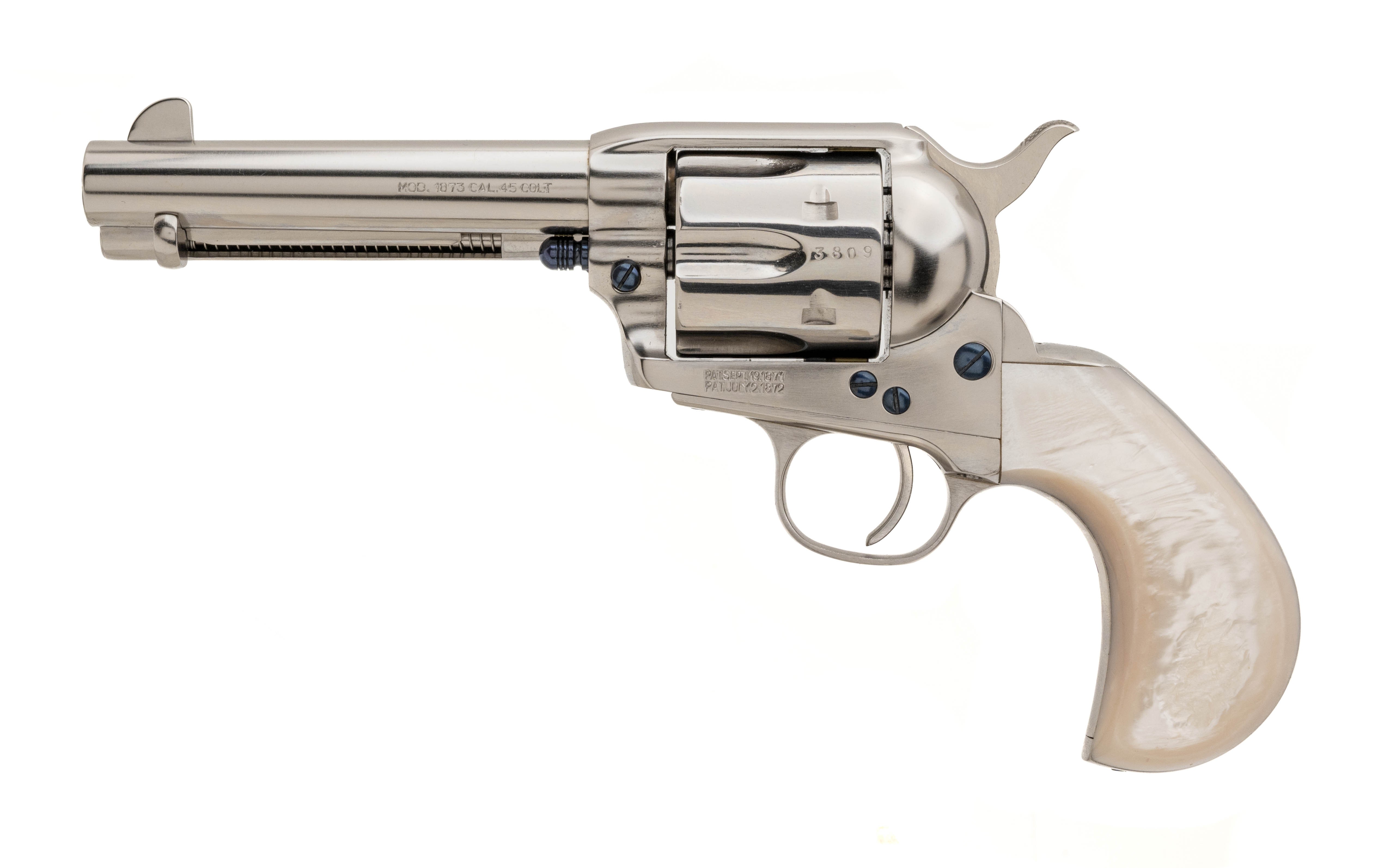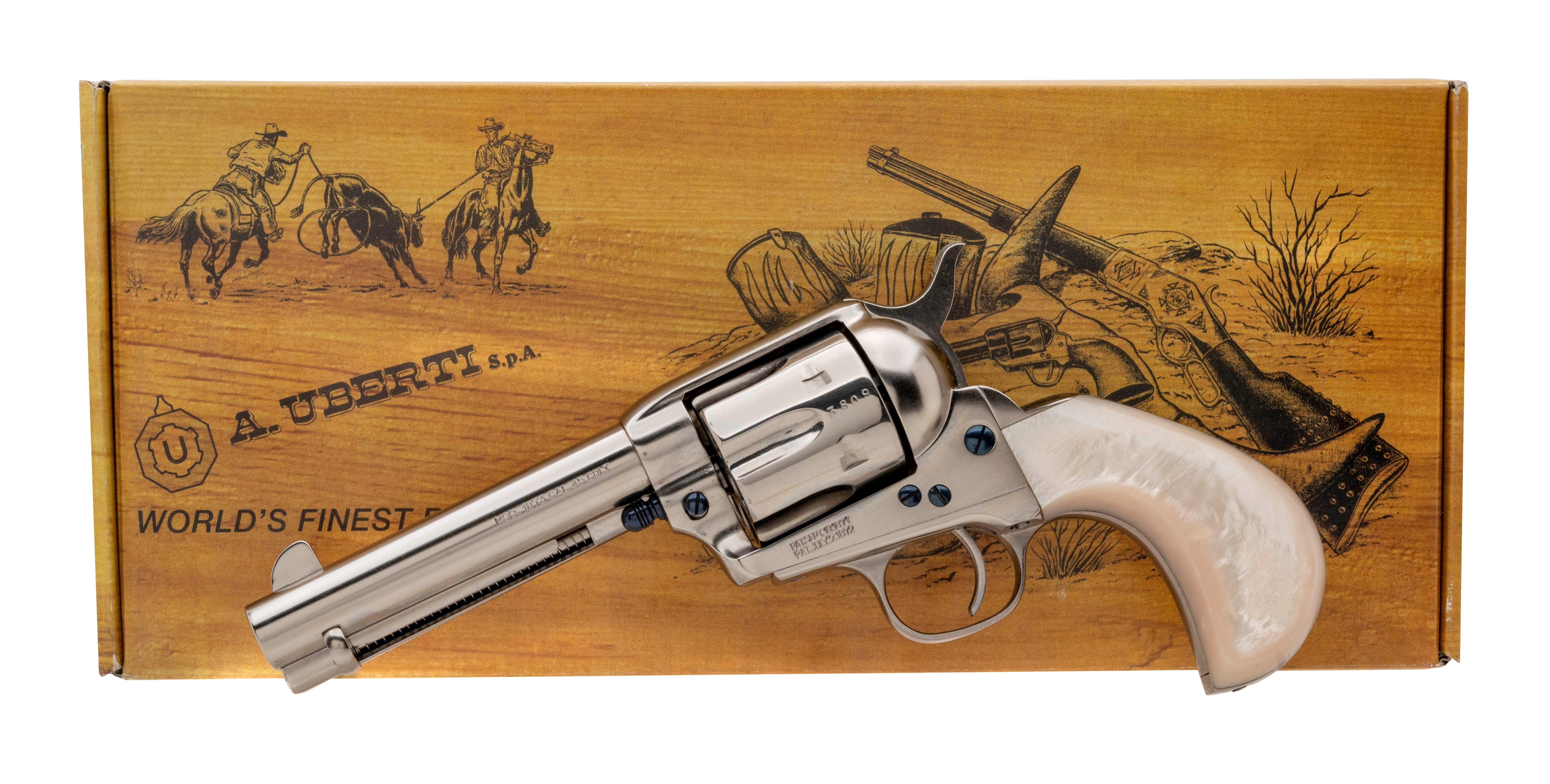 Single action Revolver with a 4.75" Barrel, chambered in .45 Long Colt with a nickel steel plated finish and pearl-style grips. NEW. UPC: 037084960180