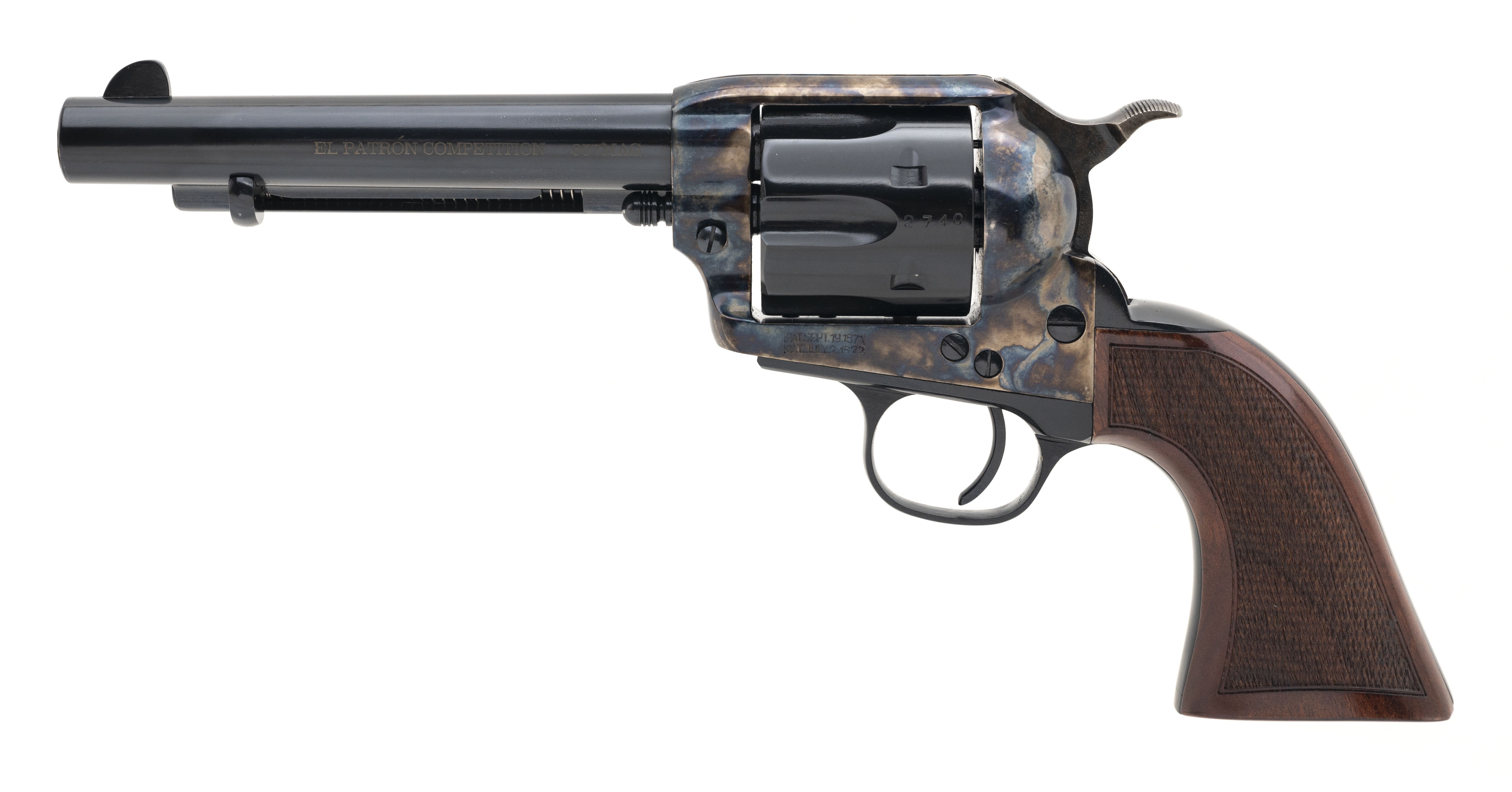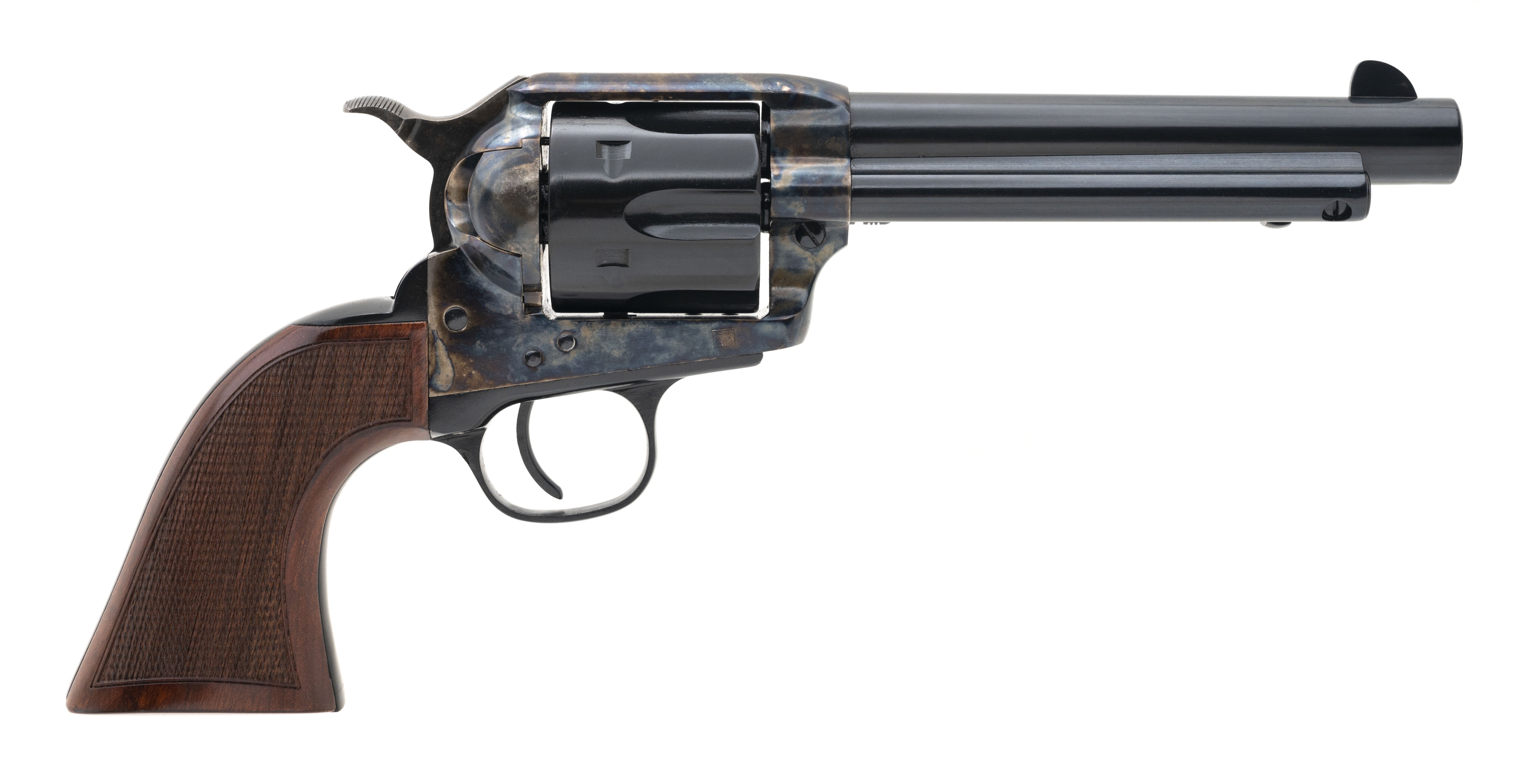 Modern production, .357 Magnum with a 5.5" barrel. Single action 6rd revolver with checkered grips and case colored receiver and hammer. NEW. UPC: 037084999241