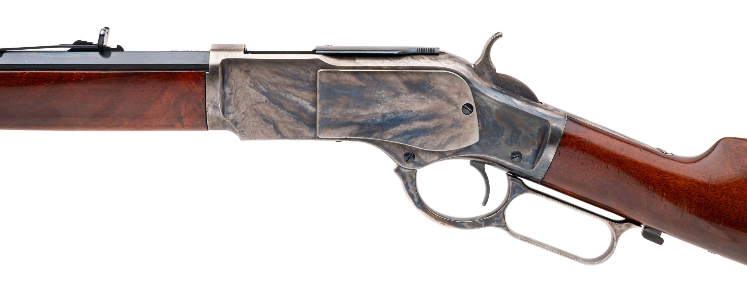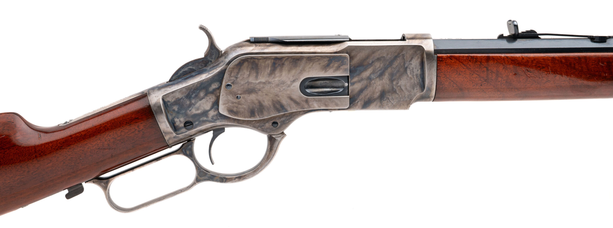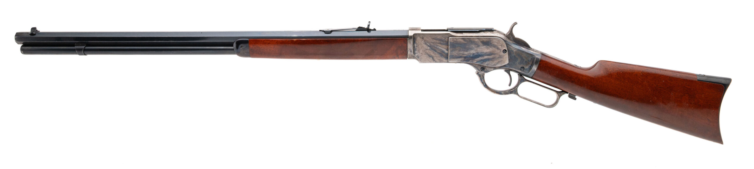 SN: 69882 modern production made in Italy. 45 colt lever action rifle with a 24" blued octagon barrel with front blade sight and semi-buckhorn rear sight. case hardened action with walnut furniture and curved steel butt plate. Some light handling marks, overall in very good condition with an excellent bore.