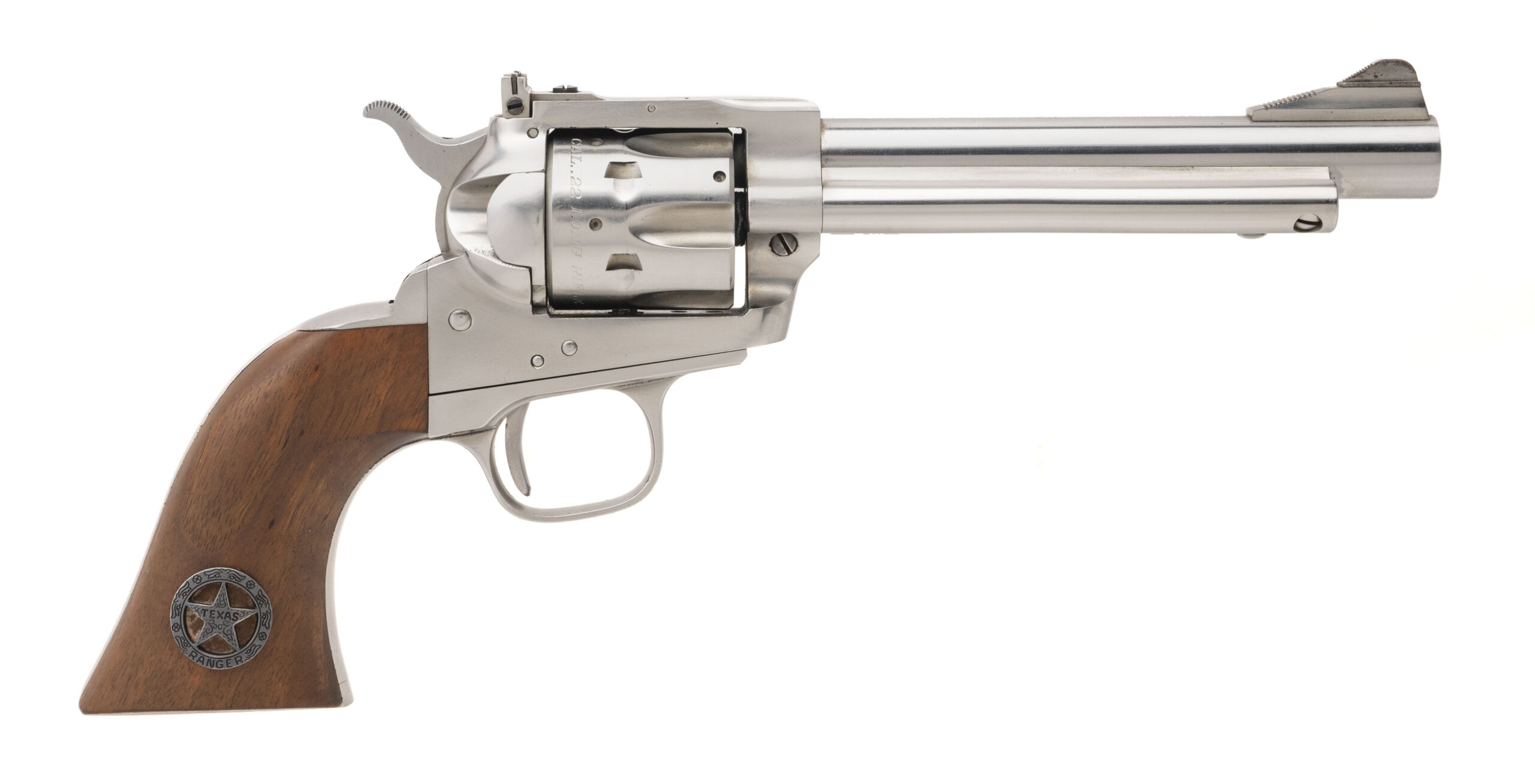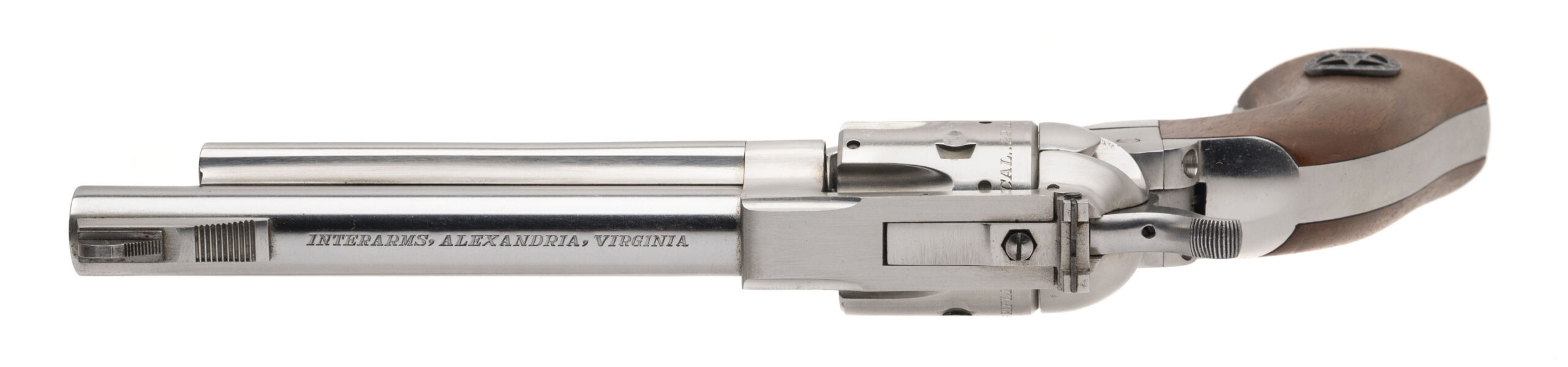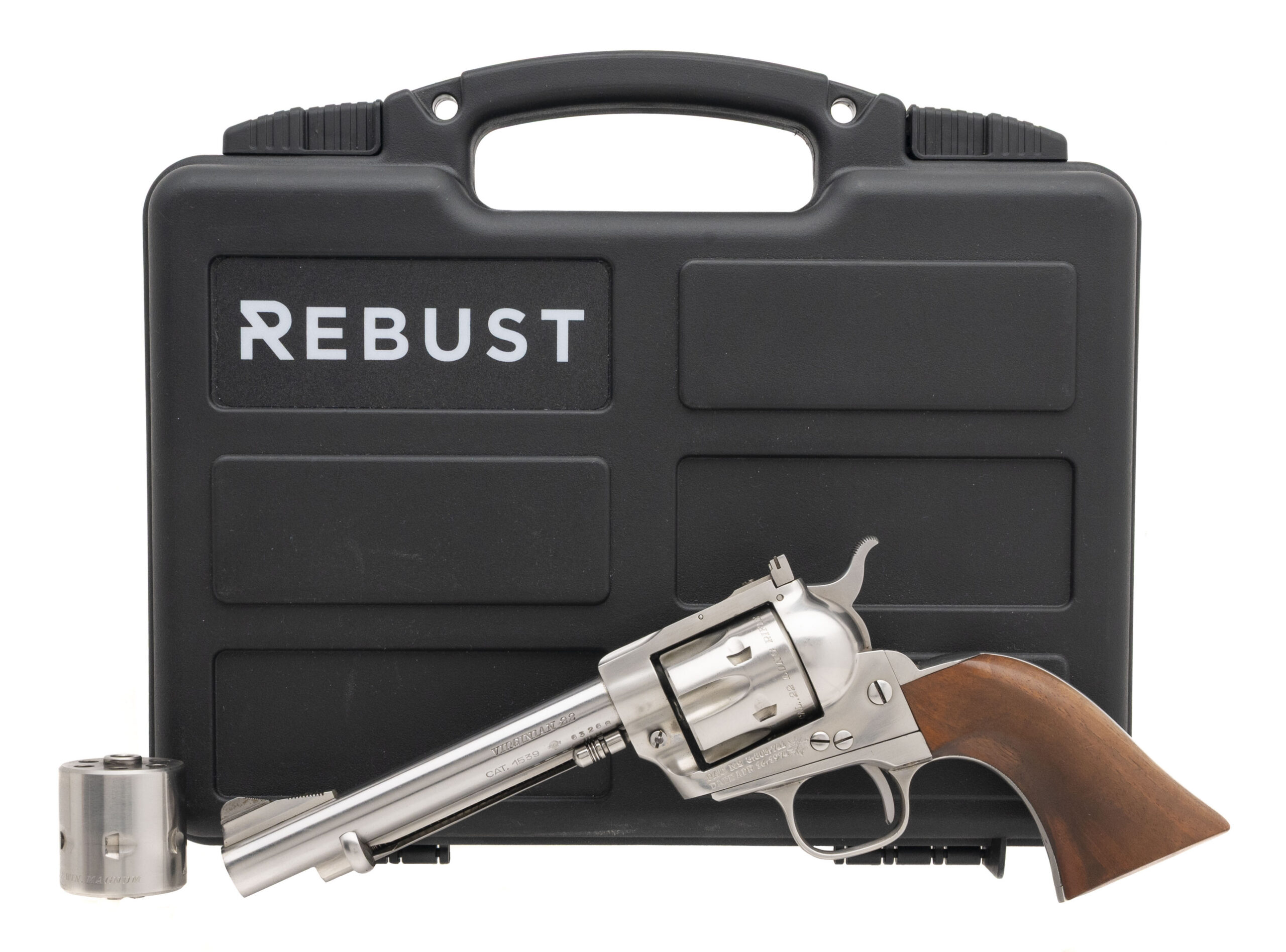 SN: 63268. 1980s vintage, .22LR with a 5.5" barrel. Bore is very good. Stainless steel frame single-action only rimfire revolver imported by Interarms with an adjustable rear sight, 6rd cylinder, and wood grips. Metal shows light marks throughout. Overall condition is very good. Includes an additional 6rd stainless steel .22 WMR cylinder which shows light marks, and a Rebust pistol case.