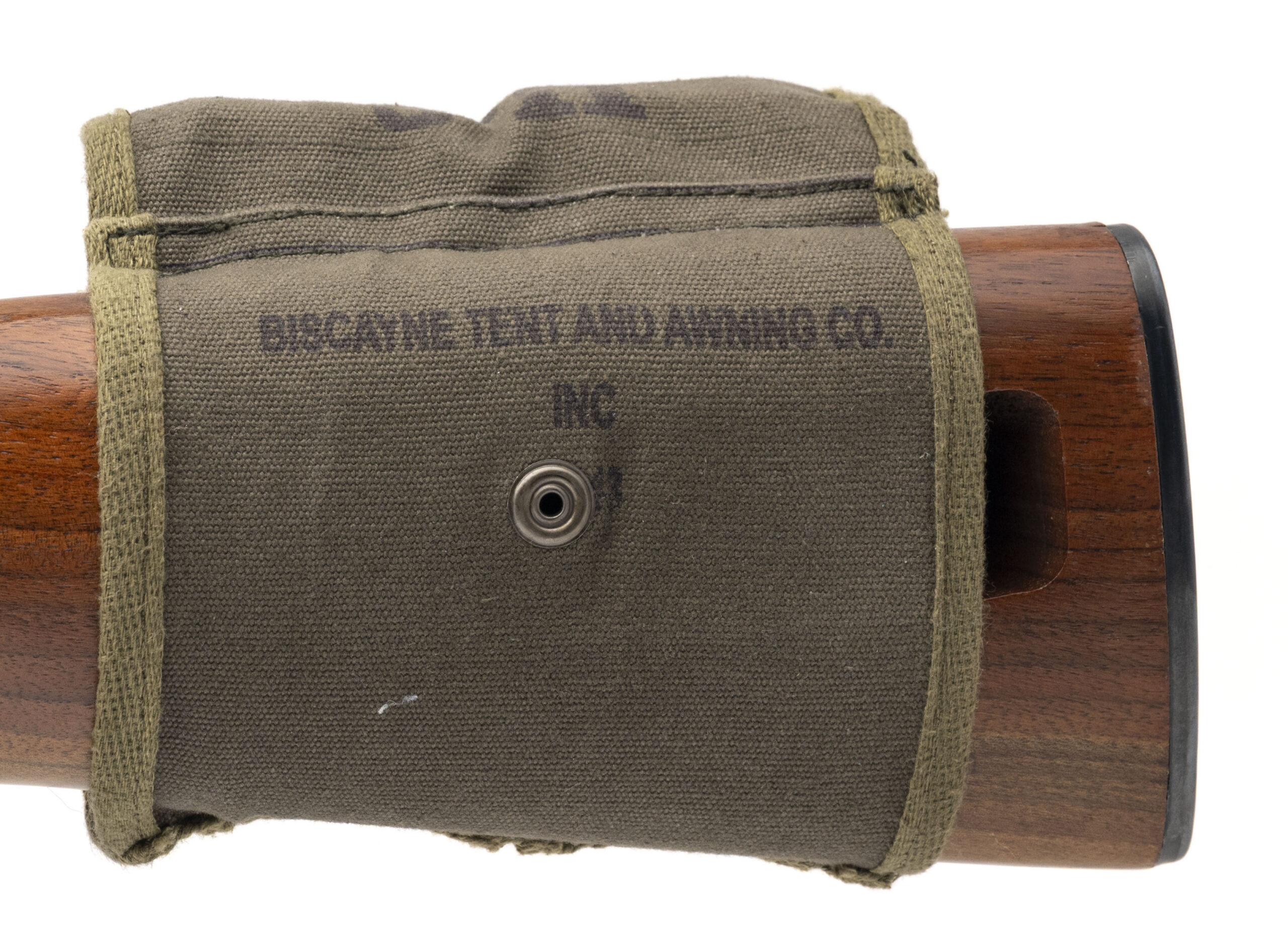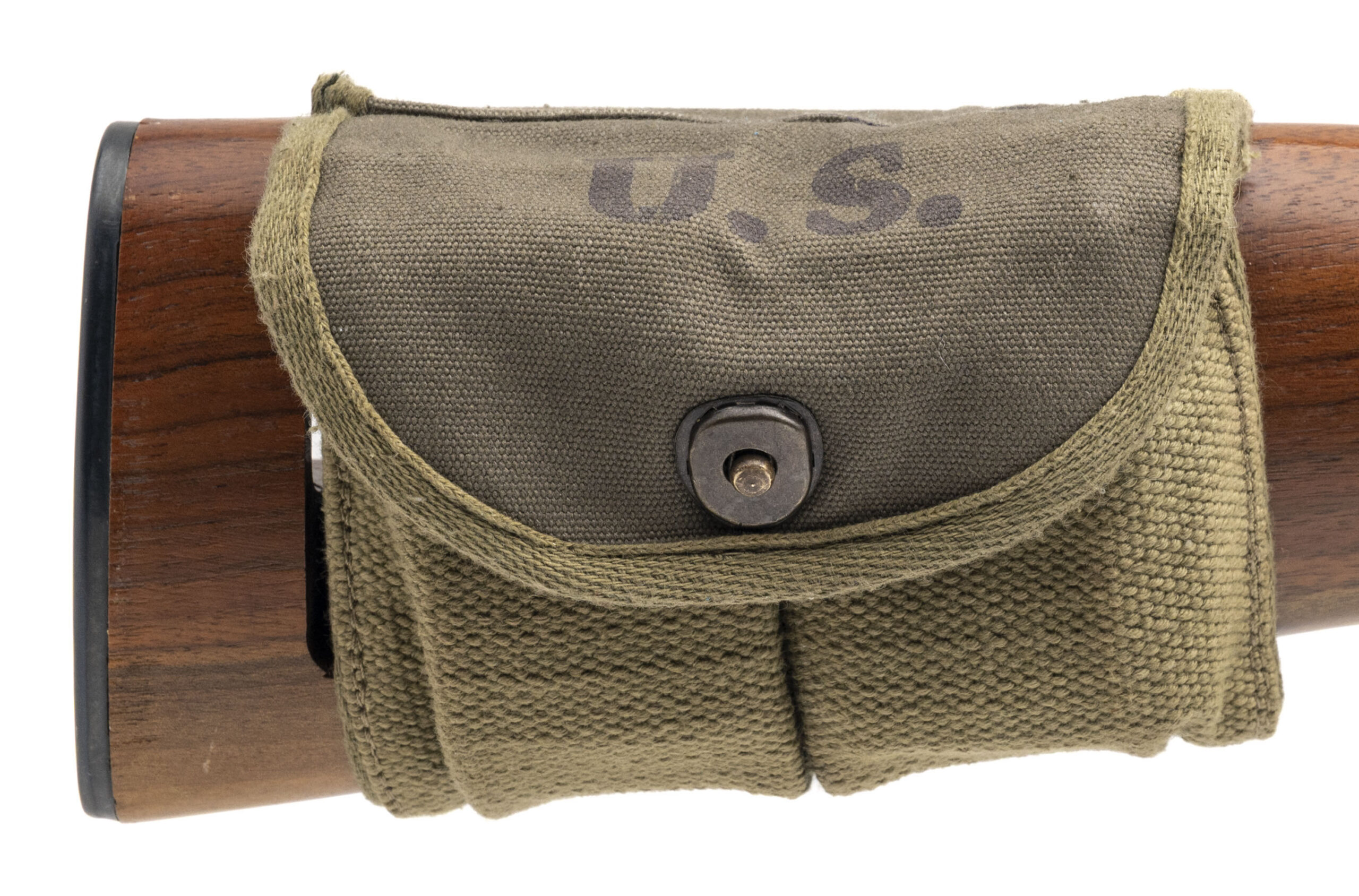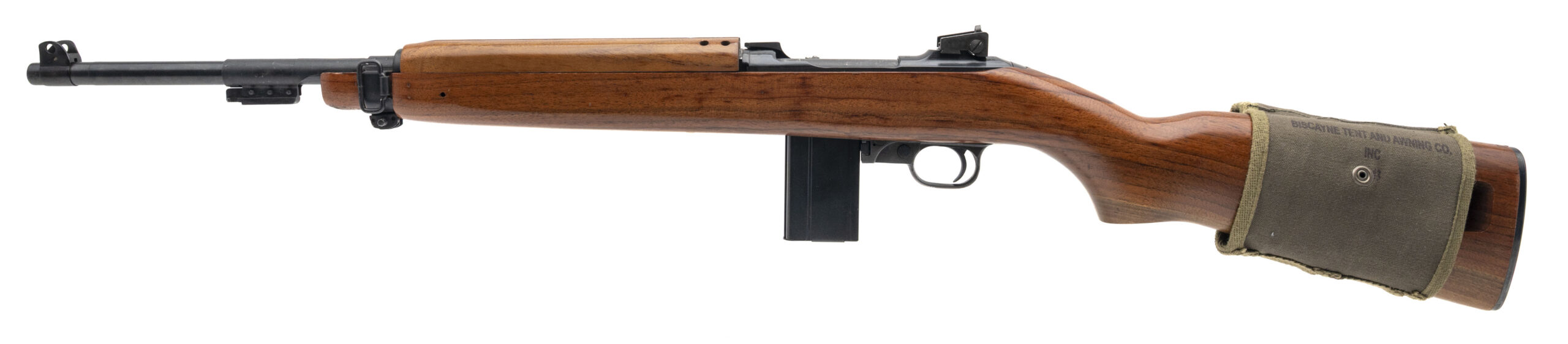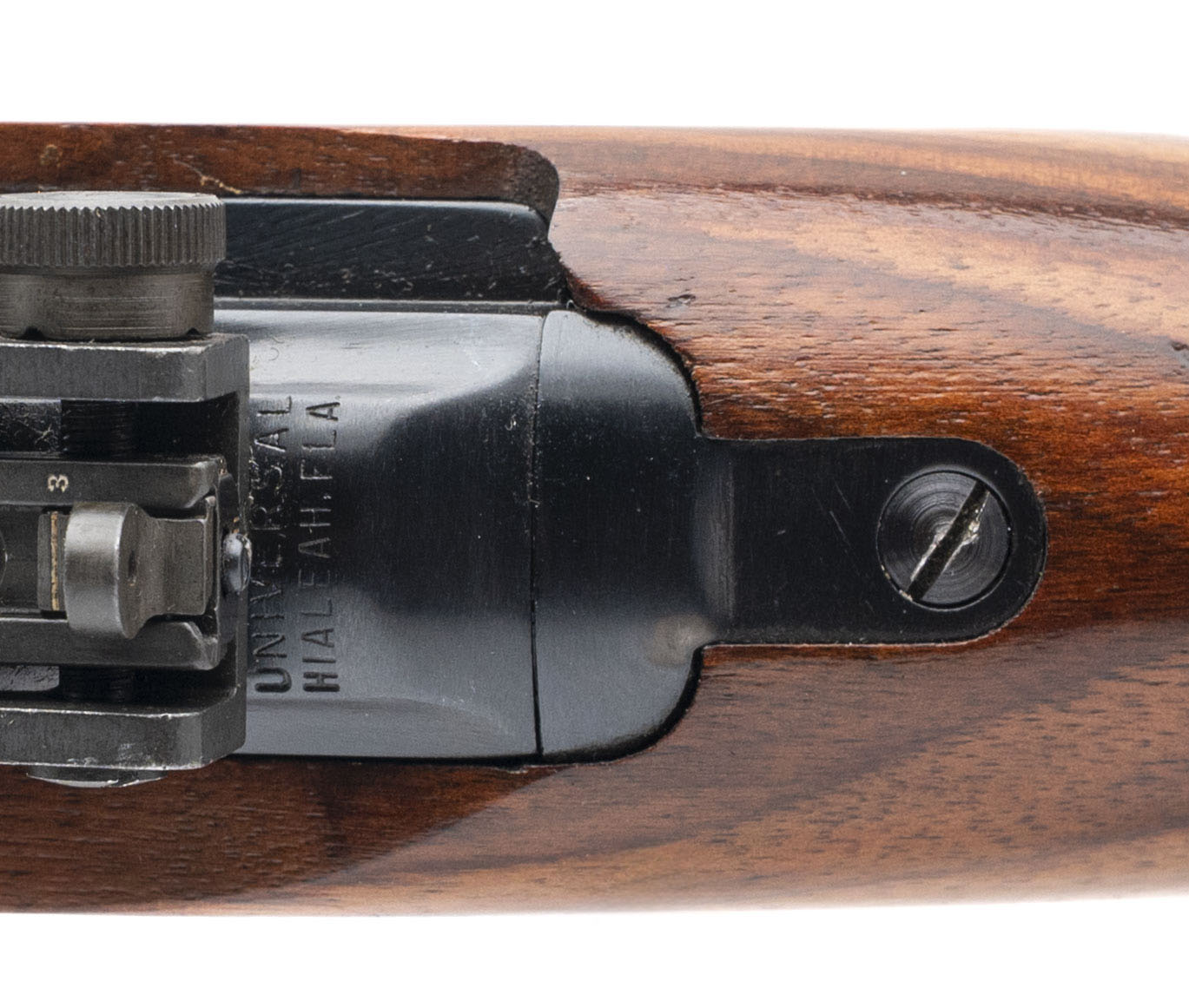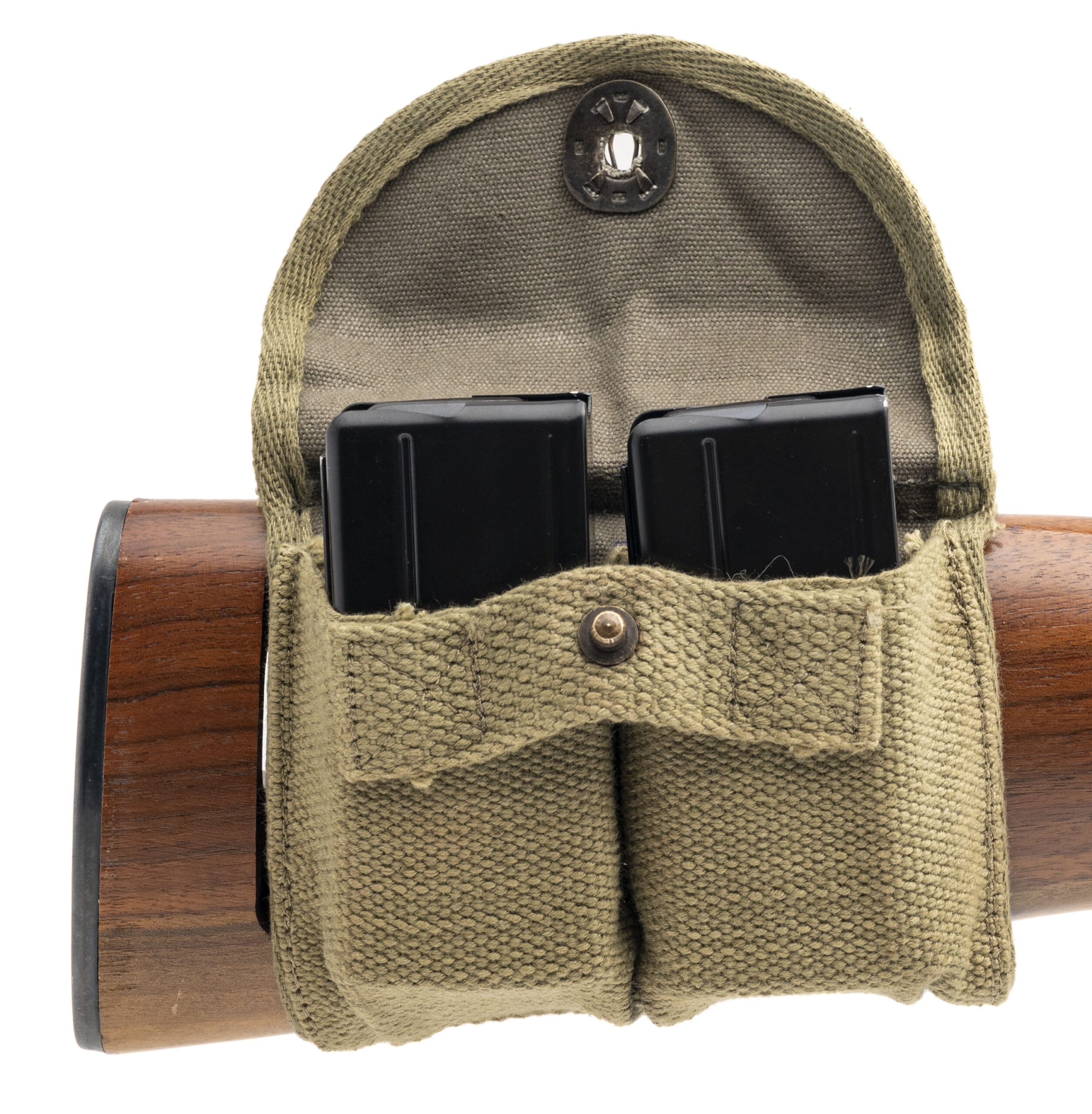 SN: 21718. Semi-automatic rifle made by Universal c. 1970. 18" barrel chambered for .30 Carbine. Near excellent condition with a string of marks on the barrel in front of the bayonet lug. Post-war reproduction of the US Carbine, Caliber .30, M1 with a ½" longer barrel and some internal parts changes. Comes with '43 dated "Biscayne Tent" double magazine pouch and one spare 15-round magazine.