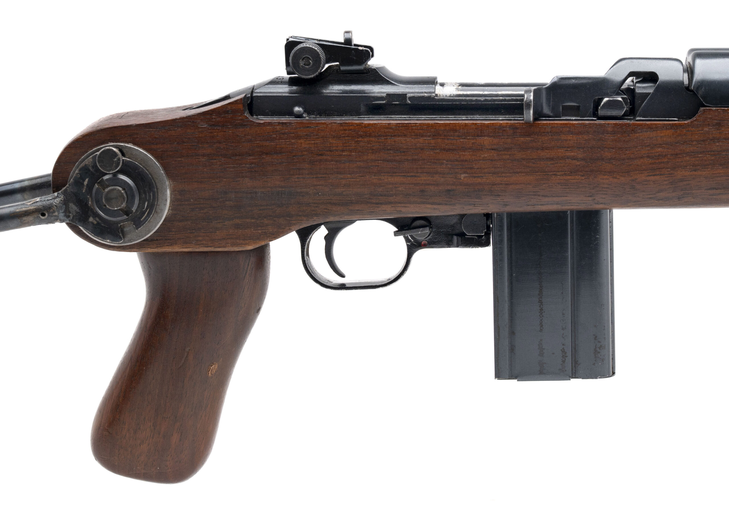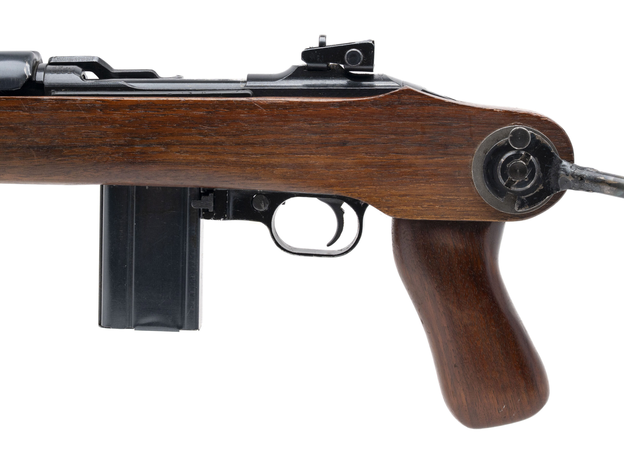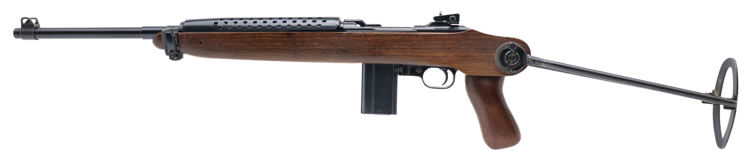 SN: 440432. 1970s vintage, .30 carbine with an 18" barrel. Bore is very good. Semi-auto rifle with folding paratrooper stock, perforated heat shield, bladed front sight, adjustable rear sight, blued finish, and wood pistol grip & forend. Finish & stock show moderate handling wear throughout. Overall condition is very good.
