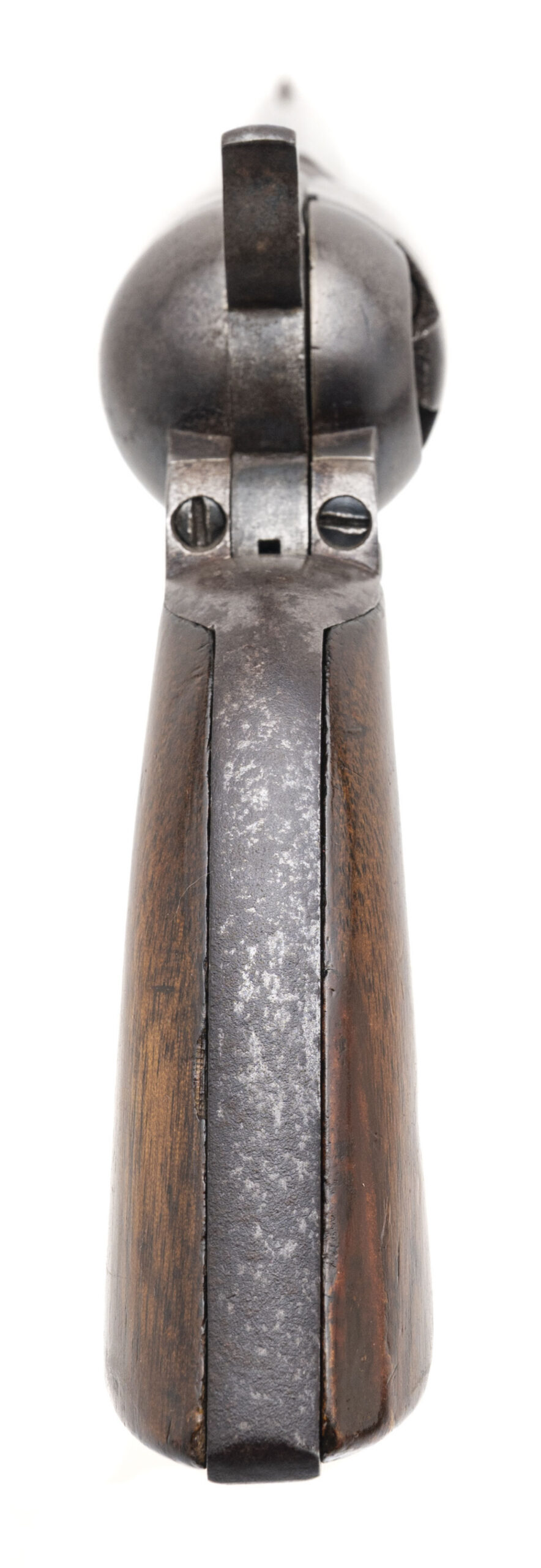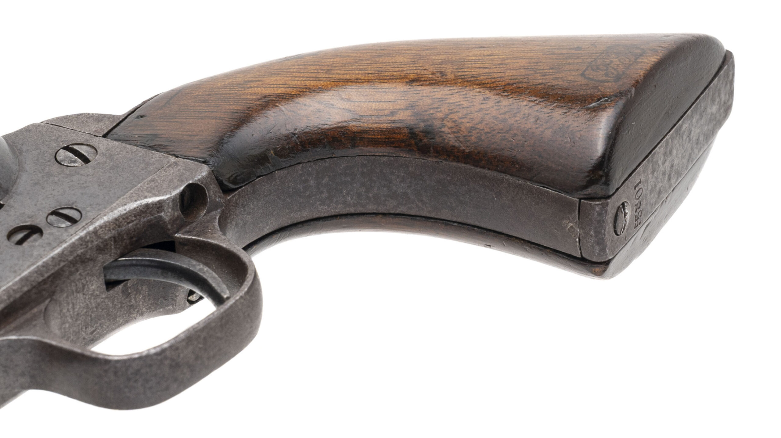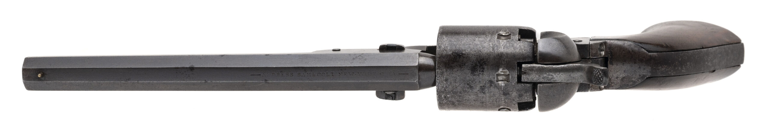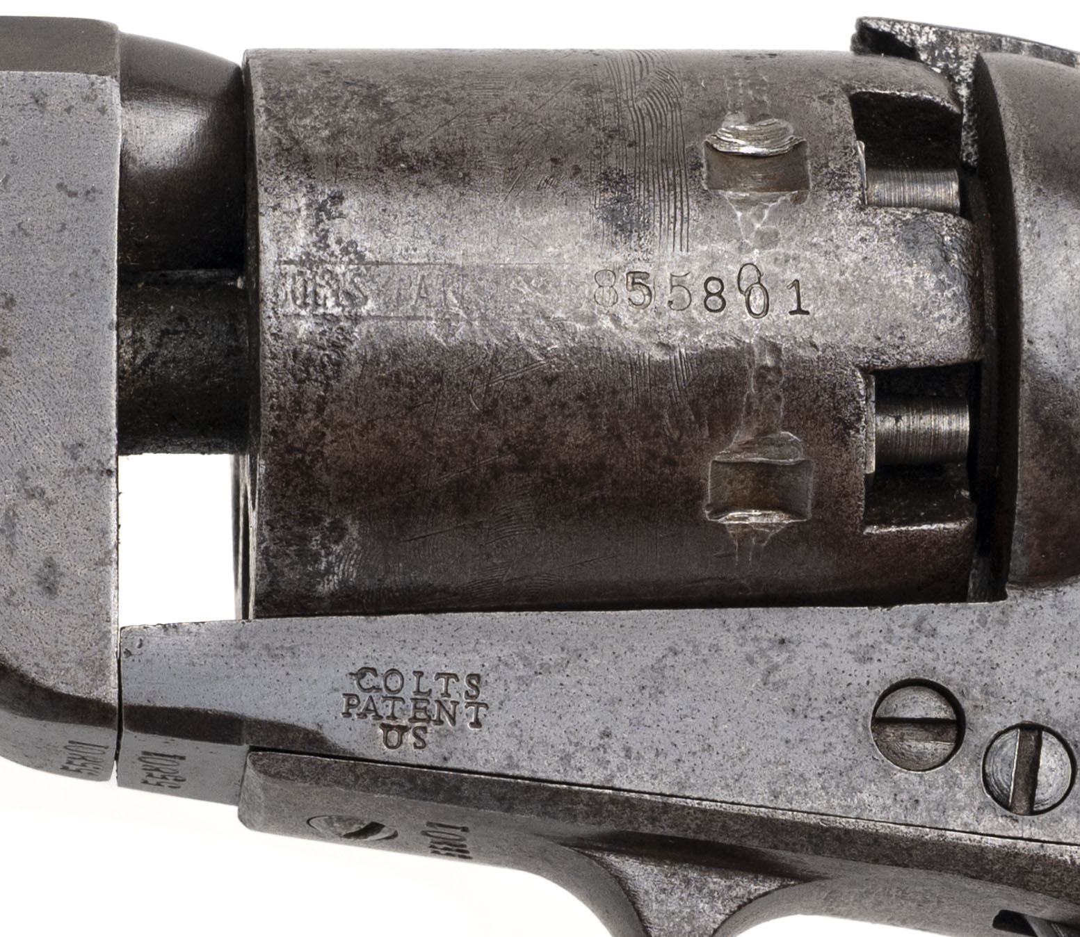 Serial number 55801. Made in 1856. 36 caliber with a 7.5” barrel. This is a martial Colt 1851 Navy with Iron back strap and trigger guard. This is a nice sharp gun with an even brown patina throughout. There is a small “U.S.” underneath the Colt’s Patent Marking and a good crisp cartouche on the left-hand side grip. These guns without US Navy markings are called Army- Navies by collectors as they were issued to the US Army instead of Navy. Good cylinder scene remains. The cylinder has been made to match the rest of the gun.