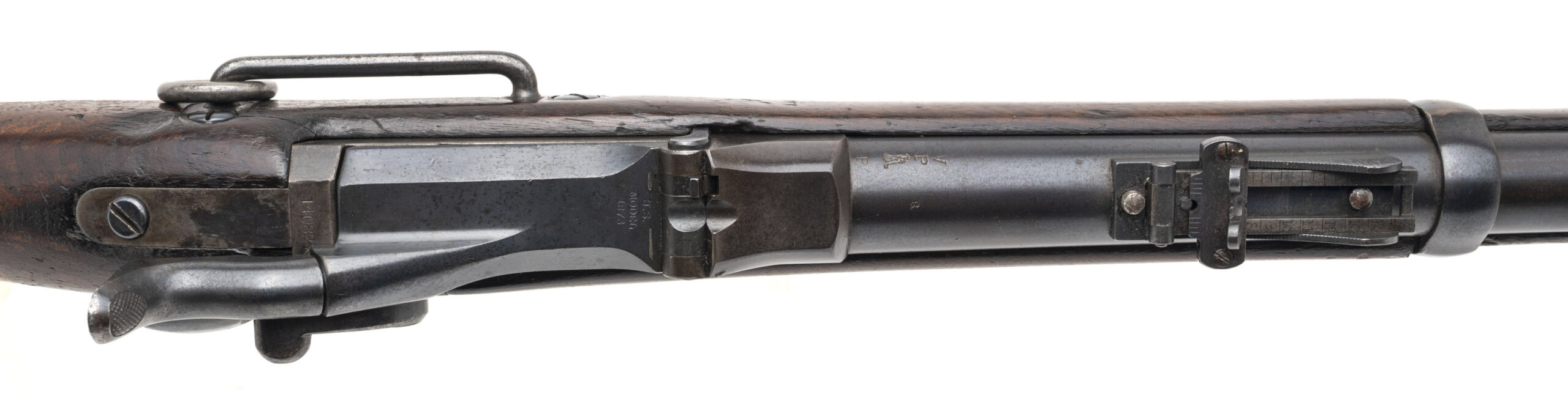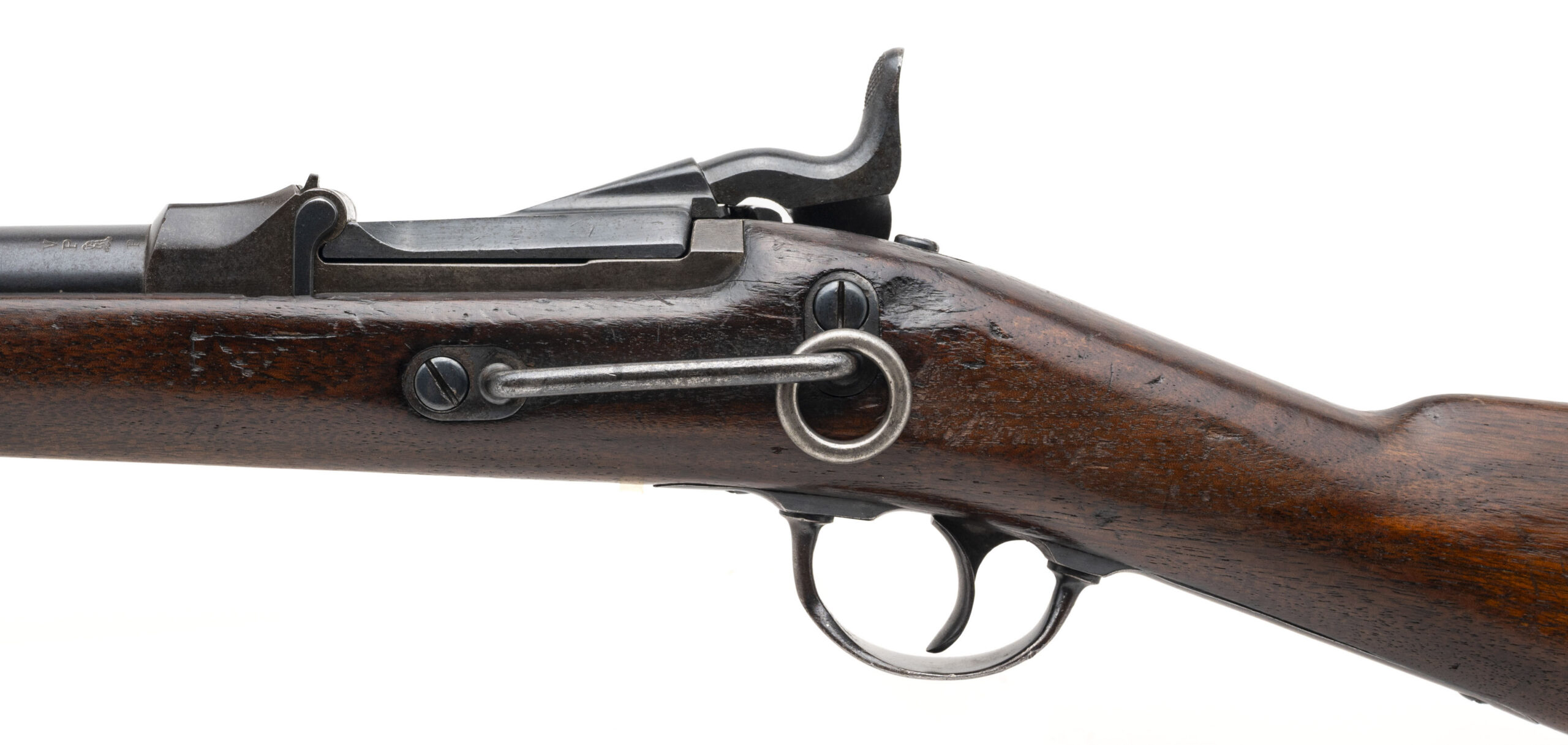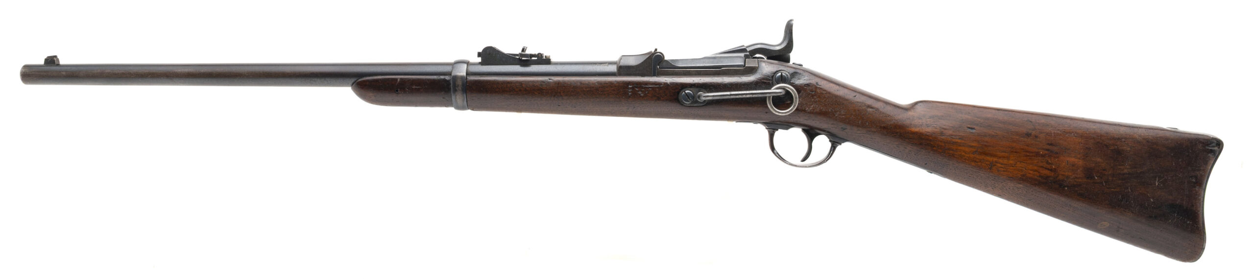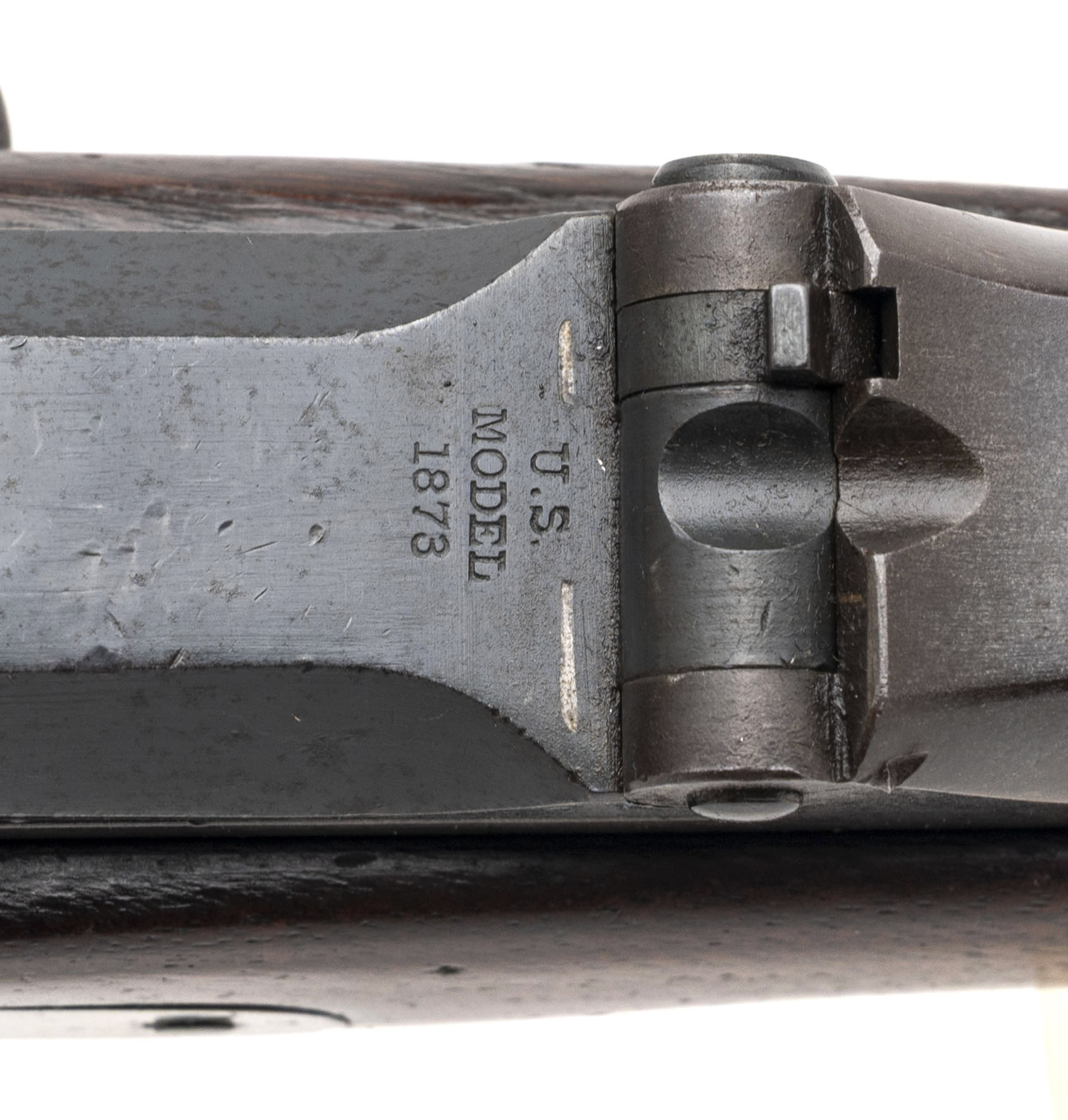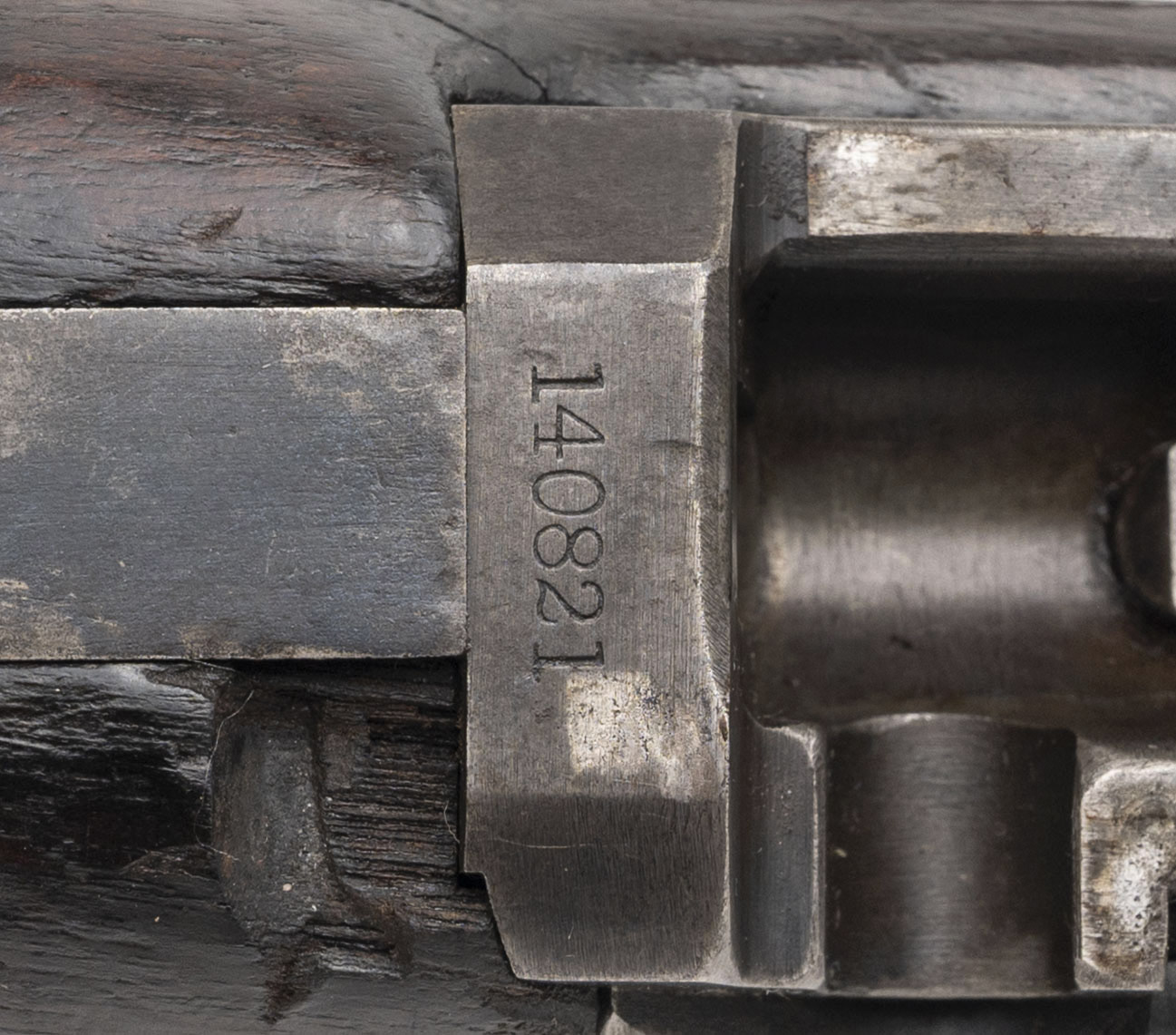 Serial number 140821. Made circa 1880. 45-70 caliber with a 22” barrel. The barrel still retains approximately 70% of the arsenal blue. The trap door is blued and the lock markings are slightly faint in places leading us to believe this is a arsenal refurbished gun. The stock is very good. Behind the sling swivel where the cartouche as, someone shaved the stock. The action works perfectly and the bore is excellent.