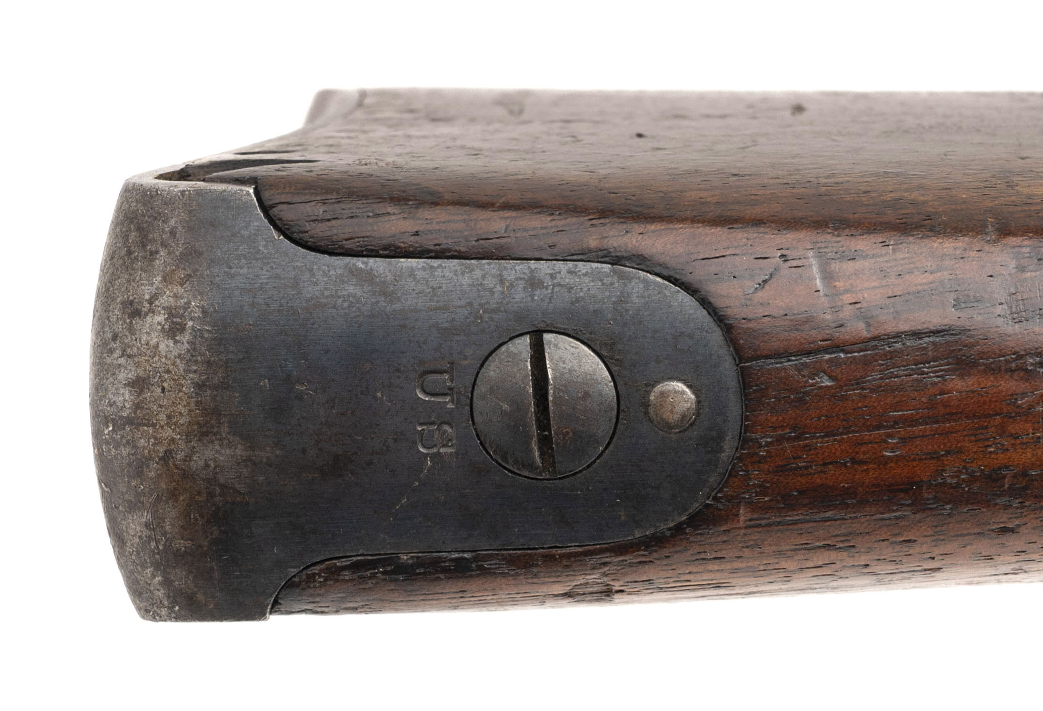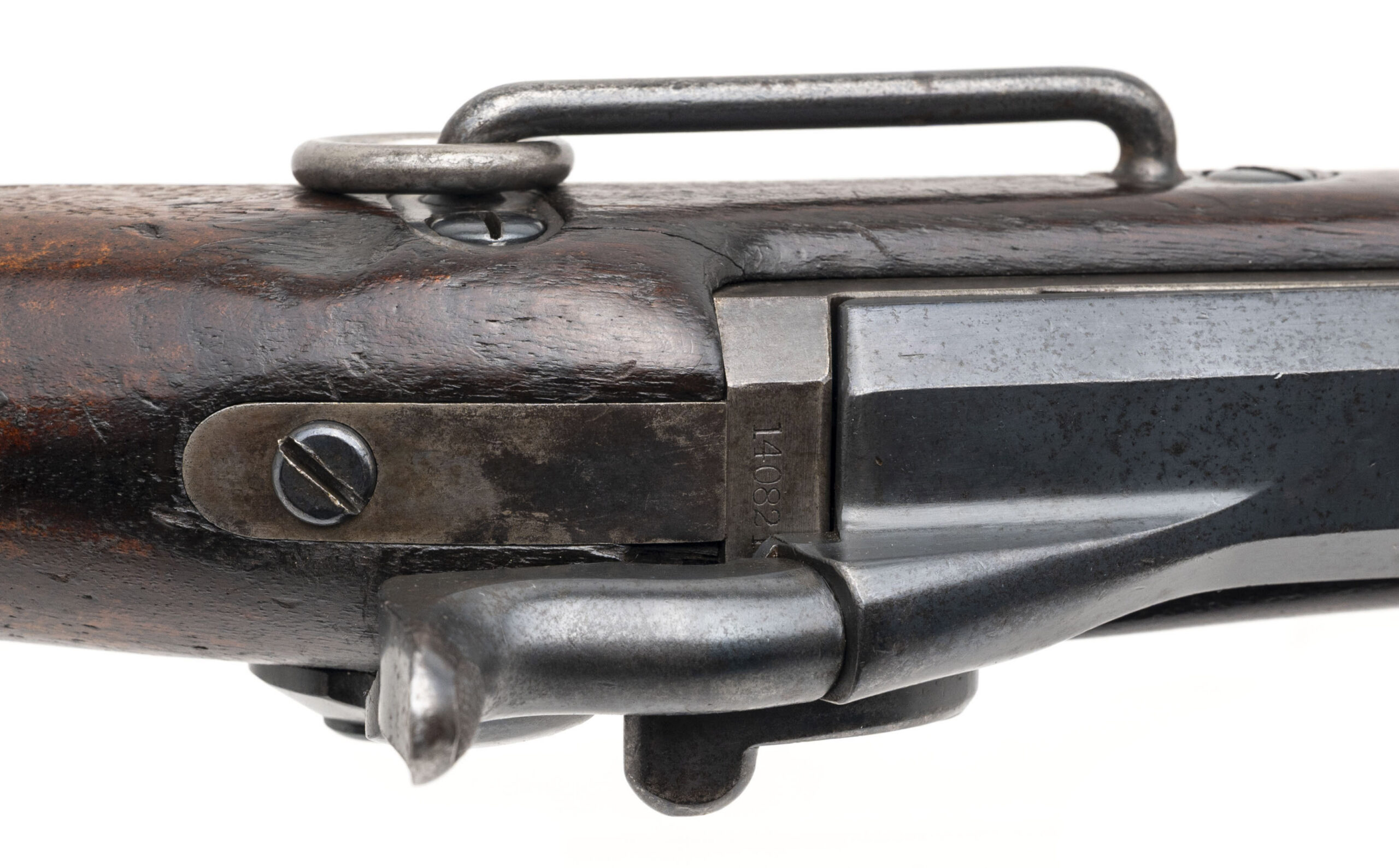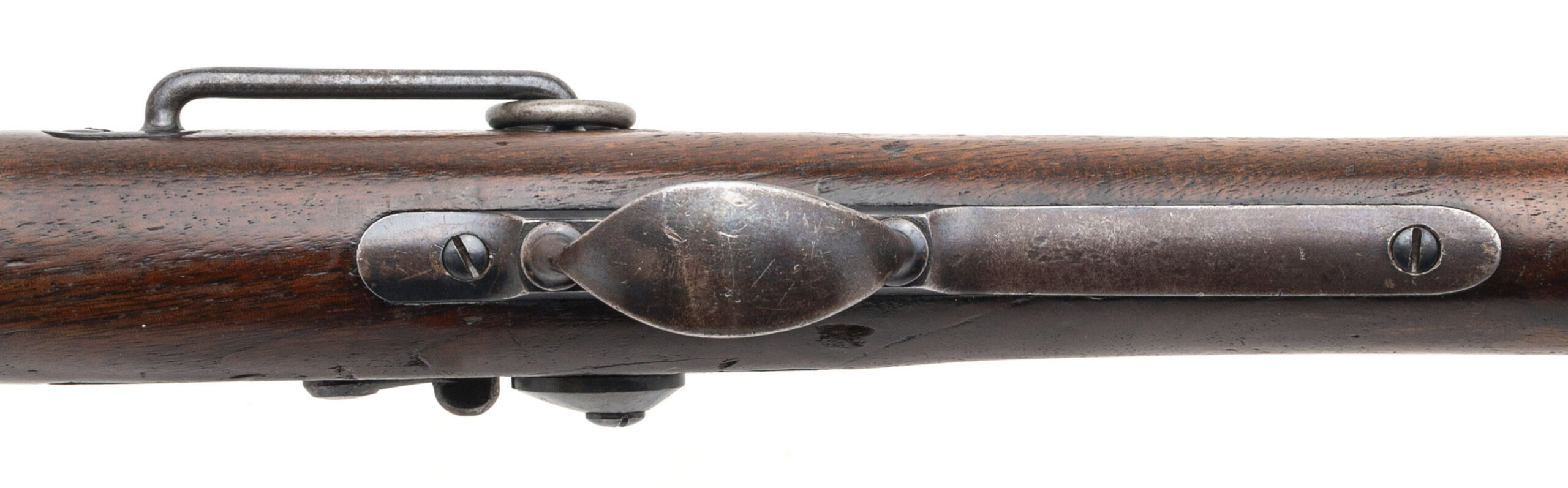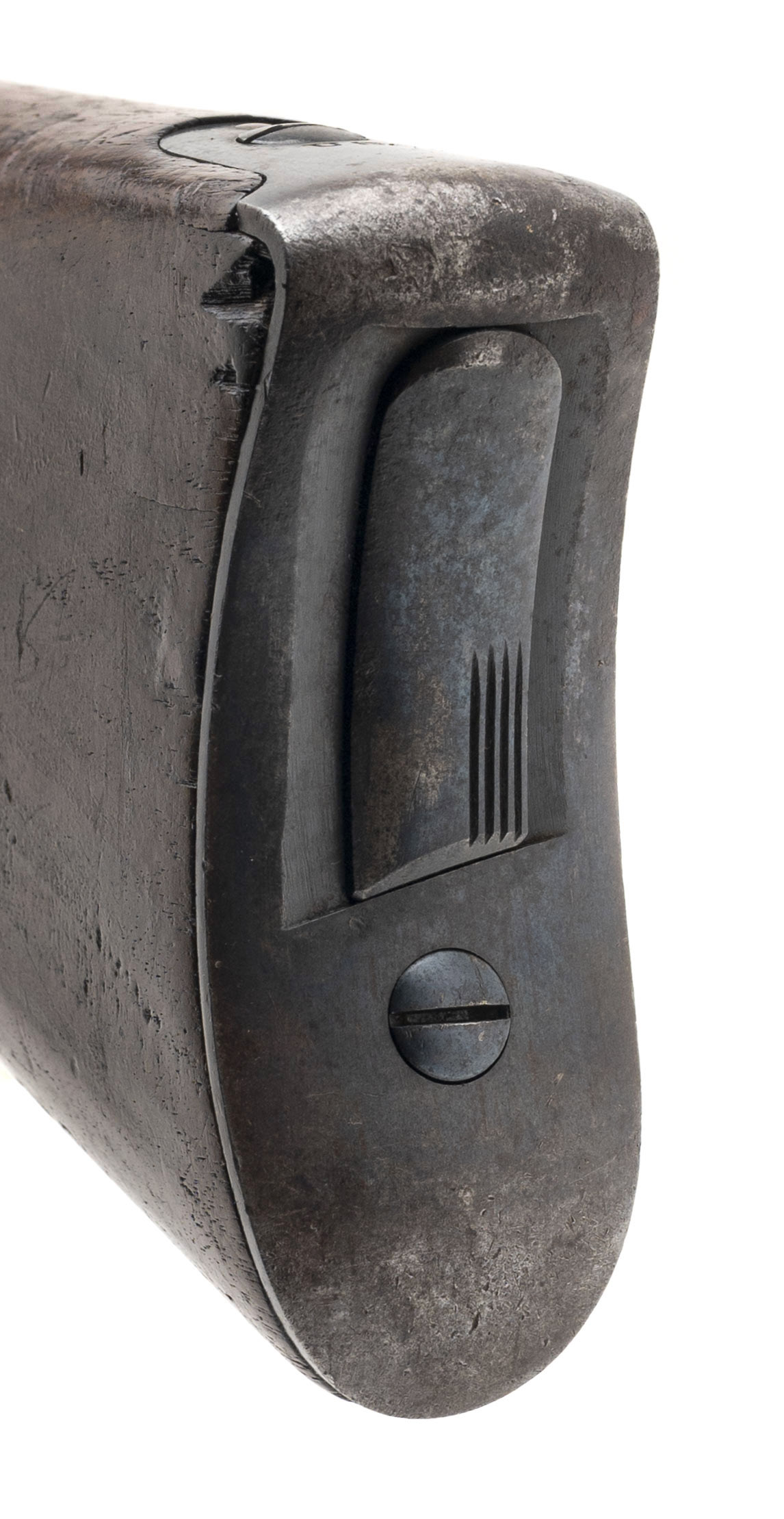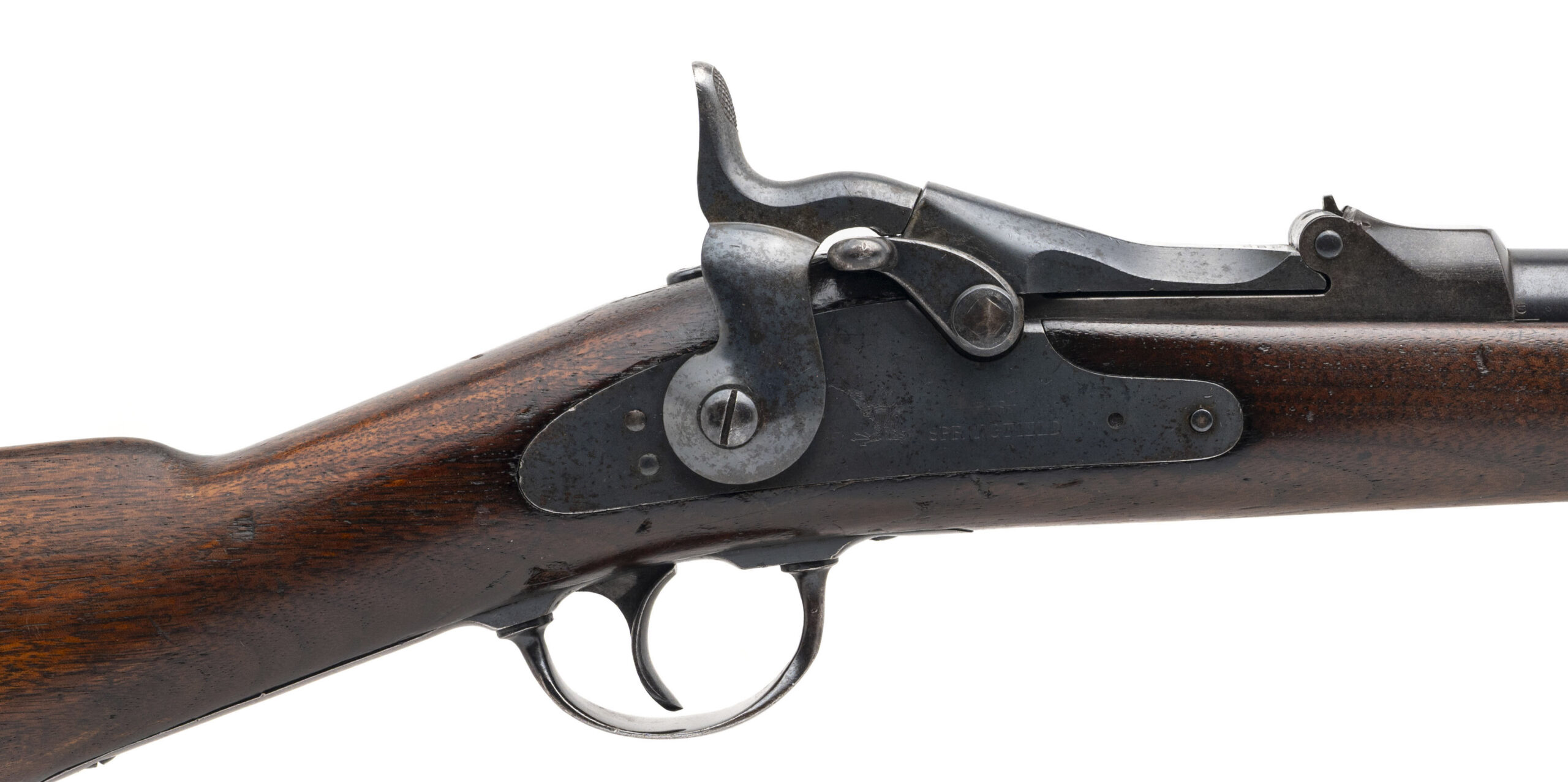 Serial number 140821. Made circa 1880. 45-70 caliber with a 22” barrel. The barrel still retains approximately 70% of the arsenal blue. The trap door is blued and the lock markings are slightly faint in places leading us to believe this is a arsenal refurbished gun. The stock is very good. Behind the sling swivel where the cartouche as, someone shaved the stock. The action works perfectly and the bore is excellent.