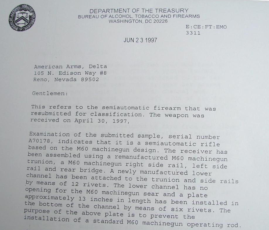 US Ordnance M60 .308 Win caliber rifle. Rare U.S. Ordnance semi-auto civilian version of the famous M60 machine gun. U.S. Ordnance is the supplier to the U.S. military of M60s and made a very few of these semi-auto models. They are no longer available. Excellent condition with 200 rounds of belted ammo, a starlight carry case and ATF paperwork stating the gun is legal to own.