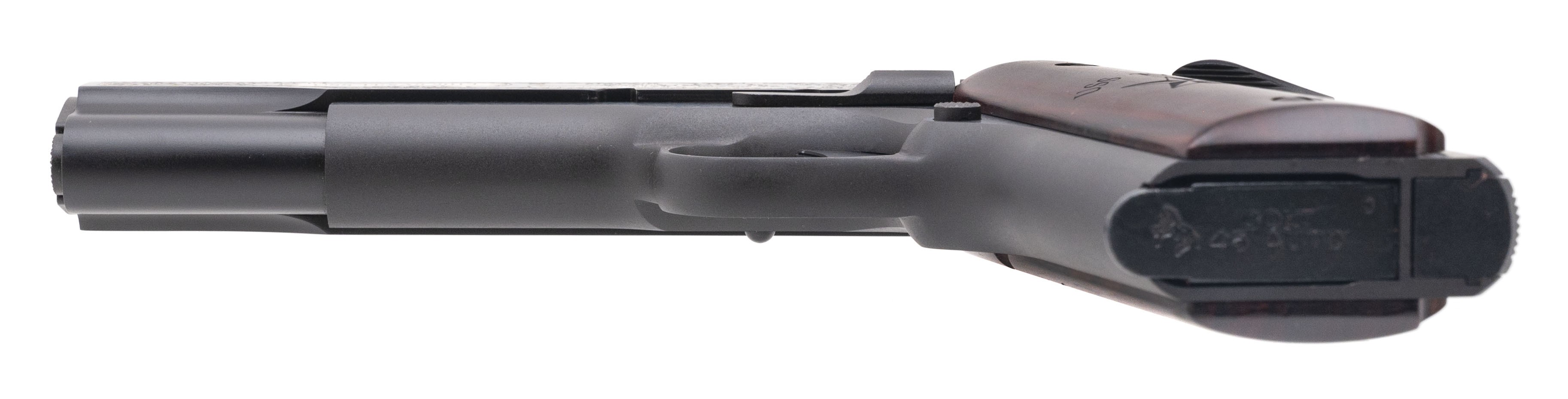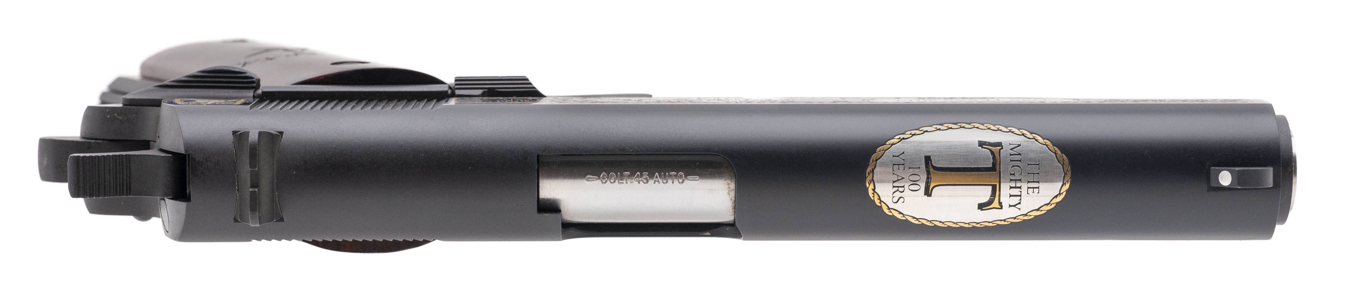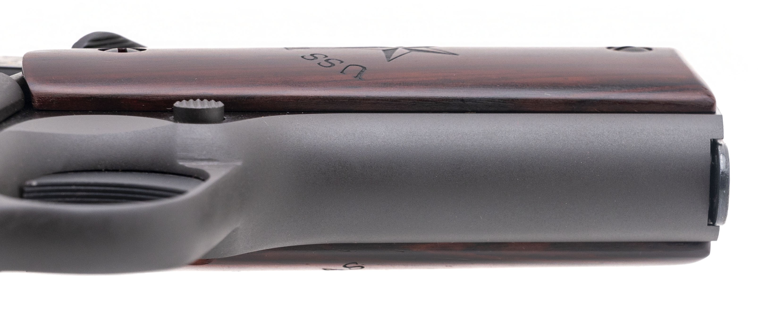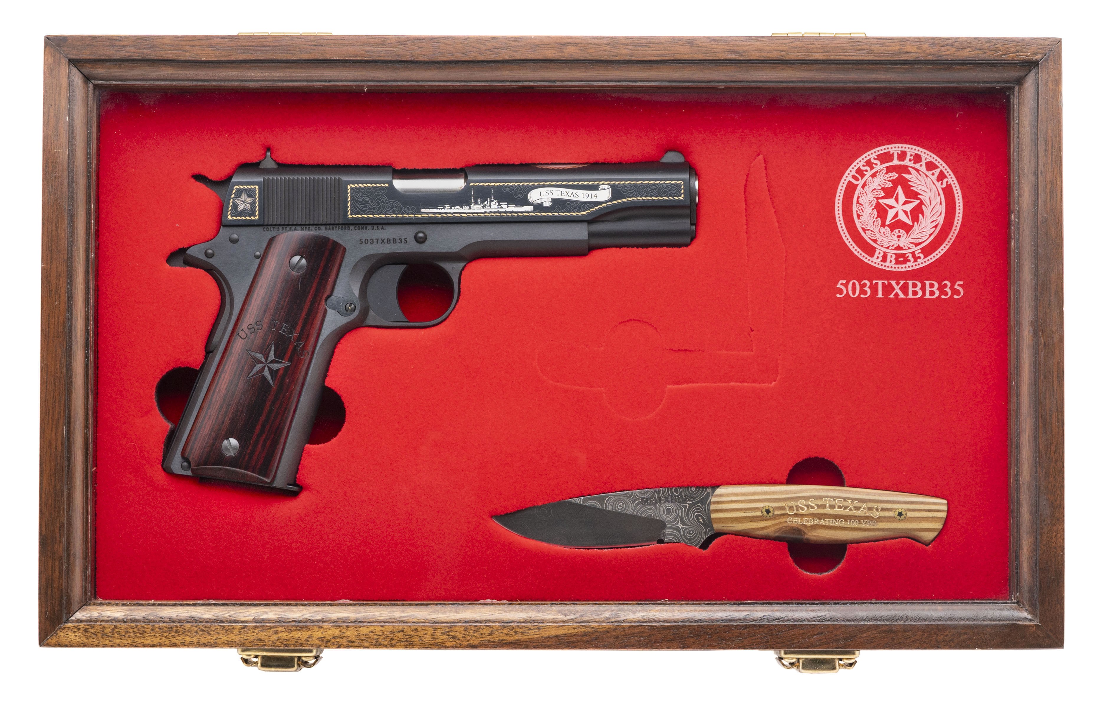 SN:503TXBB35. Modern production. .45 ACP with a 5" barrel. Bore is in excellent condition. USS Battleship Texas Commemorative Pistol. Finish and grips are excellent. Has engrave slide of battleship Texas. Overall condition is excellent. Comes with Presentation case, Kinfe forge with the steel from the historic Battle ship Texas BB-35 and paper work. (CONSIGNMENT)