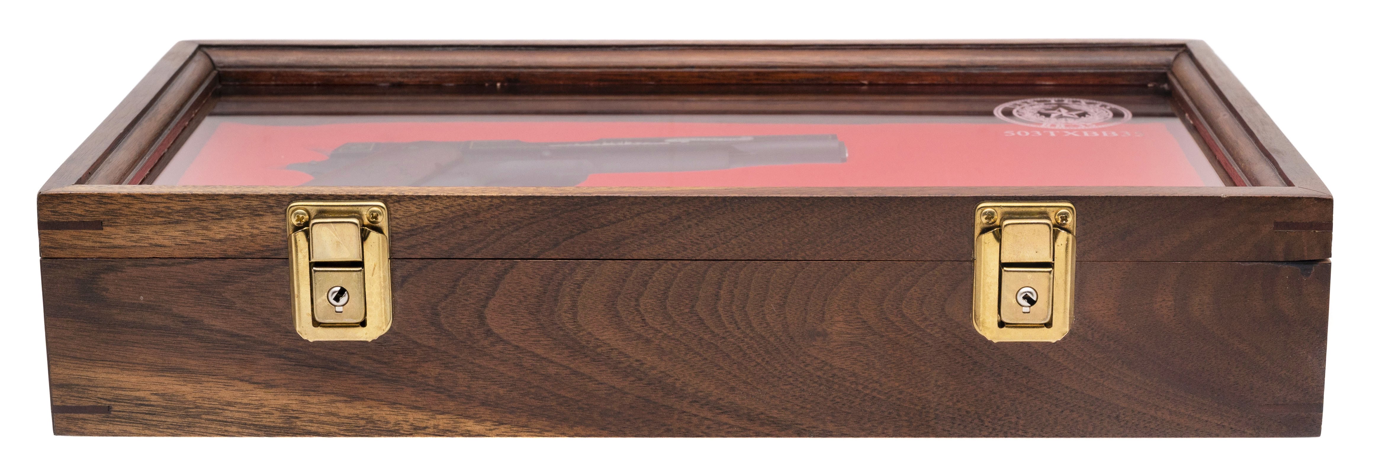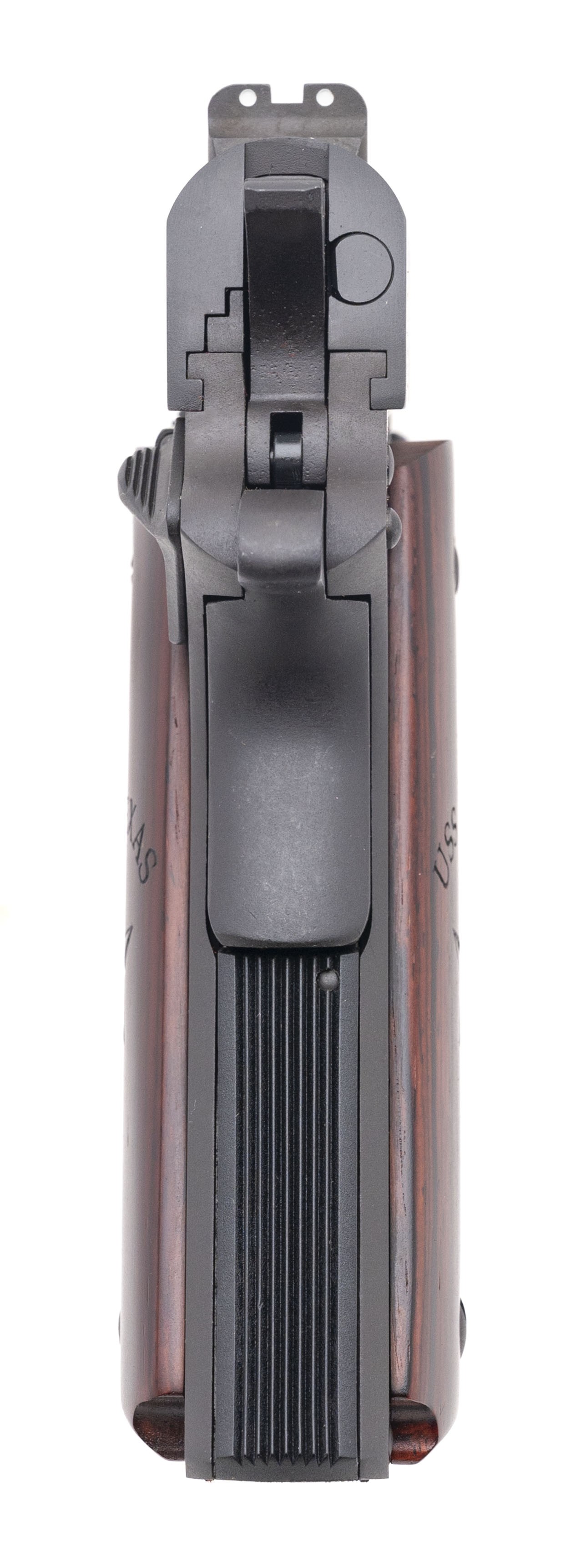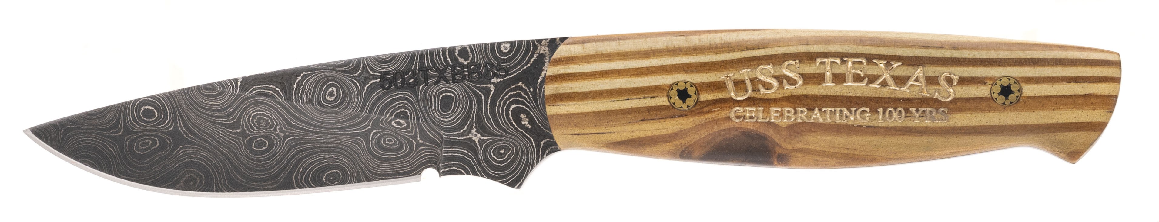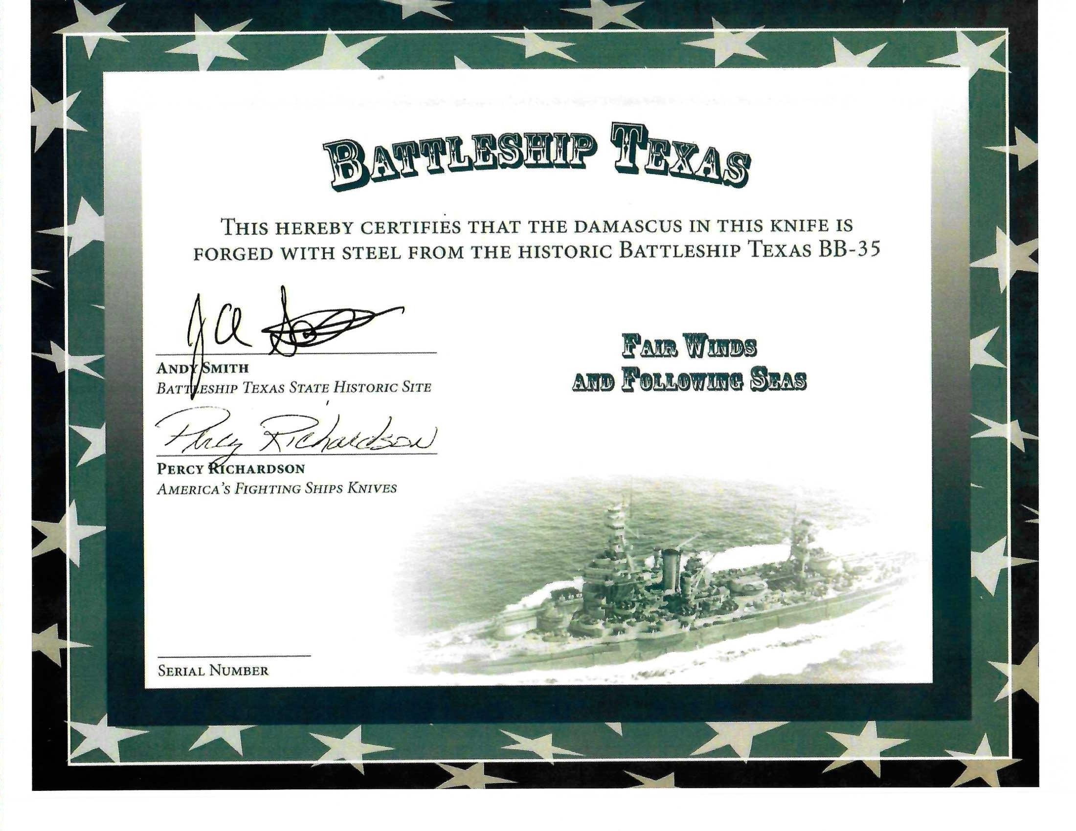SN:503TXBB35. Modern production. .45 ACP with a 5" barrel. Bore is in excellent condition. USS Battleship Texas Commemorative Pistol. Finish and grips are excellent. Has engrave slide of battleship Texas. Overall condition is excellent. Comes with Presentation case, Kinfe forge with the steel from the historic Battle ship Texas BB-35 and paper work. (CONSIGNMENT)