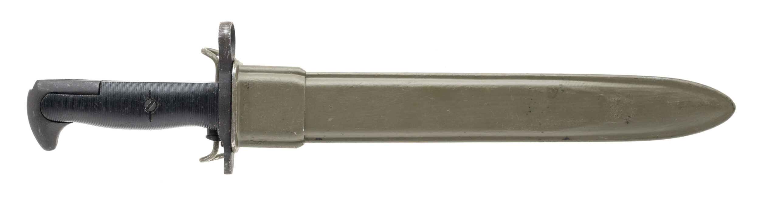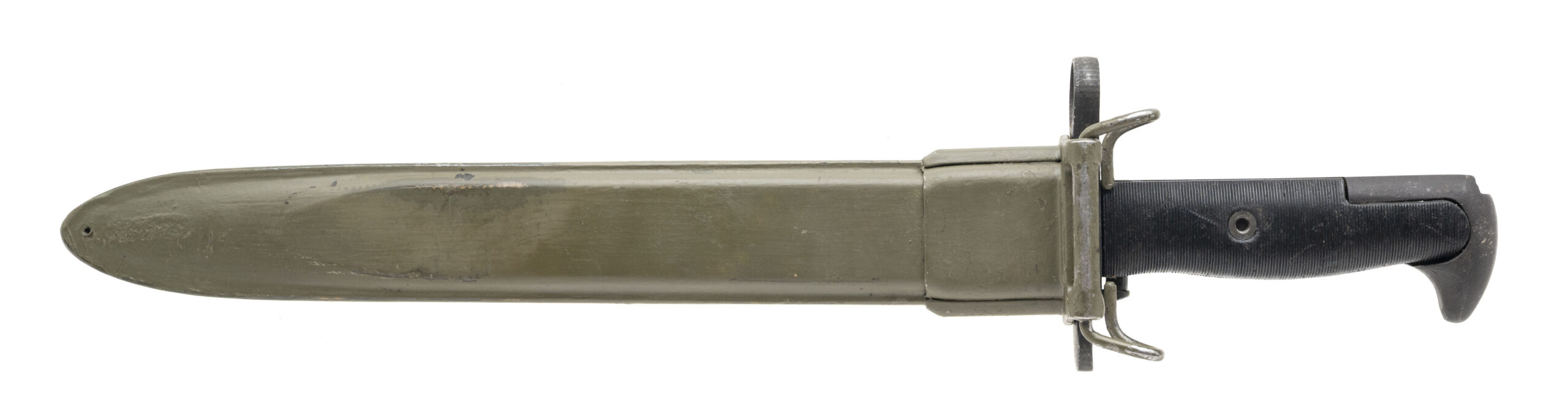 1942-dated spear point Utica Cutlery 10-inch cut down M1905E1 bayonet for the M1 Garand rifle. Comes with M7 scabbard.