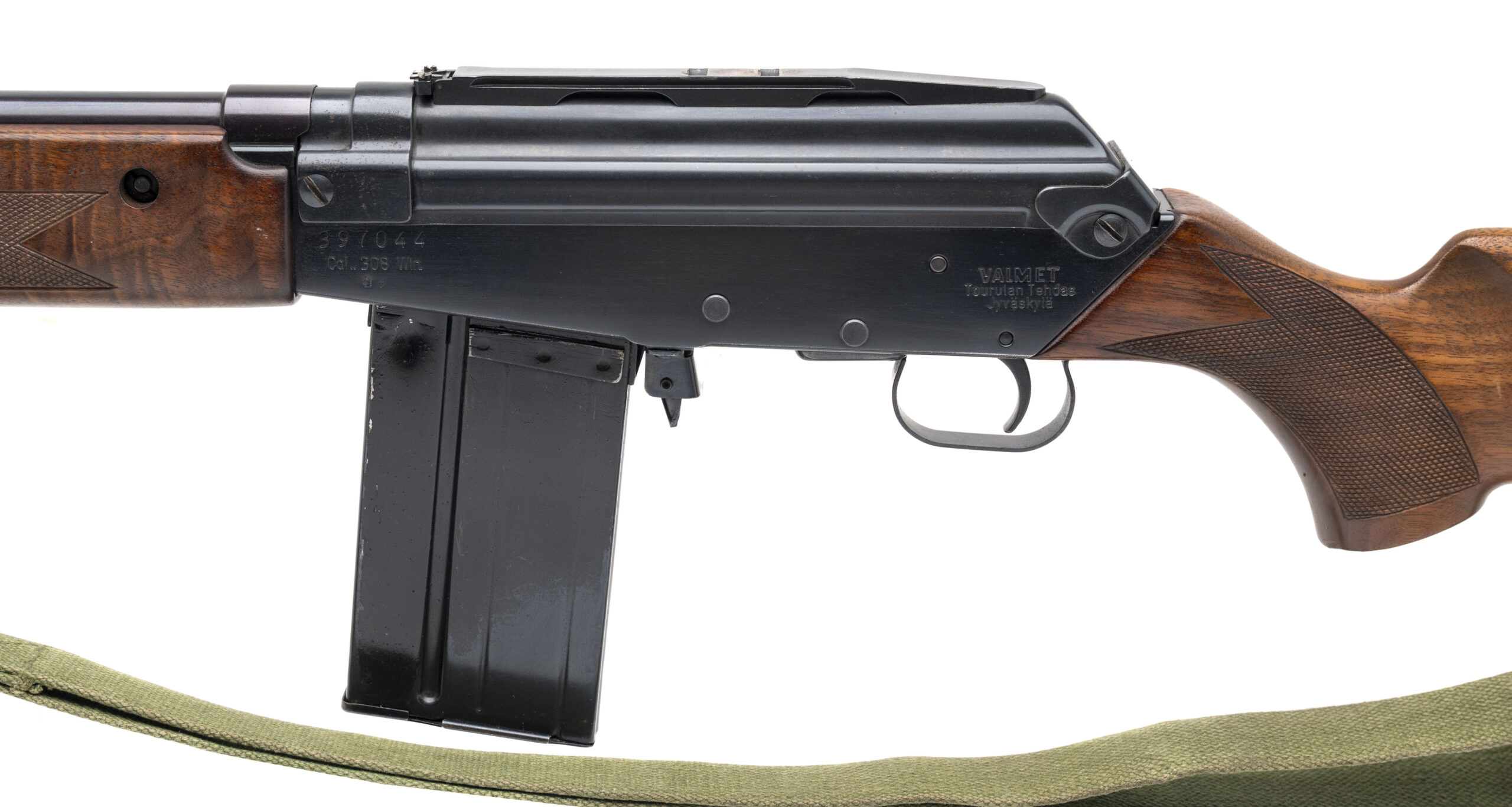 SN: 397044. Made circa 1980's. .308 with a 20.5" barrel. Bore is bright with strong rifling. Finnish made AK pattern rifle with checkered stock and forend on a milled receiver. Finish is in very good condition with only minor handling wear. Overall very good condition.