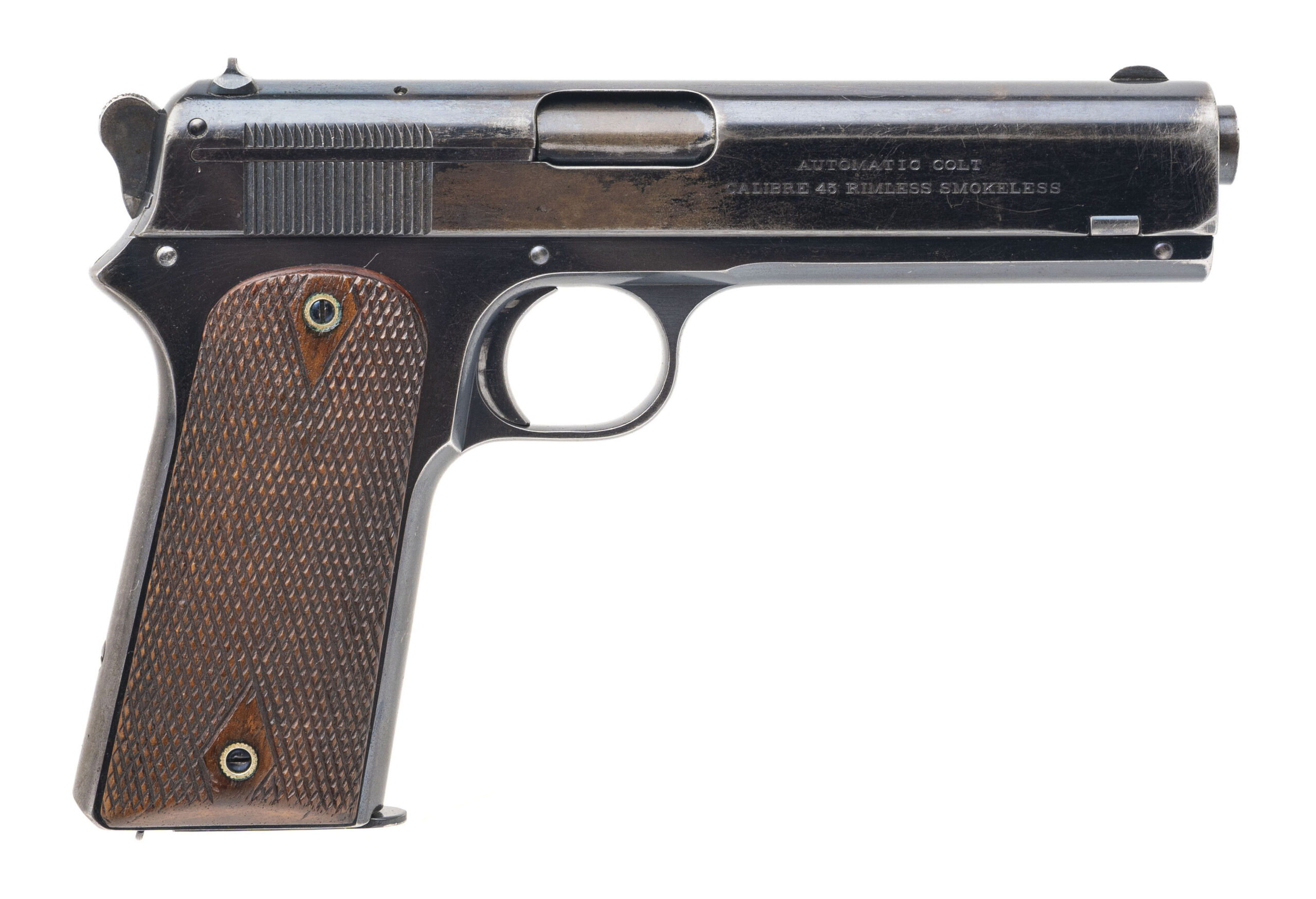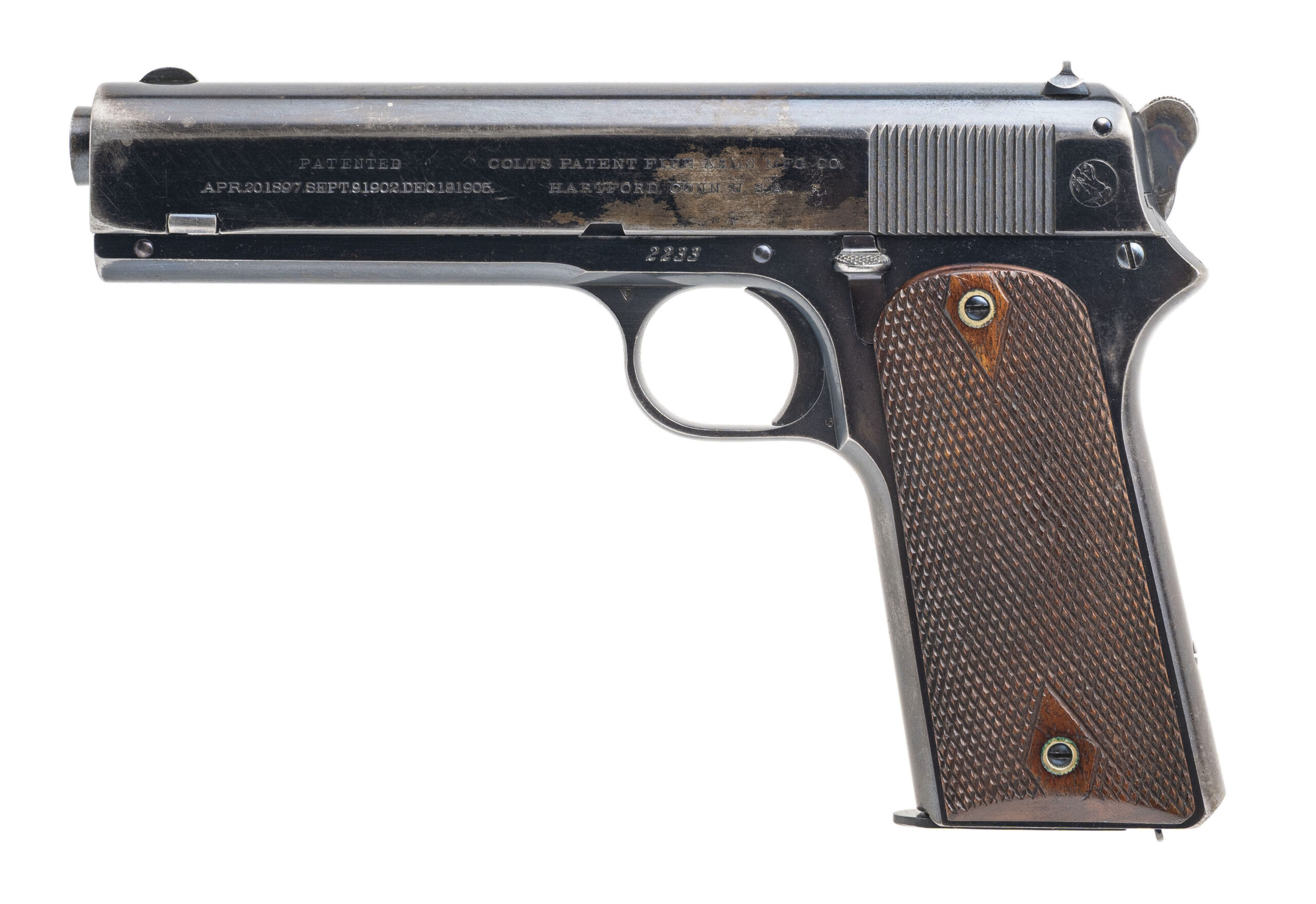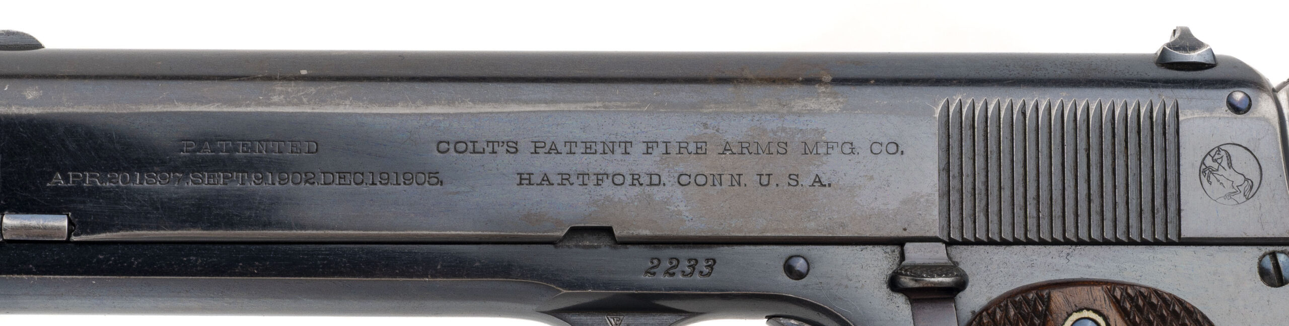 Serial number 2223. Made in 1907. 45 ACP caliber with a 5” barrel. This is a very fine gun with 85% of the original blue with just slight flaking on both the left and right hand sides of the slide. The grips are excellent. The hammer even has most of the original case colors. This is a very fine example of an all original Colt 1905!