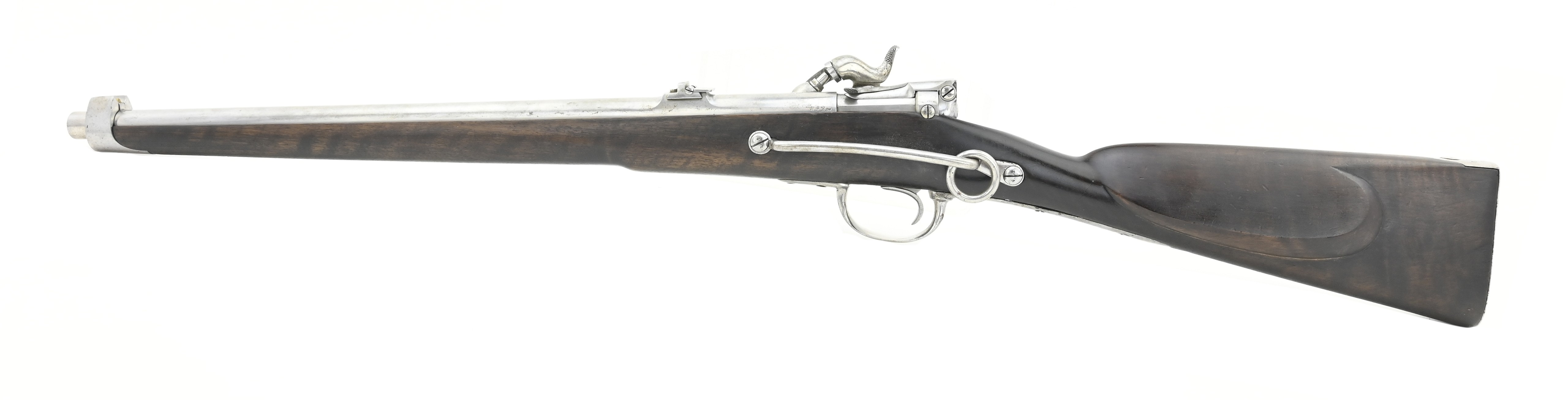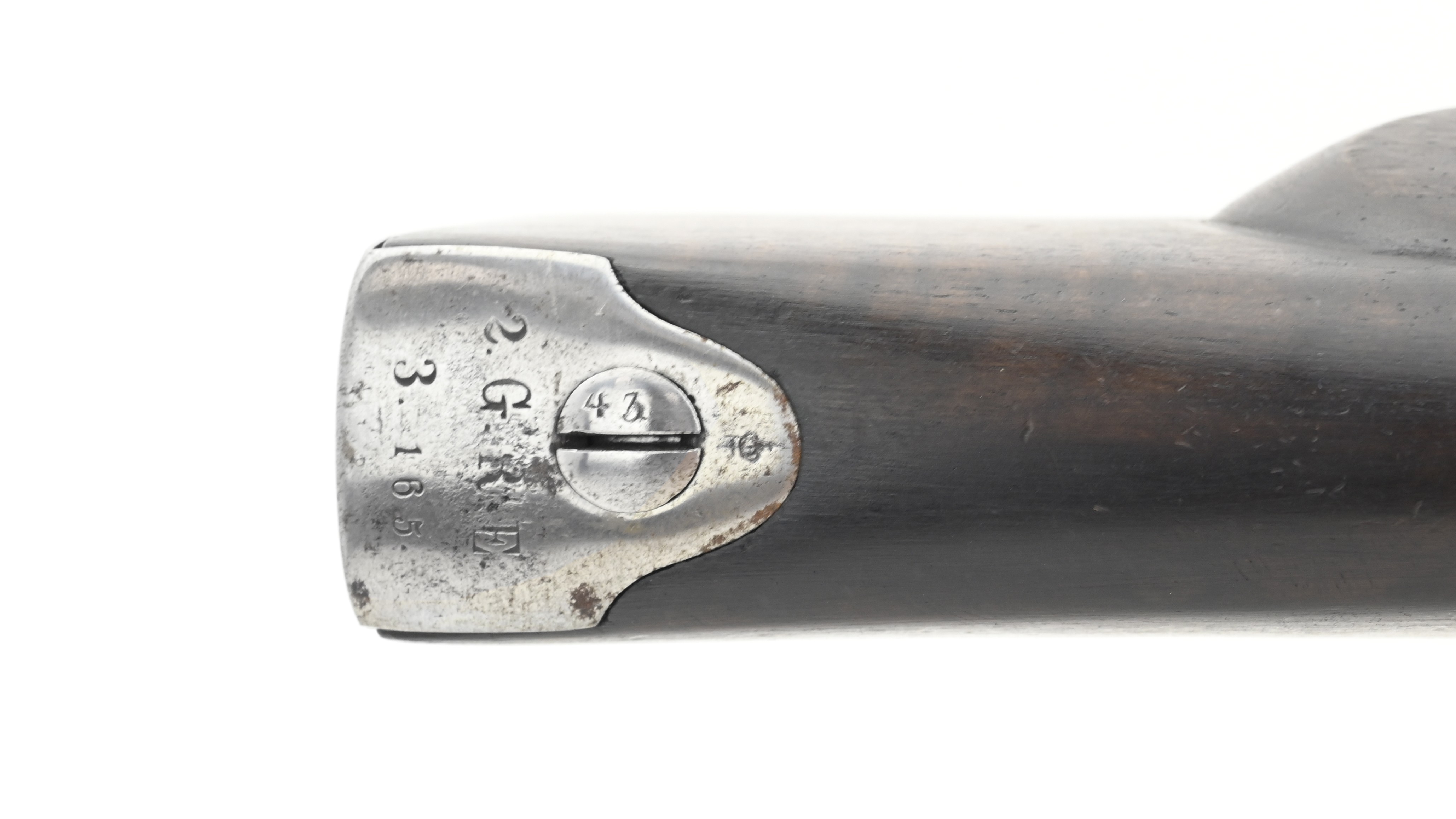 Very rare Prussian breech-loading percussion carbine. This carbine was used by the 2nd (1st Pomeranian) Grenadiers “King Frederick William IV”. The overall length is 36”. The barrel is 19⅞”. The caliber is approximately 13.6mm (.535”). The bore is excellent. The bright metal is excellent. The stock is excellent. Barrel on the left, at the breech, has serial number “842”. This is repeated (842 or 42) on many of the parts. The barrel has a crown over “IR” (JR?) at the top next to the bolster. The lock is marked “SP.&SR./SUHL”. This is shorthand for Spand Gerberg & Sauer, Suhl. Germany. The right side of the butt stock is stamped with a crown over “FW” (Fredrick William). The butt plate toe is marked “2G RE/ 3 165”. There is a trap in the butt. The stock has a nicely formed cheek rest on the left. Left side of the stock also has a 5” sling bar and ring. The action is unusual. First, there is a rotating spring-loaded nipple protector/ safety, second, the breech is opened by first rotating the nipple protectorr/ safety forward, then releasing the hammer so it rests on the nipple, then pulling up on the bolt tab until it rotates to vertical, then rotates approximately 30° to the right, and finally pull the bolt to the rear to load the chamber. Repeat in reverse to prepare for firing. It’s not too hard once you’ve done it a few times! The action functions correctly. This is the only one we have seen in the last 45 years. Probably only enough were made for the 2nd Grenadiers and its by Sauer as well!
