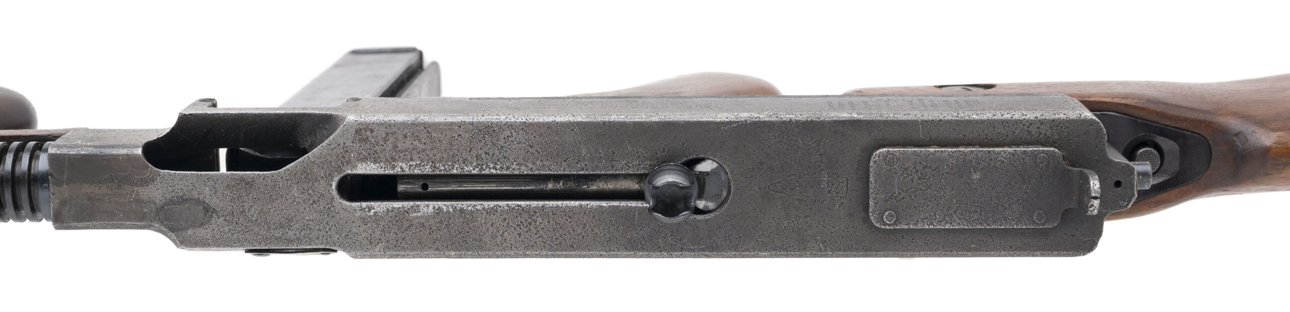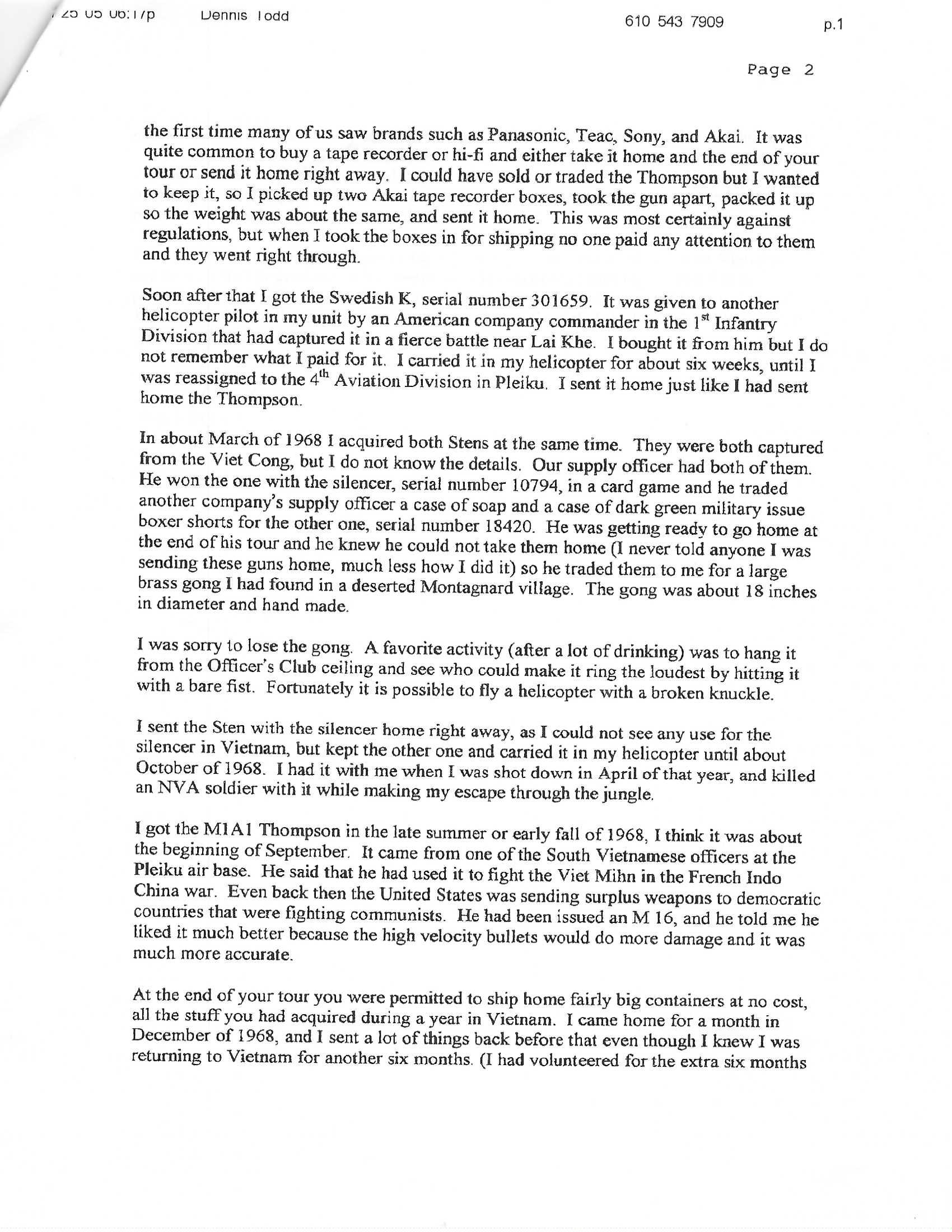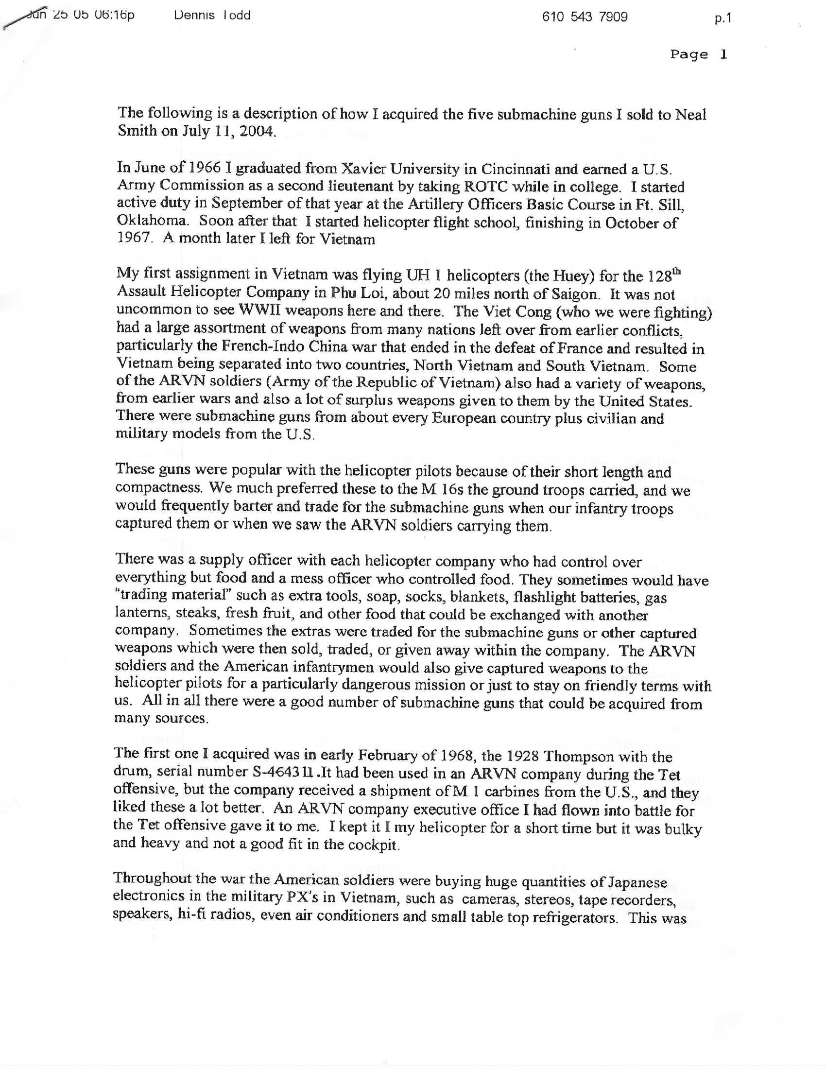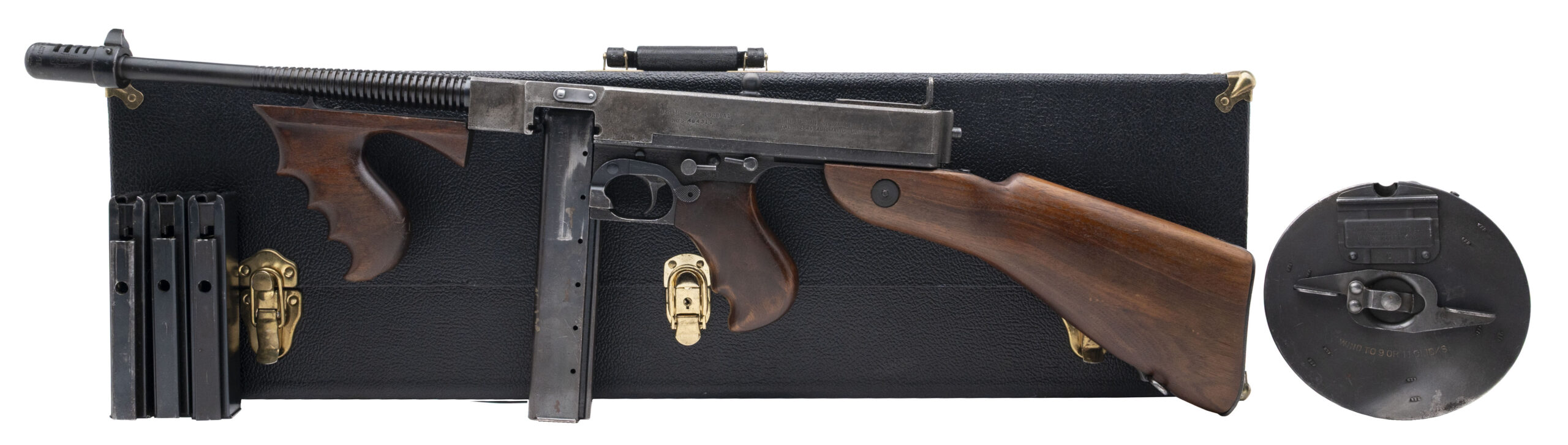 Serial No. S-464311, manufactured circa 1940–1942, .45 ACP, 12” round barrel with compensator. Metal exhibits light surface pitting and a blue-grey finish consistent with tropical service and age. Stock and pistol grip show light handling impressions. This Thompson is accompanied by a first-person provenance letter from the original owner, detailing acquisition while serving as a UH-1 (Huey) crew member during the Tet Offensive. According to the letter, an ARVN soldier presented the firearm to Alan J. Fry, who retained it briefly aboard his helicopter—making this an evocative Vietnam theatre bring-back with direct combat-era association. Action is smooth and functions correctly. Includes three 10-round stick magazines, one 50-round drum (for the 1928 pattern), and a reproduction violin case. A rare and highly collectible wartime Thompson with compelling Vietnam provenance—an evocative piece for militaria and firearms collections.