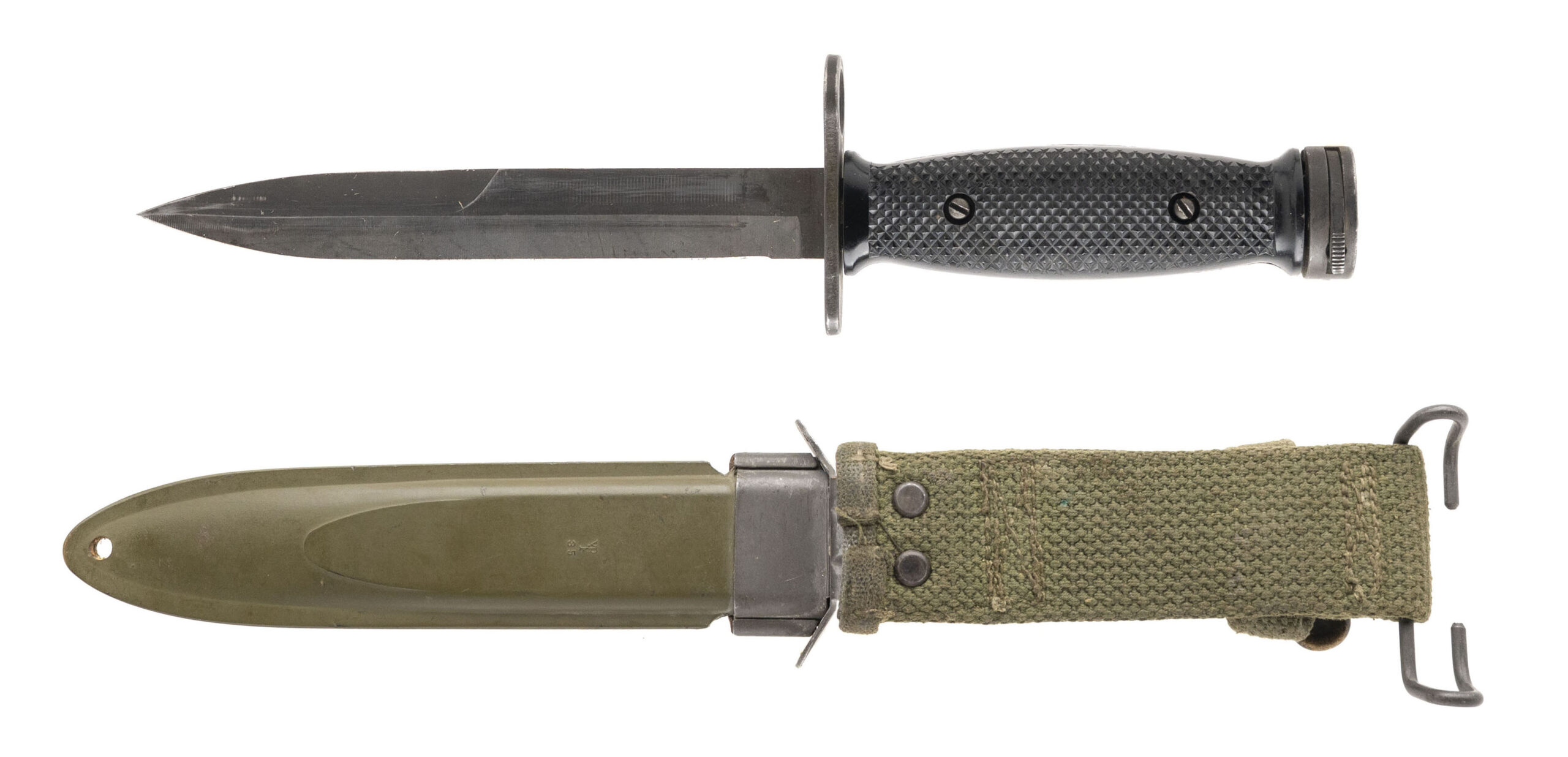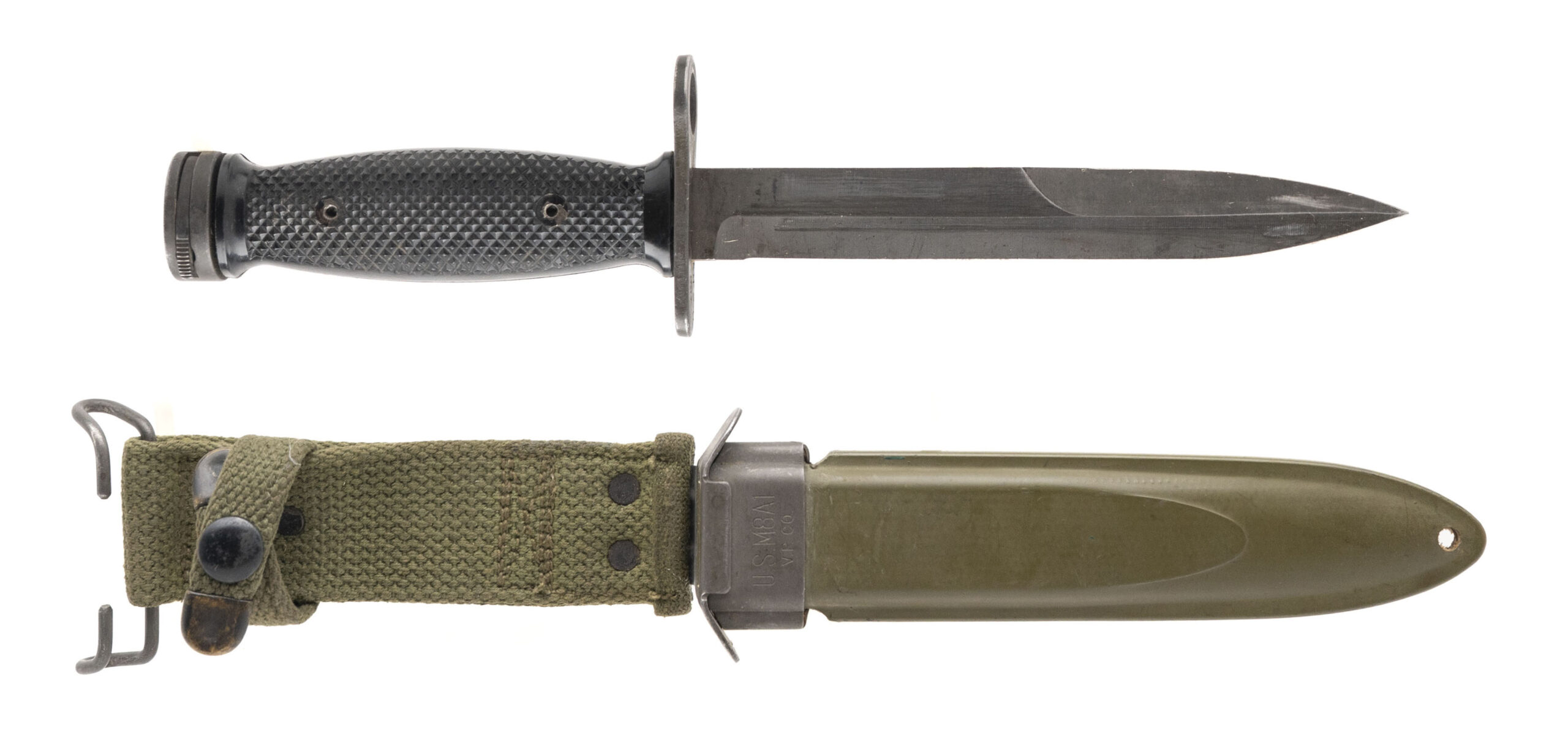 Original Post-Korean war era M4 bayonet for the M1 Carbine. 6.5” blade with black plastic grip scales and crossguard marked U.S. M4 TMN. Sheath is an early M8A1 sheath before the metal reinforcement was added to the tip and is marked US M8A1 V.P. CO. Overall condition is very good with light wear.