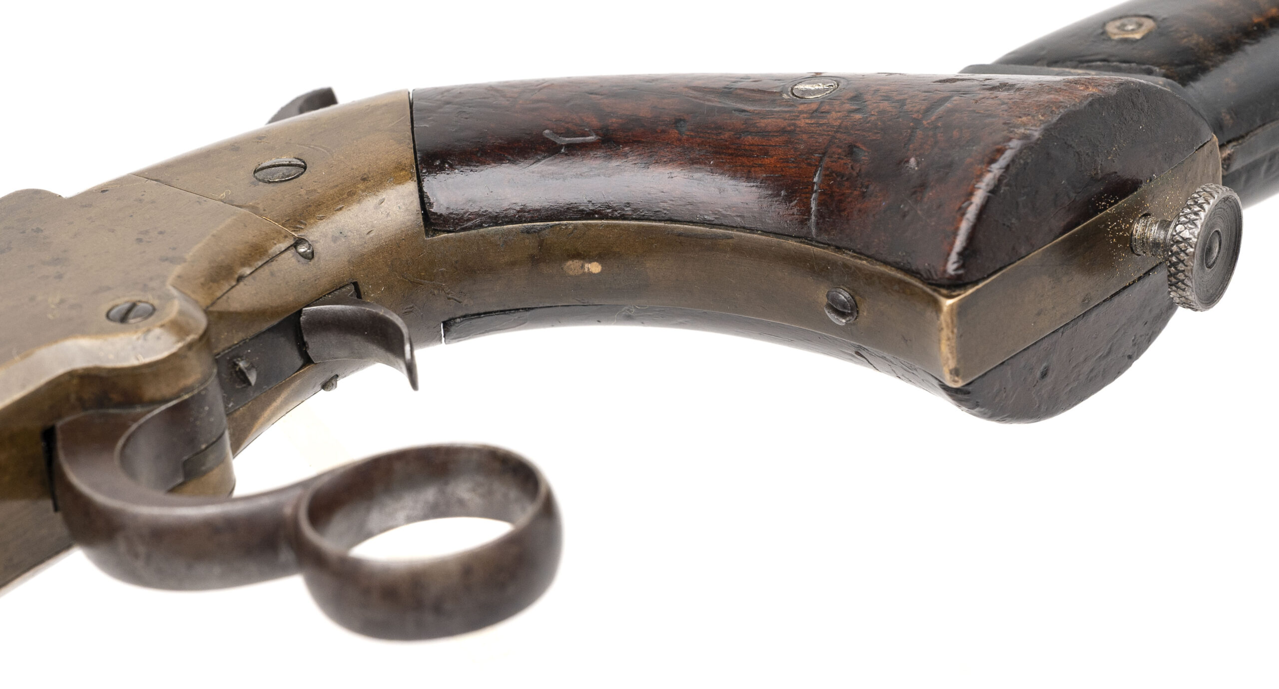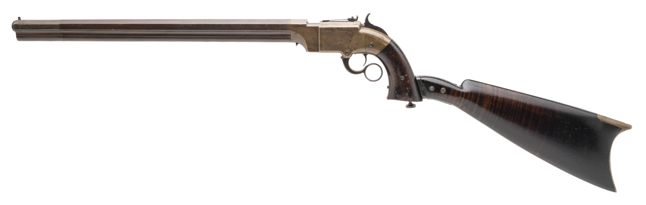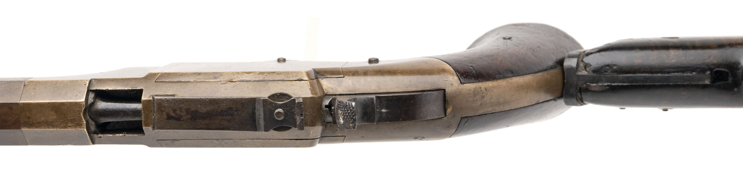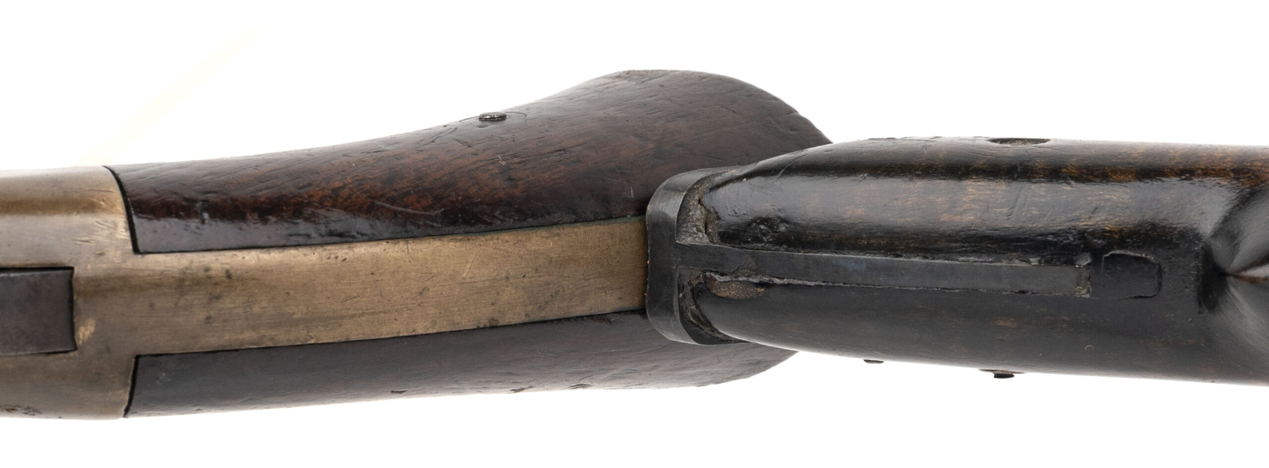 Serial number 39. Made circa 1855-1856. 41 caliber with a 16.5” barrel. The barrel of this gun has been cleaned and the markings restored. The barrel has a plum colored restored patina. The frame is very good. The stock is a well made replacement with and original butt plate. This is a very good Pistol carbine with some restoration!