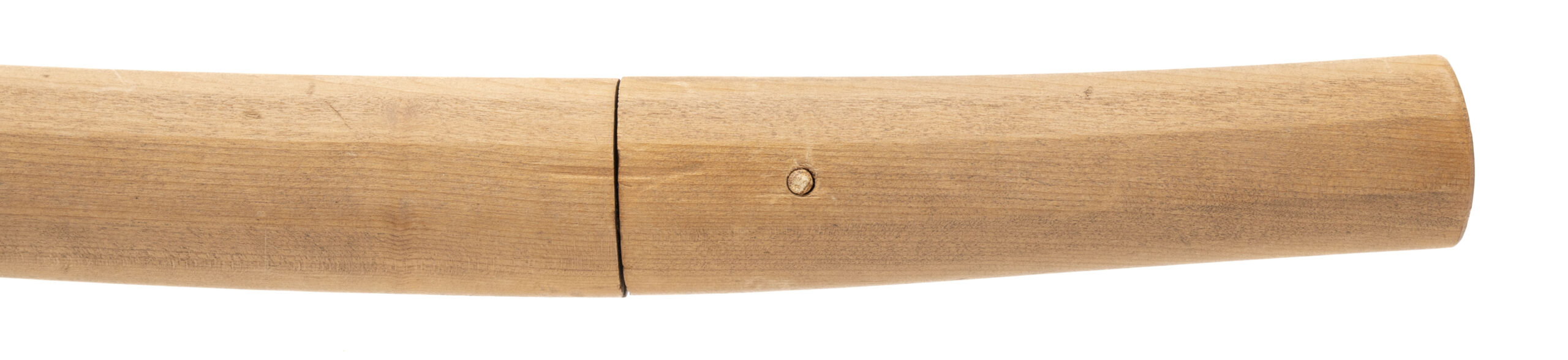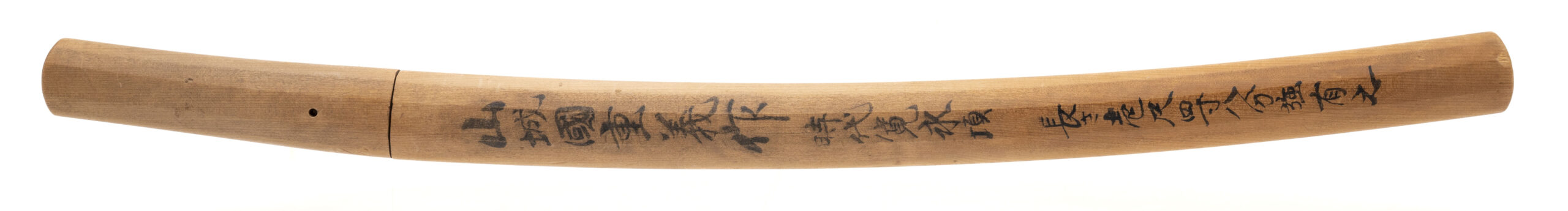 Nagasa 44.2 cm (17.4”). Signed by attribution on the shirasaya: 山城国重義作 (Yamashiro no Kuni Shigeyoshi saku), with note of production in the Kan’ei period. Forged in the Yamashiro tradition with slender sugata, shallow koshi-zori, and standard kissaki. The hamon is an undulating notare-midare, visible in the present polish, with ji activity consistent with early Shintō workmanship. The nakago is ubu with one mekugi-ana, finished in ha-agari kurijiri and bearing a fine, even patina.