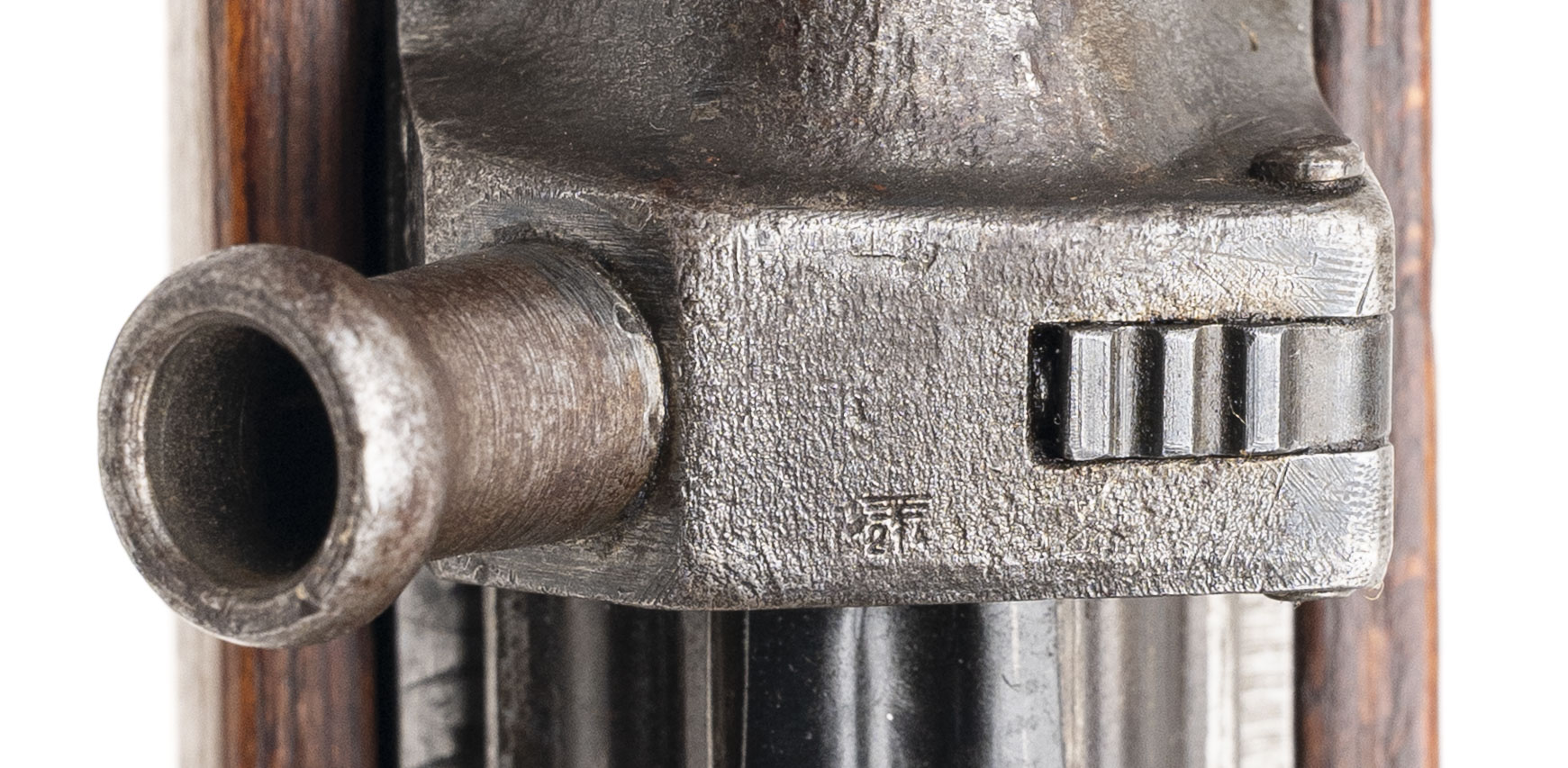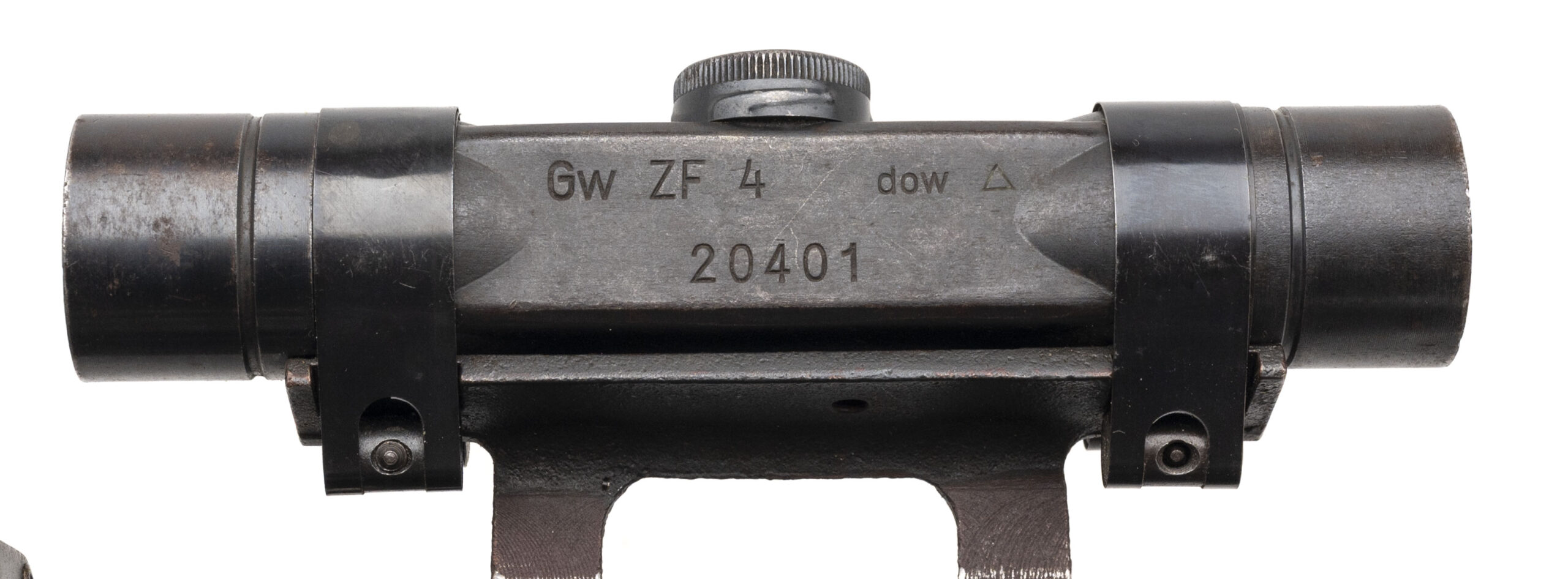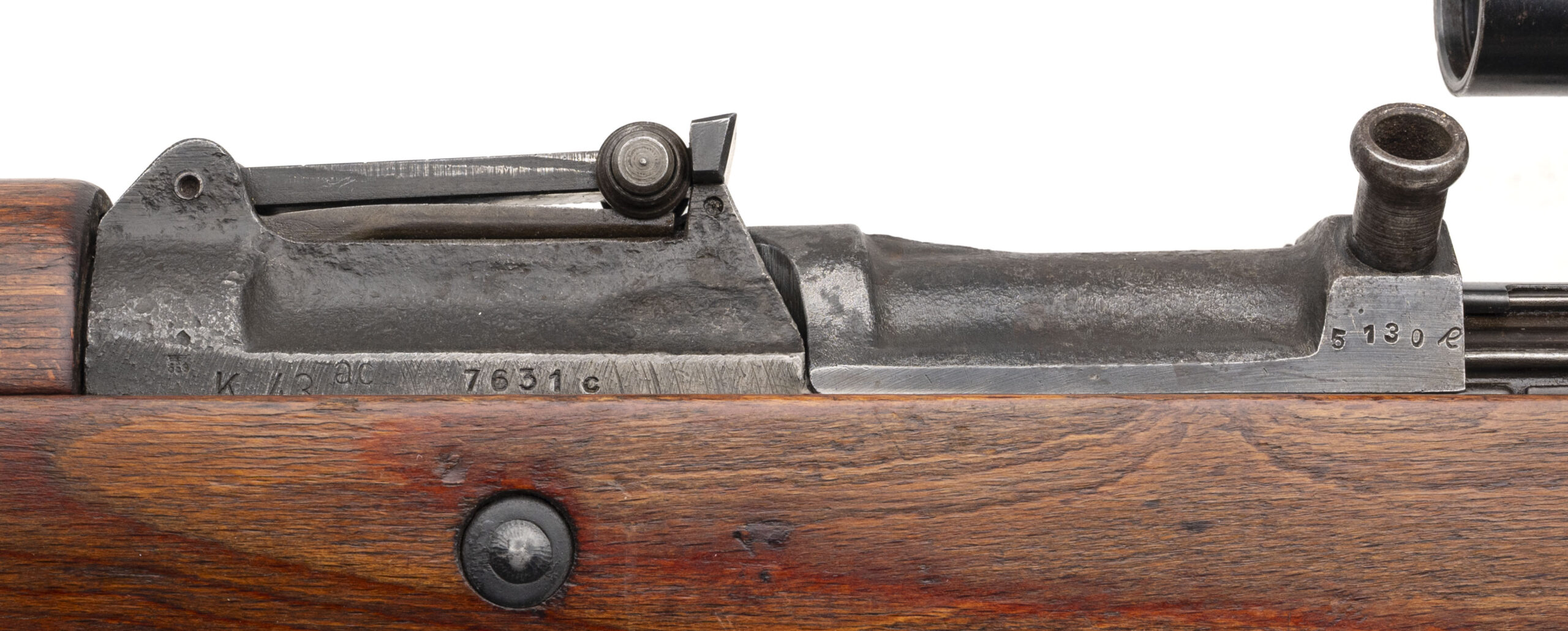 Serial Number 7631c. This Karabiner 43 (K43) was made in 1945 with a 22-inch round barrel that has a bright bore with strong visible rifling. The receiver has a stacked "ac45" marking on the left side & a correct eagle over 359 WaffenAmt acceptance stamp on the left. Comes with a ZF4 telescopic sight made by Opticotechna that is paired with a 1947 dated Czech mount. The 10-round detachable box magazine is marked "K43" & "gcb" for Adolf Grohmann & Sohn. Overall condition is excellent with original factory finish still present on the metallic parts & a fine looking laminated beechwood stock with a handguard that is matching in color. Comes with a USGI musette bag strap that has been modified to function as an improvised rifle sling.