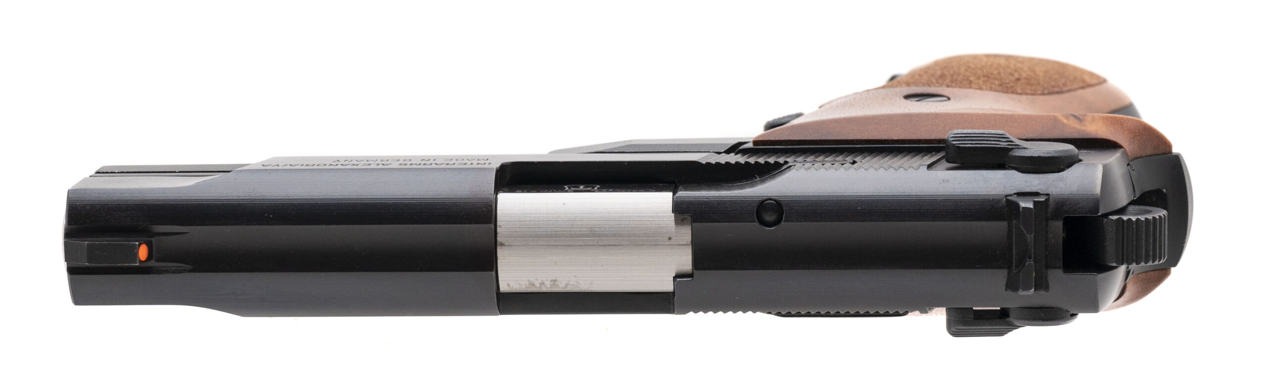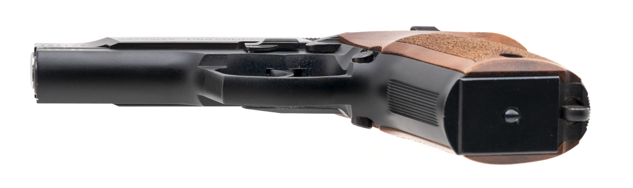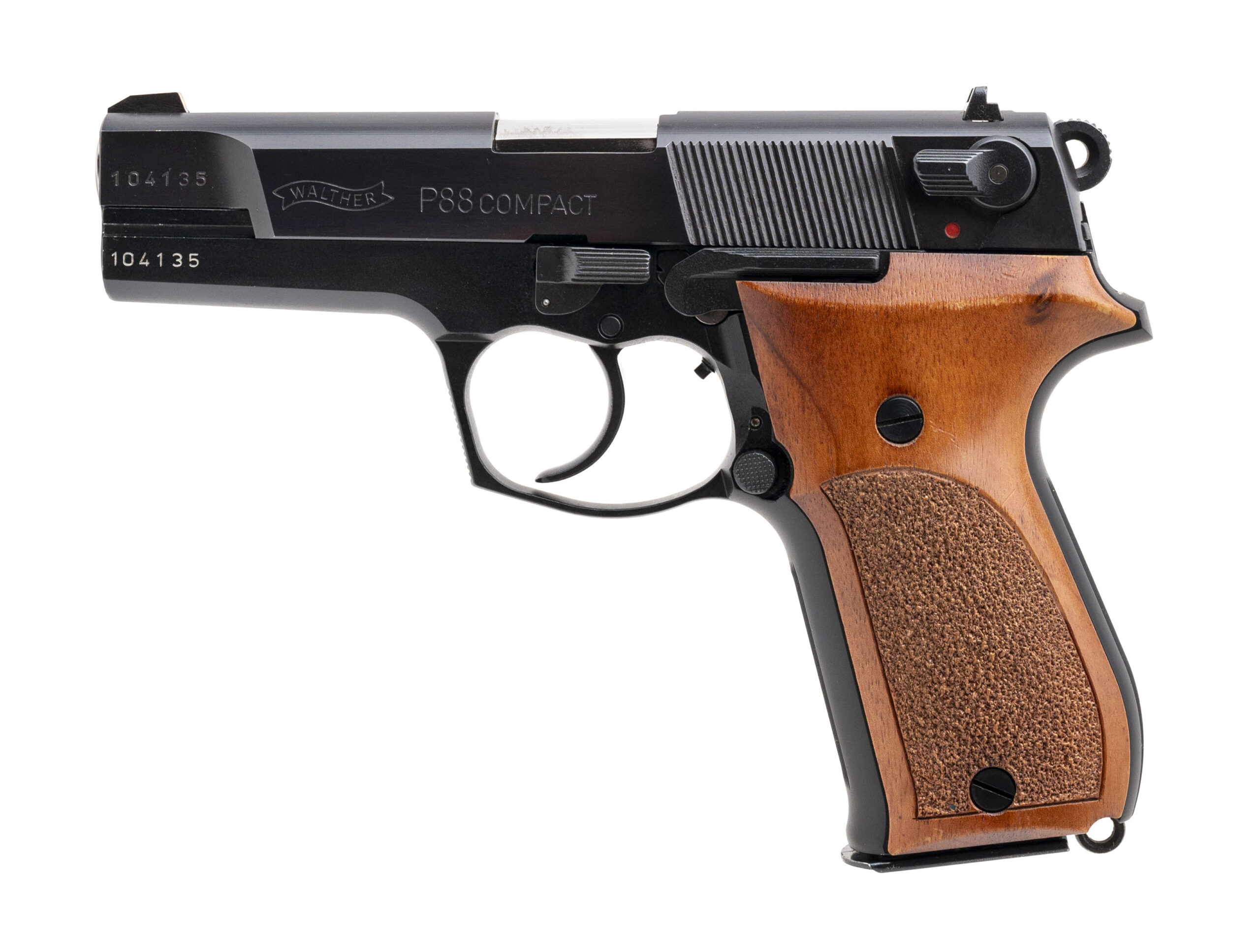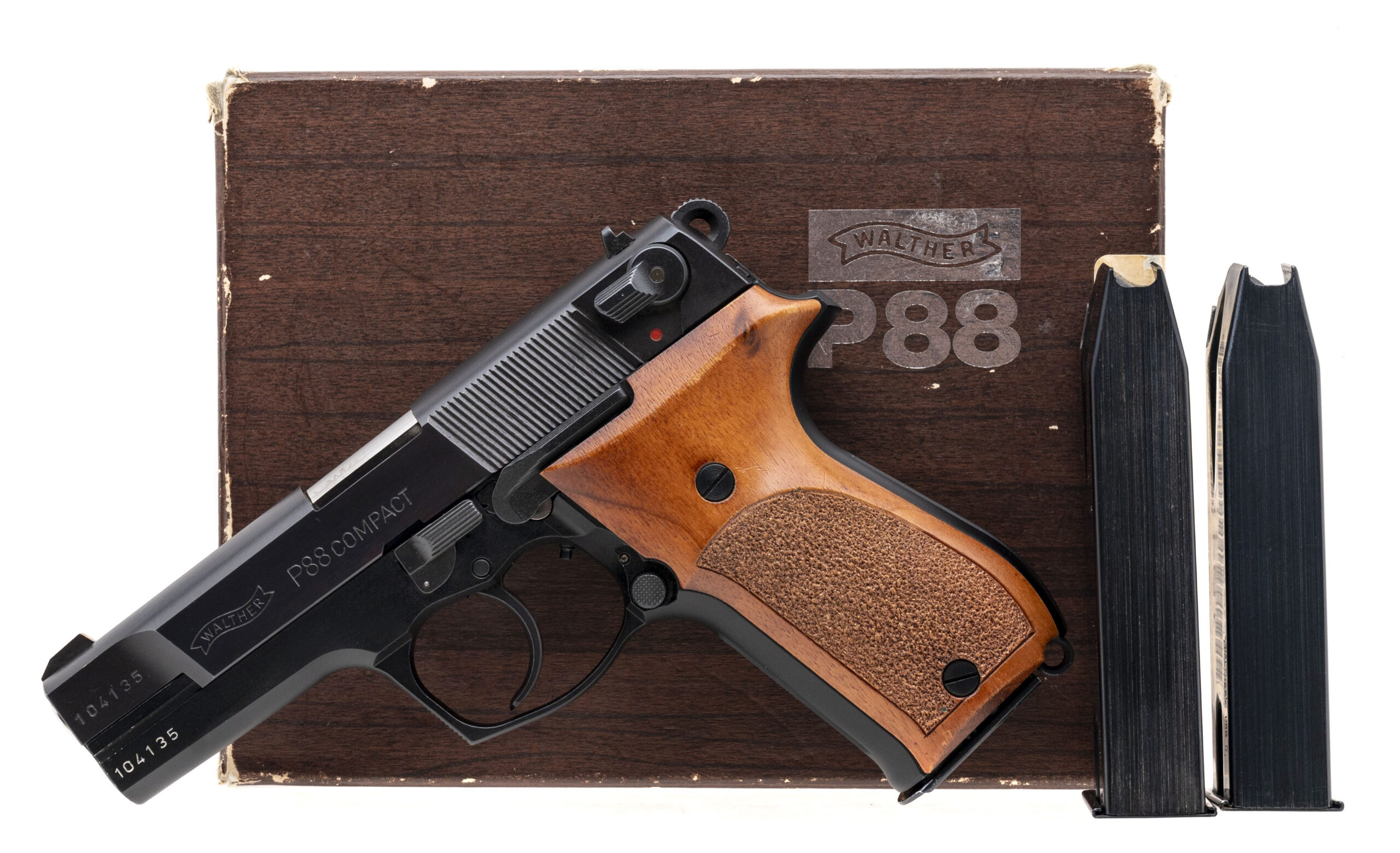 SN: 104135. Made in 1995. 9mm with a 3.9" barrel. Bore is bright with strong rifling. Desirable German made double stack compact handgun with teddy Jacobson action job. Finish and grips are in very good condition with only minor handling wear. Comes with box, and 2 extra magazines. Overall very good condition.