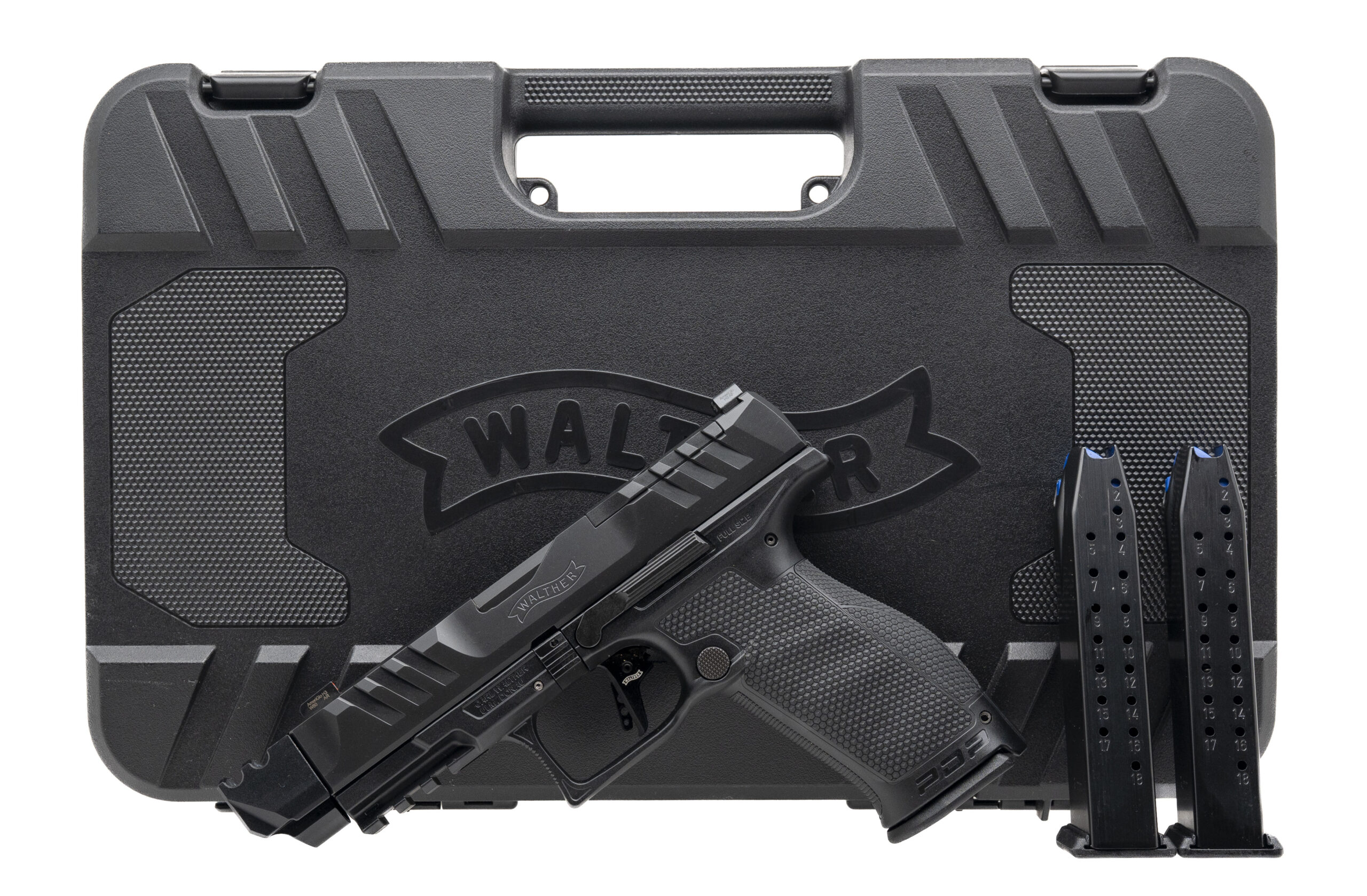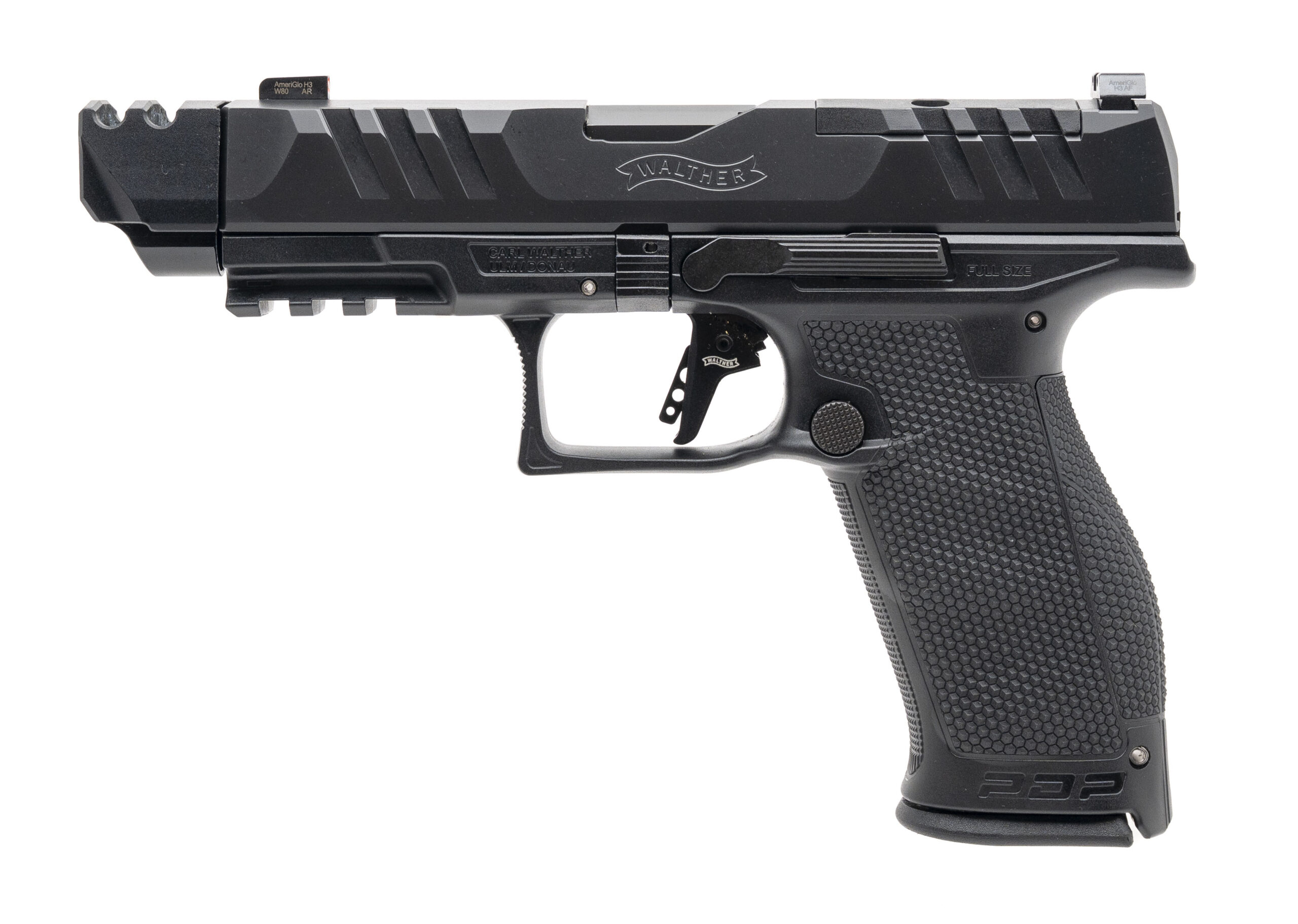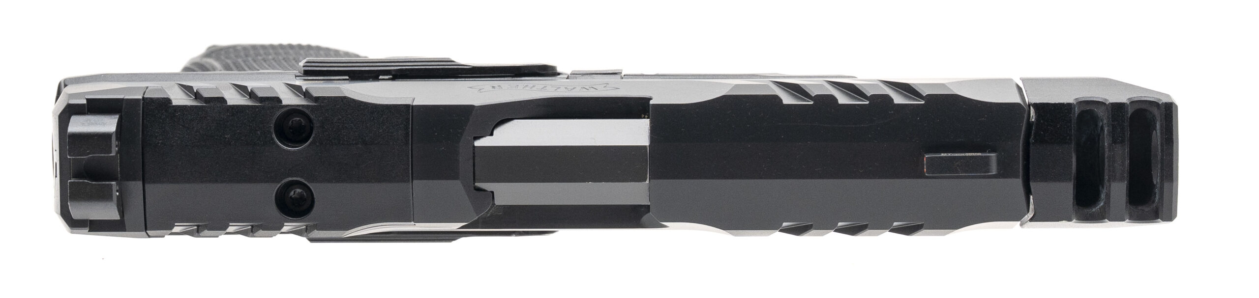 SN: 74039WA. Modern production, 9mm with an 4" PMM threaded barrel w/two port compensator. Bore is bright with strong rifling. German made carry pistol with an optic cut, Ameriglo night sights, and an upgraded PDP Pro flat-faced performance trigger. Excellent condition overall. Comes with case, Low Rider low profile RMR optic plate, and two extra magazines.