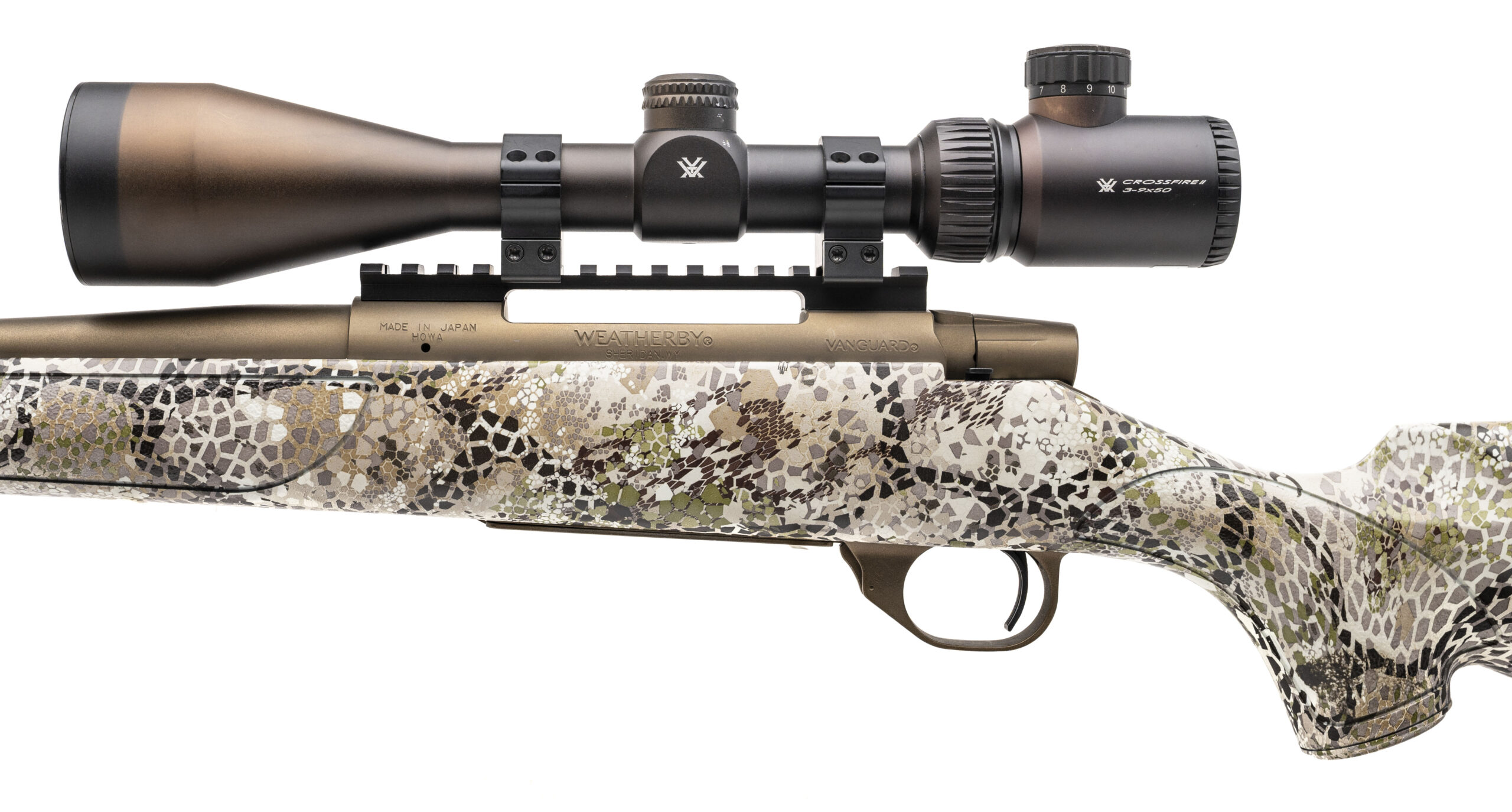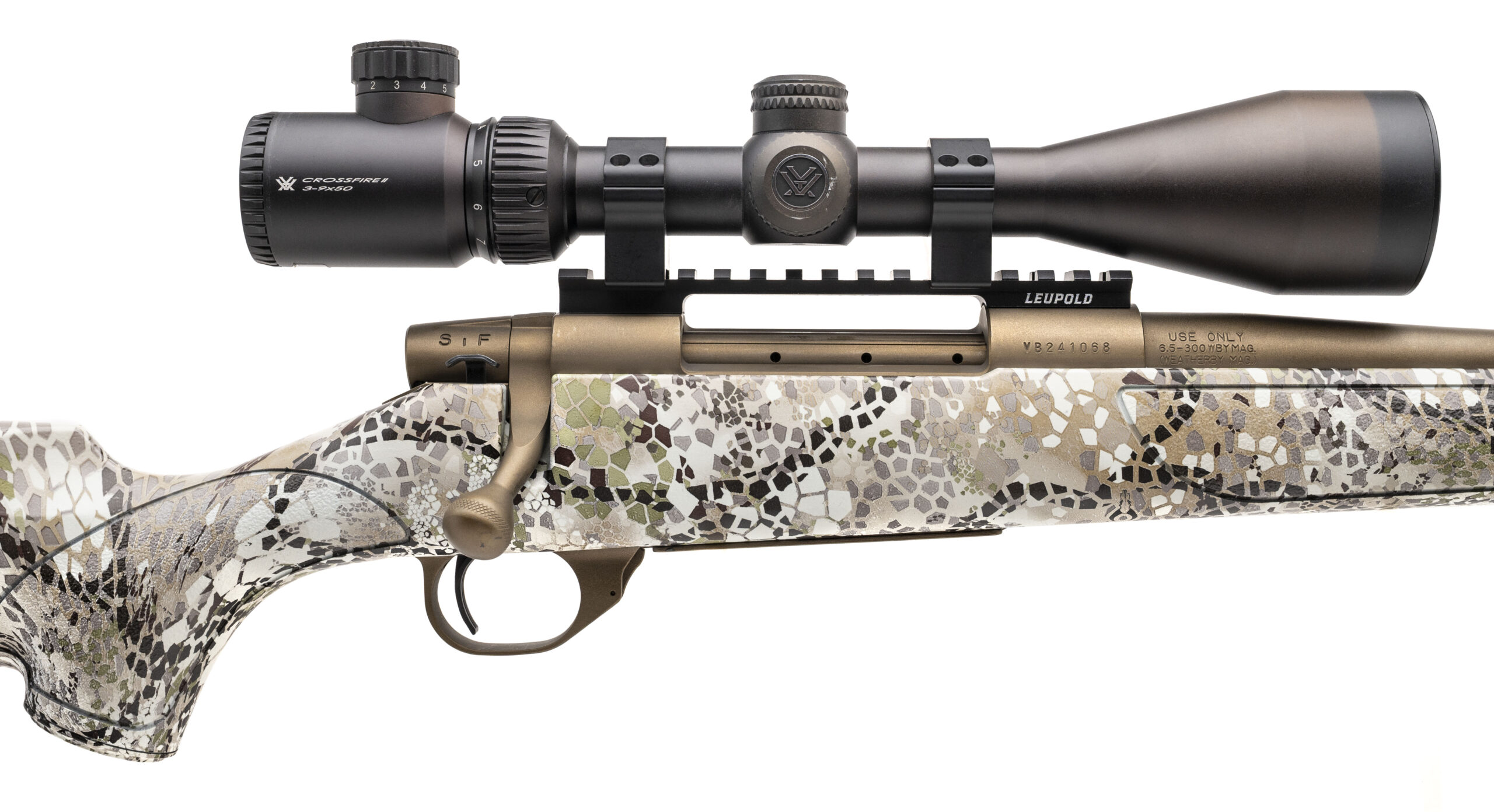 SN: VB241068 modern production made in Japan. Bolt action hunting rifle chambered in 6.5-300 Wby. with a 26" round barrel, Bronze metal finish in a synthetic Badlands camo stock with a Leupold one piece picatinny rail and Vortex Crossfire 3-9x50 scope. Overall in near excellent condition with an excellent bore.