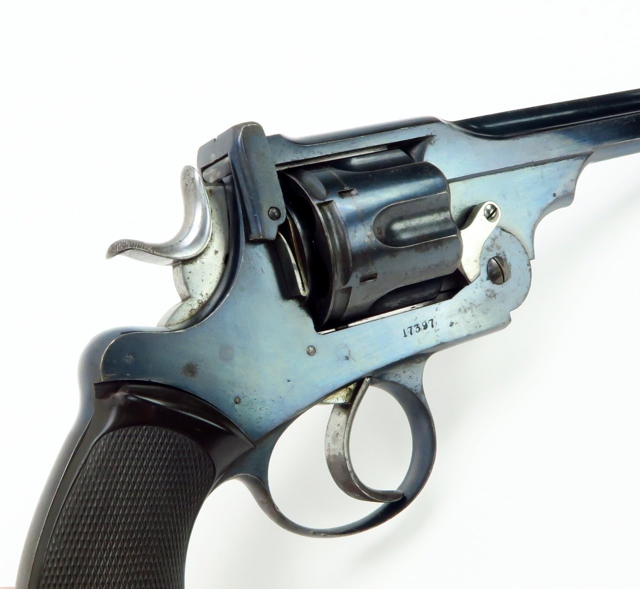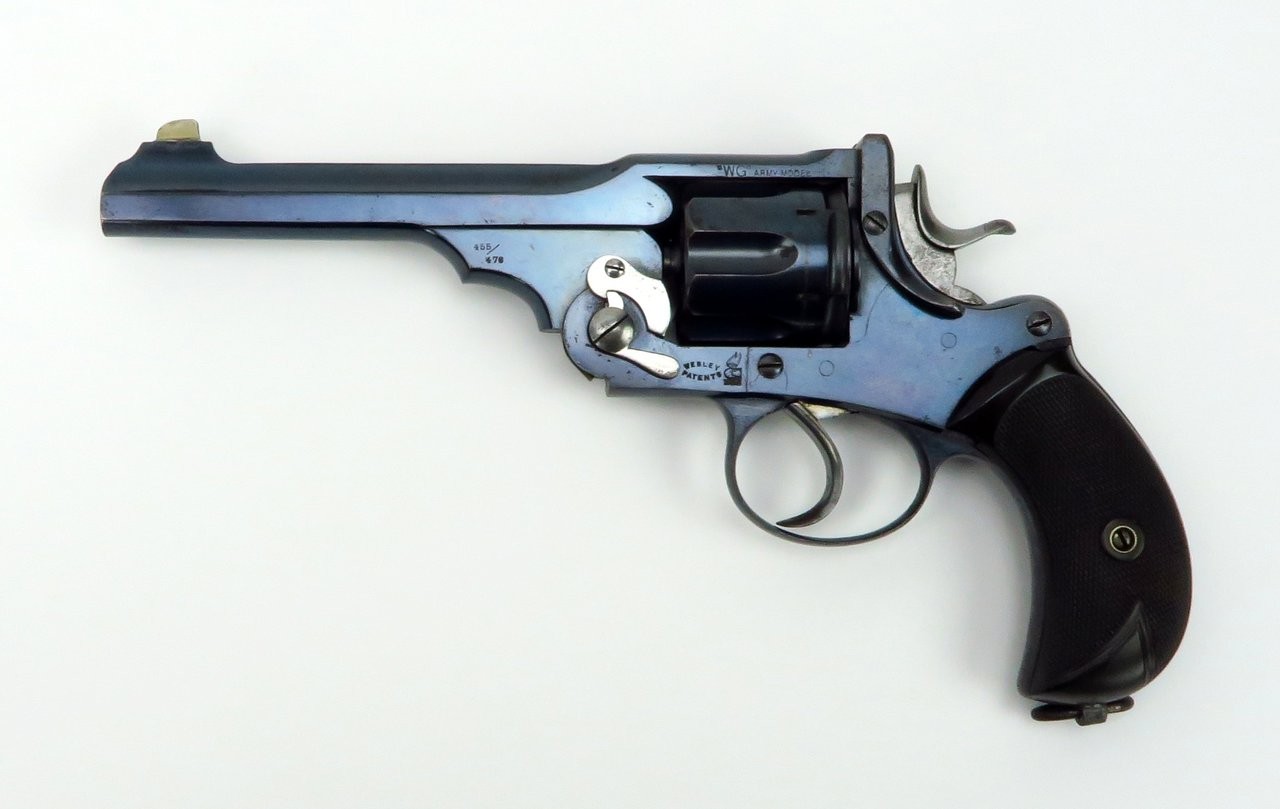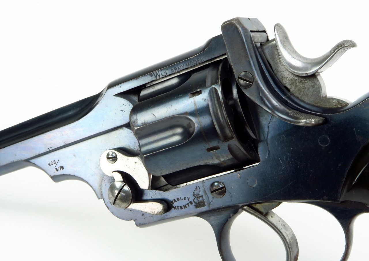 Webley 1896 WG Army. .455 caliber revolver. Bore is about very good action works perfectly. Grips have a tiny chip on each side at the top. Gun has 92-93% blue. Much better condition than most WG revolvers.