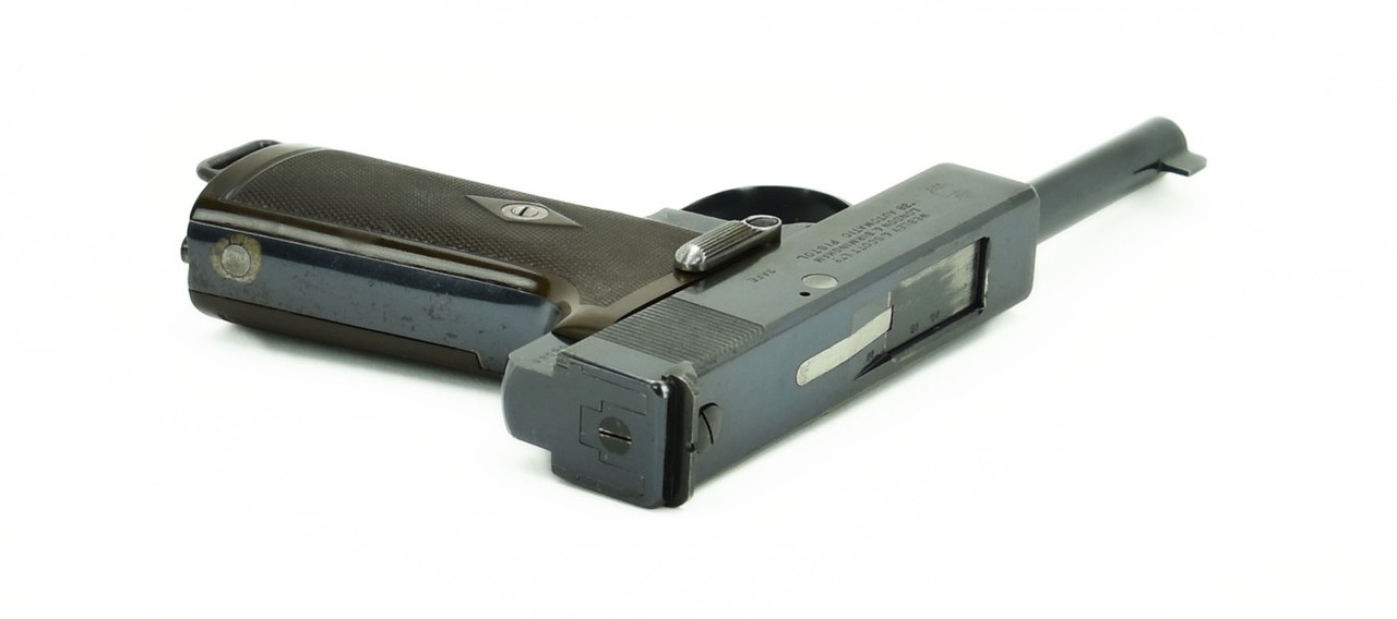 Webley Auto Pistol .38 Auto caliber pistol. This is a model 1910 Webley. It is the last variation on the 1910 model. It is referred to as a Type III. The gun has an excellent bore and excellent grips. The pistol has approximately 85-90% blue with some blue-brown patina on the sides of the slide. The gun rates very good plus overall. The caliber is .38 Auto. It is a scarce low production gun.