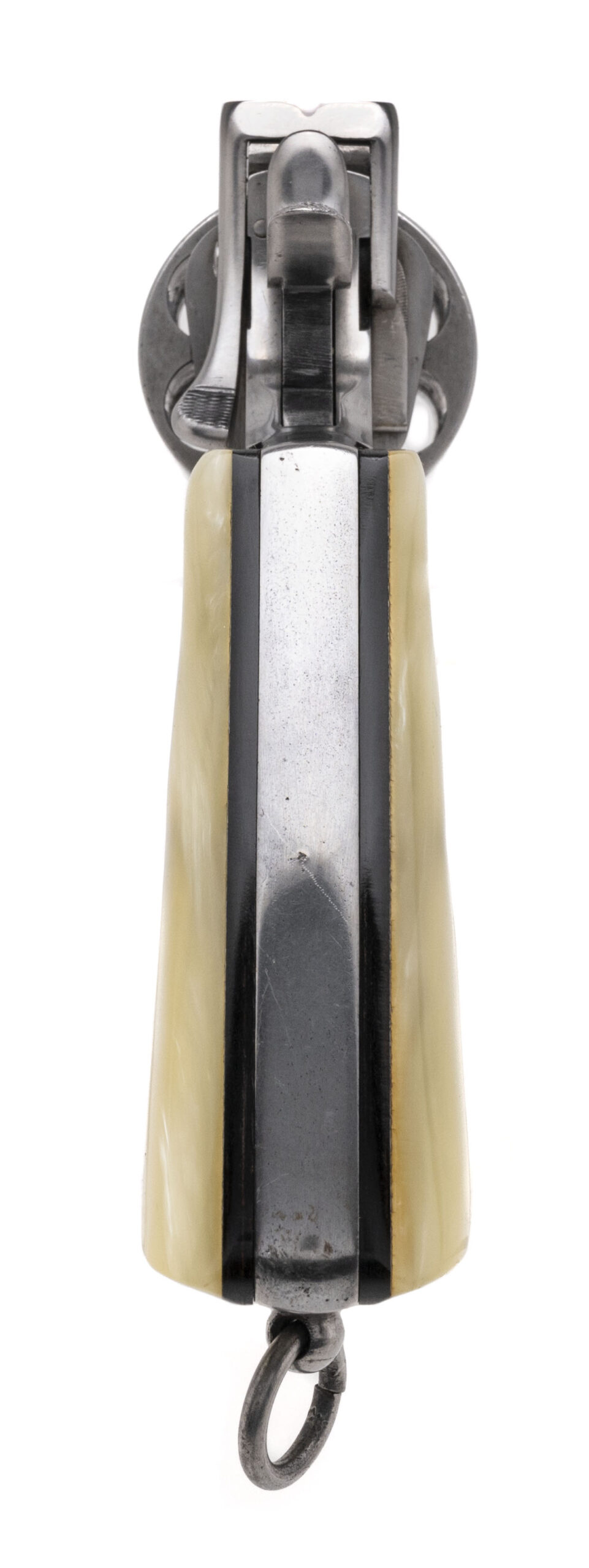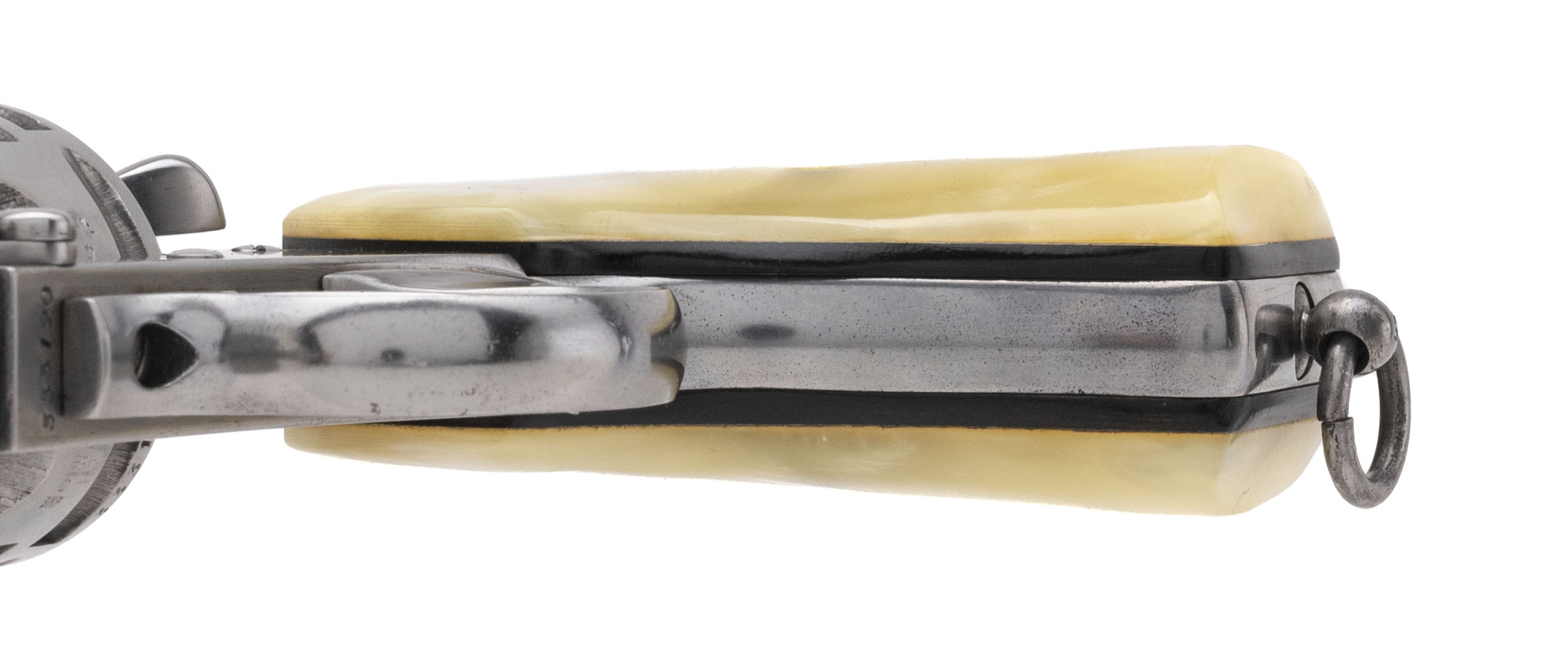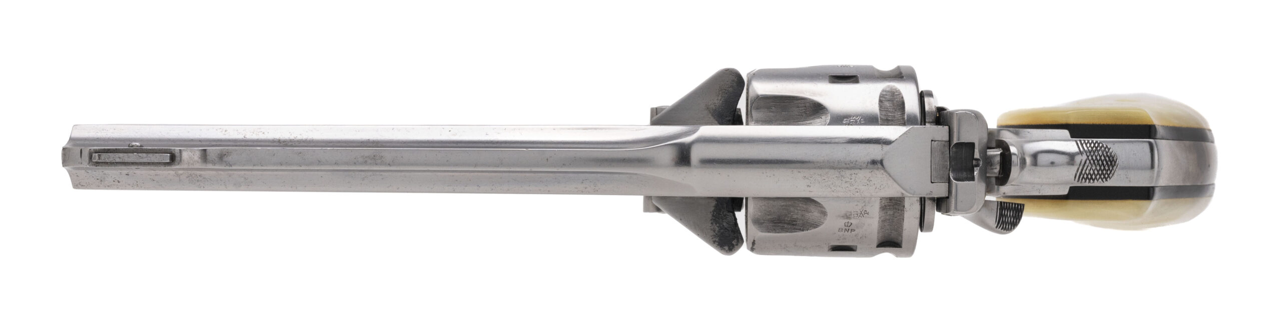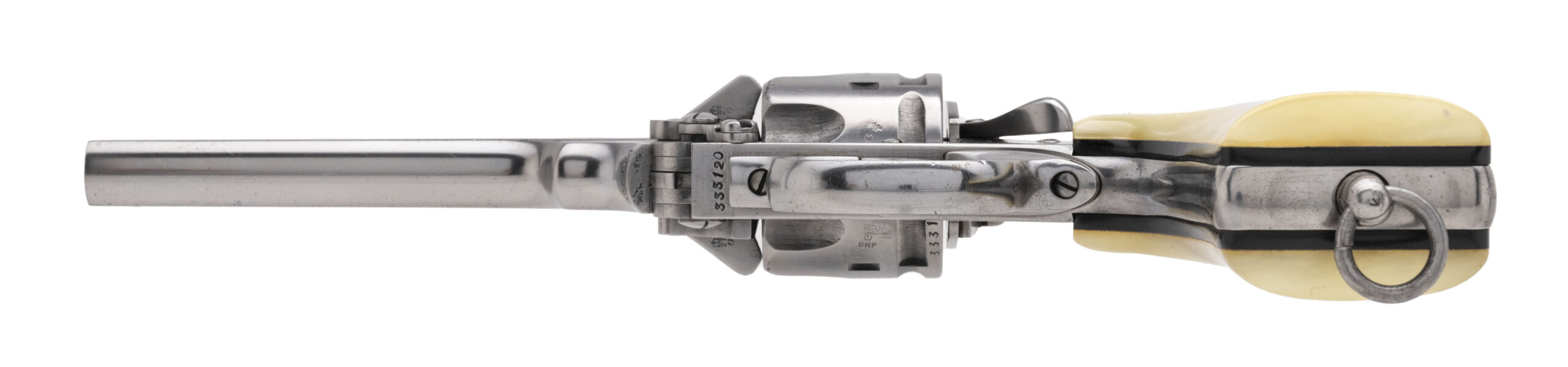SN: 333120. Made in 1918, .455 Webley with a 6" barrel. The bore is very good, bright and shiny with light wear. The metal has been nickel plated and the grips are imitation pearl. The cylinder has some play, but the action works correctly. Overall very good condition. A neat looking British military revolver.