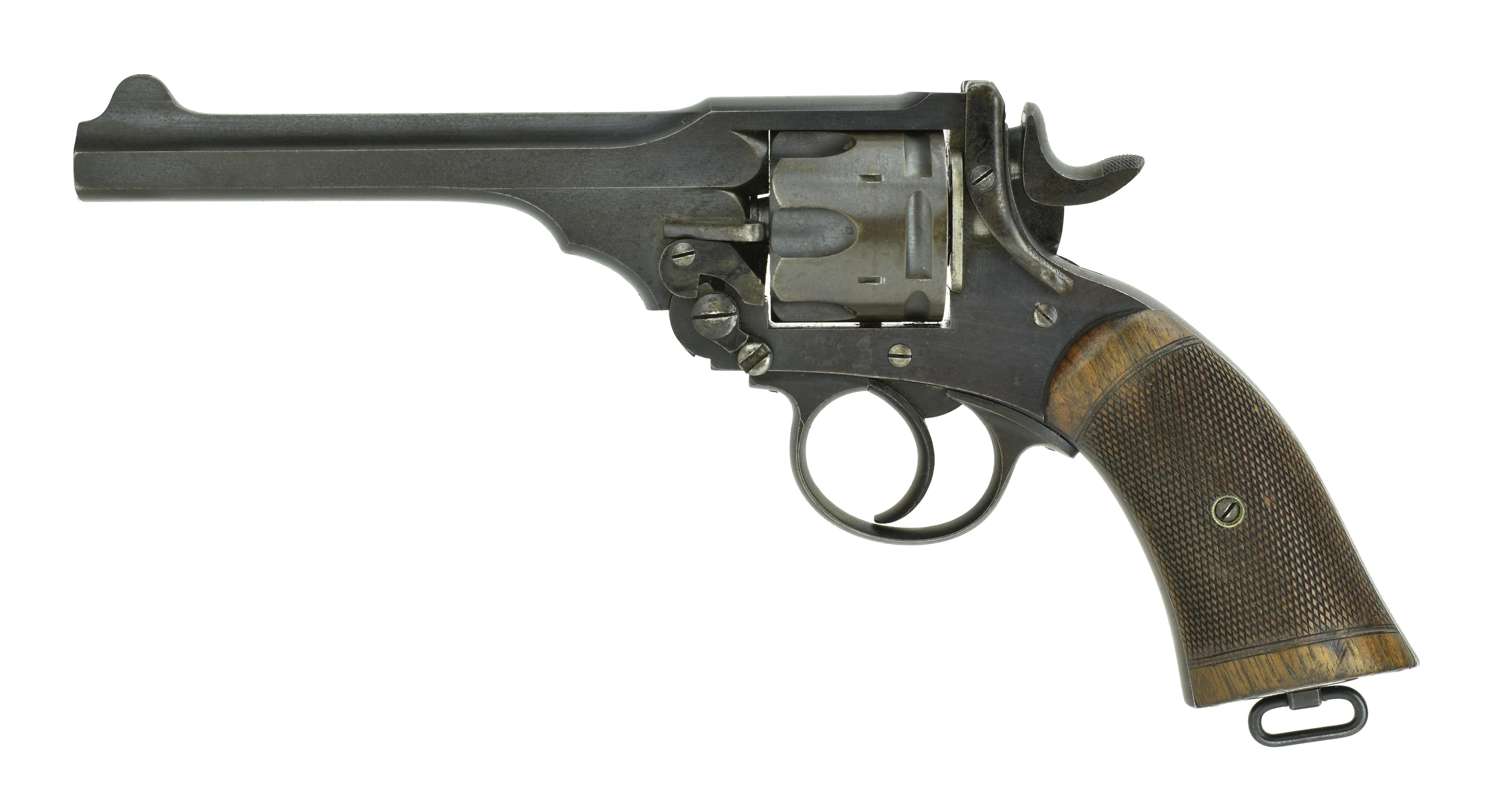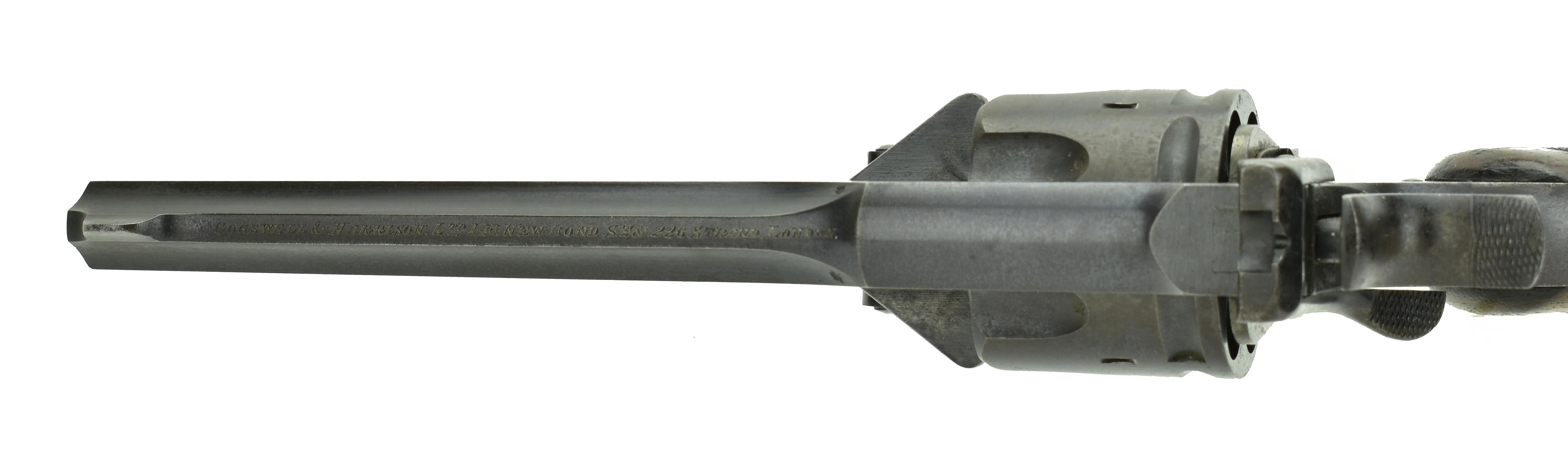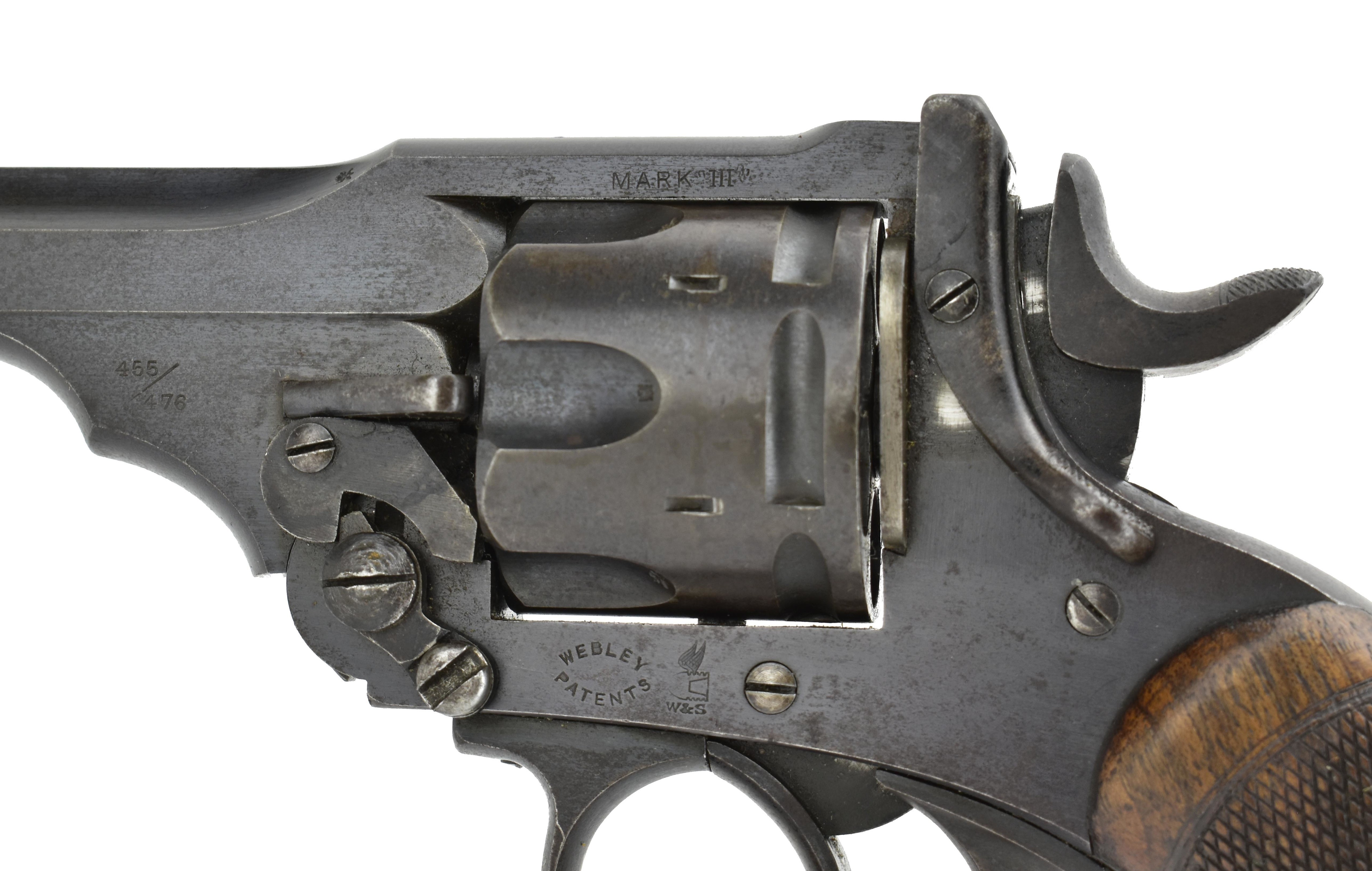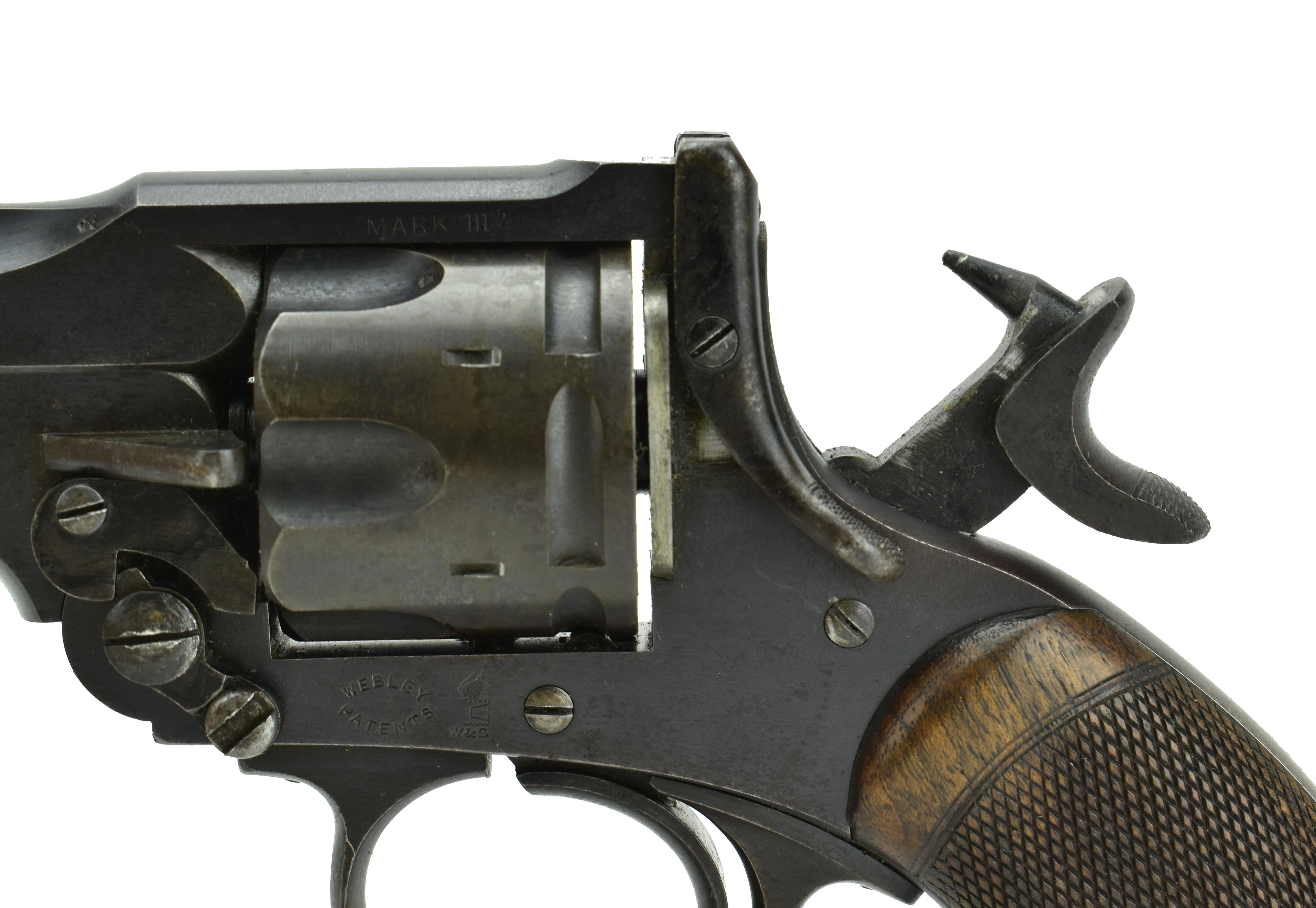 Webley MKIII .455 Webley caliber revolver. Scarce model with slant grip. Marked “Cogswell & Harrison” on the barrel rib. Bore and action are excellent. Has a Mark II cavalry hammer. Very good condition with about 90% blue mixed with patina. The backstrap is inscribe “R. Deberot Hoyell”. An interesting and historical British revolver.