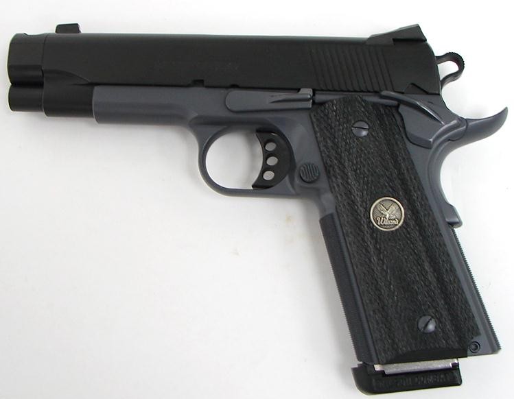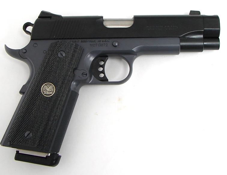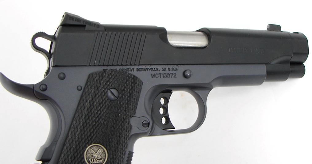 Wilson Carry Compensator .45 ACP caliber pistol. 4" carry model with short compensator and full size grip. Has black and gray finish and single side safety. New.