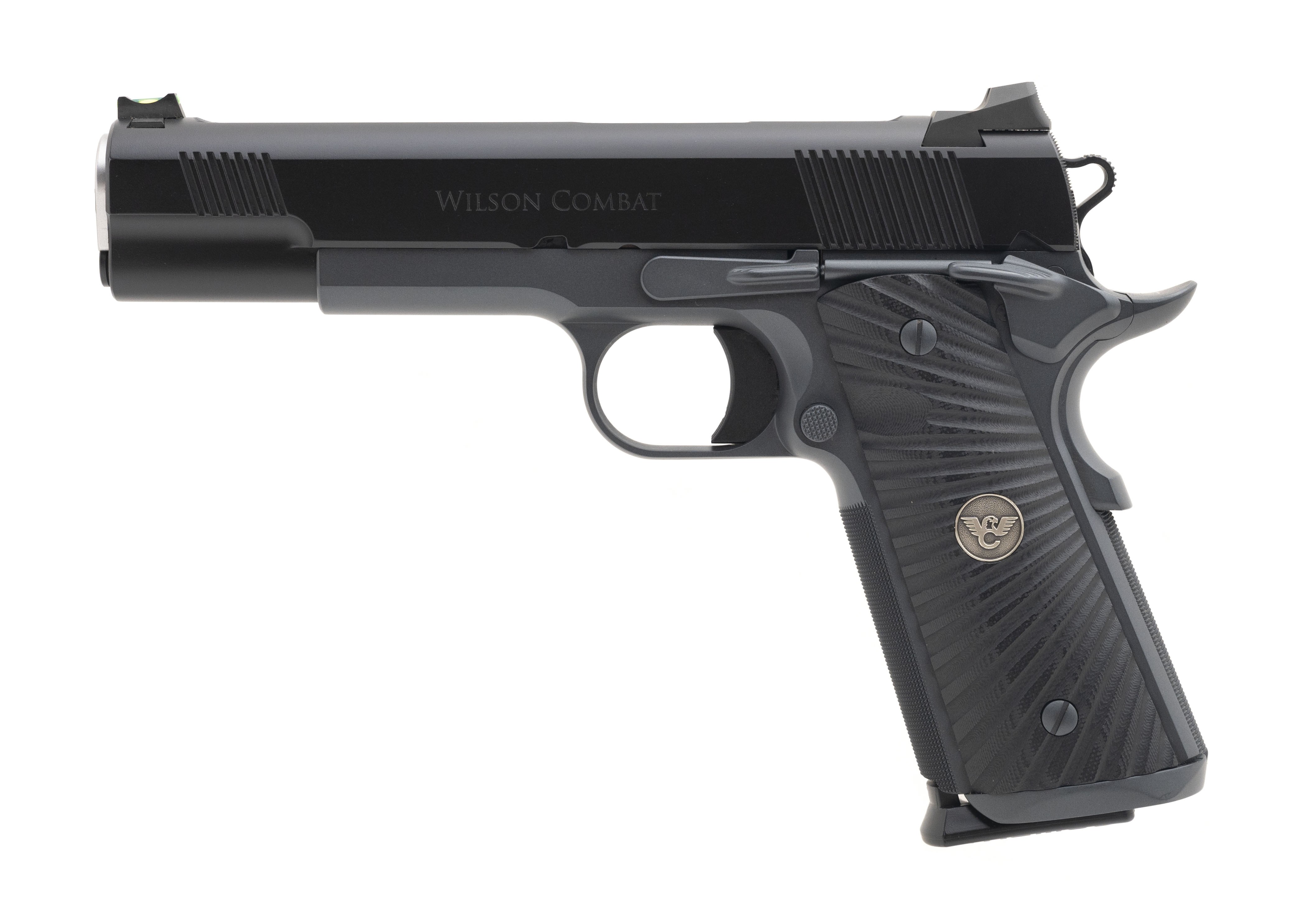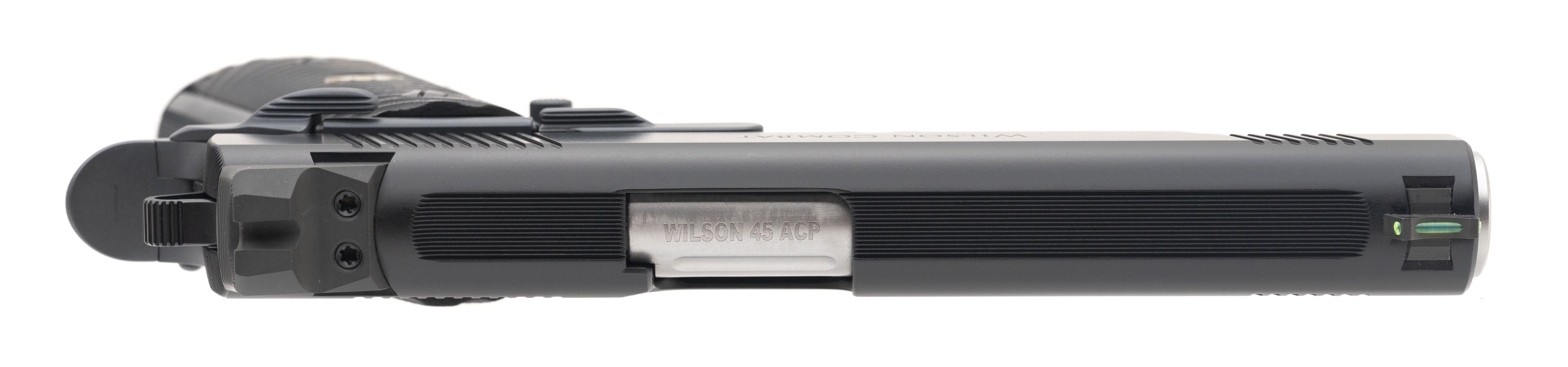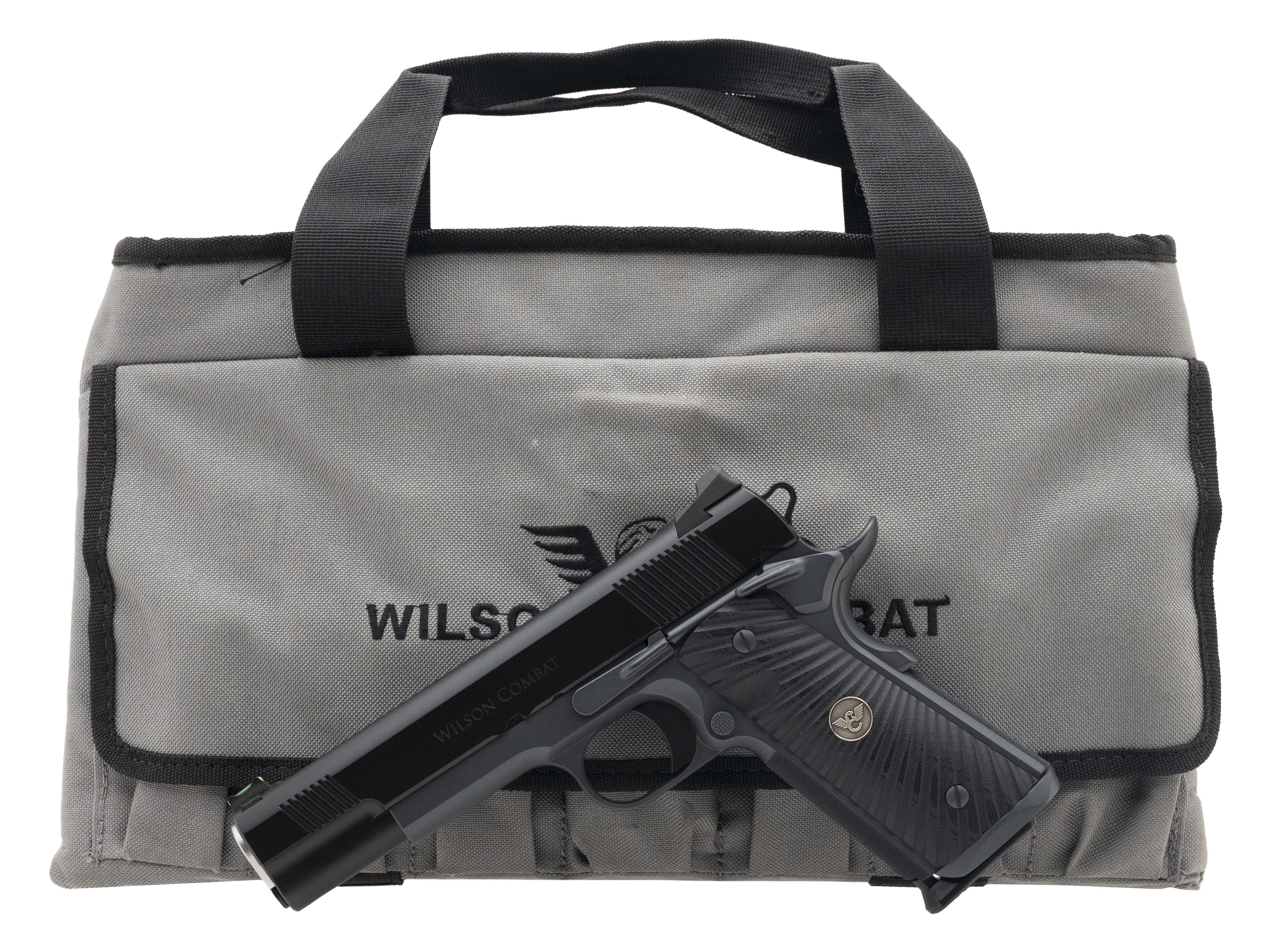 SN:WC63322. Manufactured 2015, .45 Auto with 5' barrel. Bore is in excellent condition. Premium two tone 1911 with hand fit 5" government match barrel, black G10 Starbursts flat bottom grips, battlesights with fiber optic front sight, fluted chamber and skeletonized hammer. Overall condition is excellent. Comes with Wilson combat range bag.