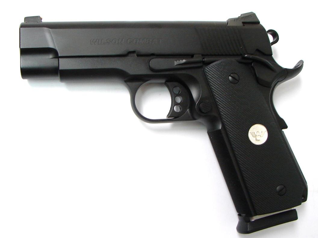Wilson Combat Professional 9MM caliber pistol. 4" lightweight carry model in popular 9MM caliber. Has "carry" cuts on the slide and "round butt" grip frame, single side safety and counter sunk slide stip. All black finish with gold bead front sight. A sleek custom grade carry gun in excellent condition with bag.