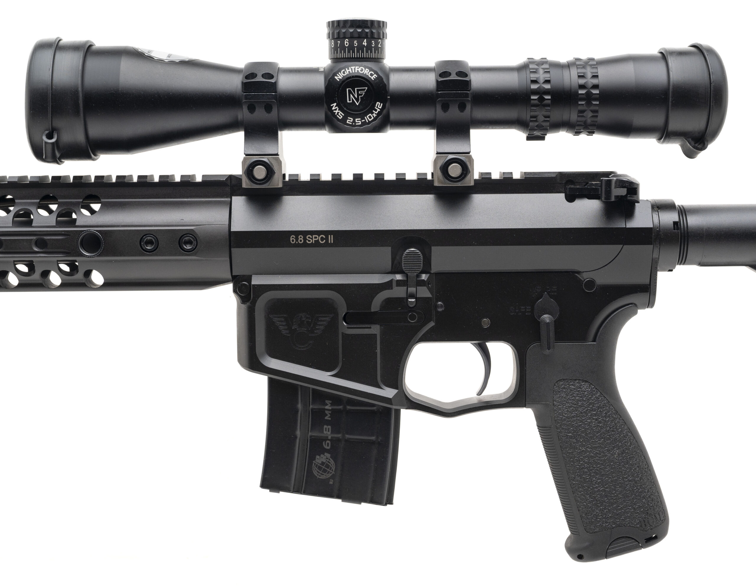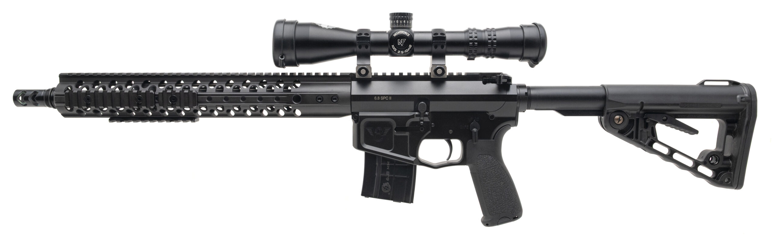 SN: WCB0918. Modern production, 6.8 SPC II (Special Purpose Cartridge) with a 14.5" barrel w/pinned & welded muzzle brake (16" OAL). Bore is very good. Semi-auto tactical rifle with a Night Force NXS 2.5-10x42mm scope and picatinny accessory rails. Near excellent condition overall.
