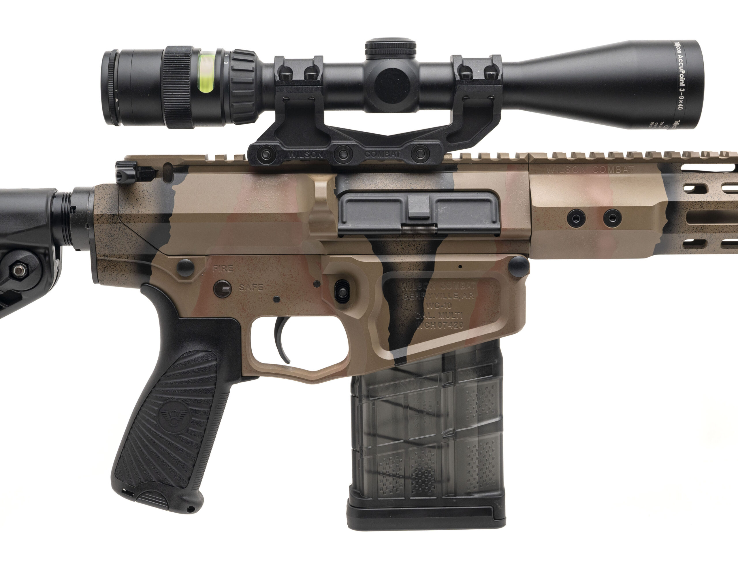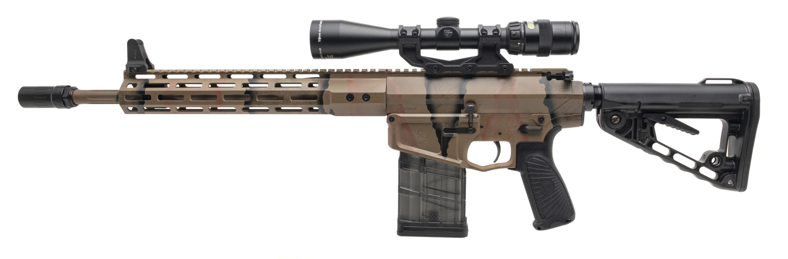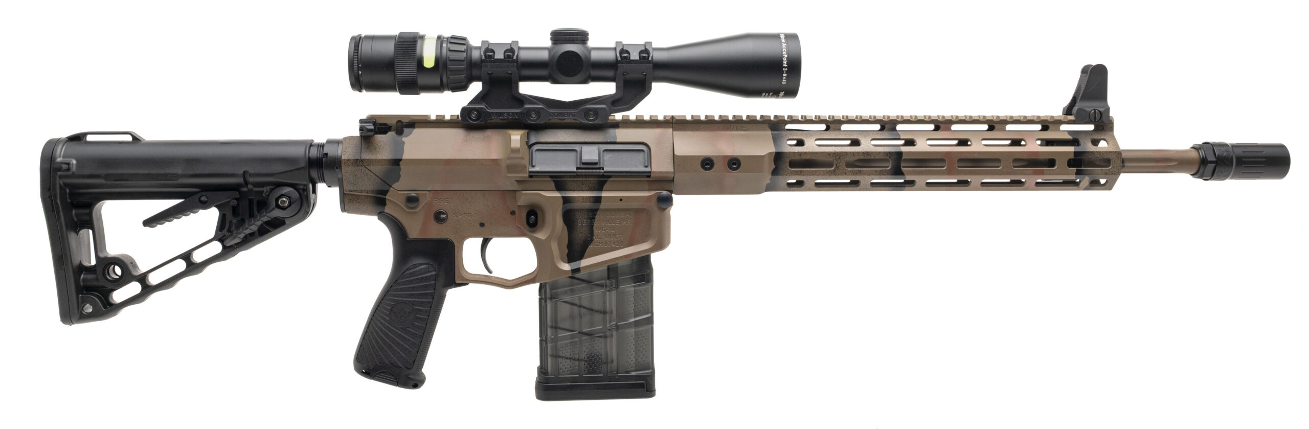 SN: WCH07420. Modern production, 6.5 Creedmoor with a 16" barrel w/blast diffuser. Bore is very good. Semi-auto tactical rifle with a Trijicon AccuPoint 3-19x40mm scope, Daniel Defense front sight, and camo pattern Armor-Tuff finish. Excellent condition overall.