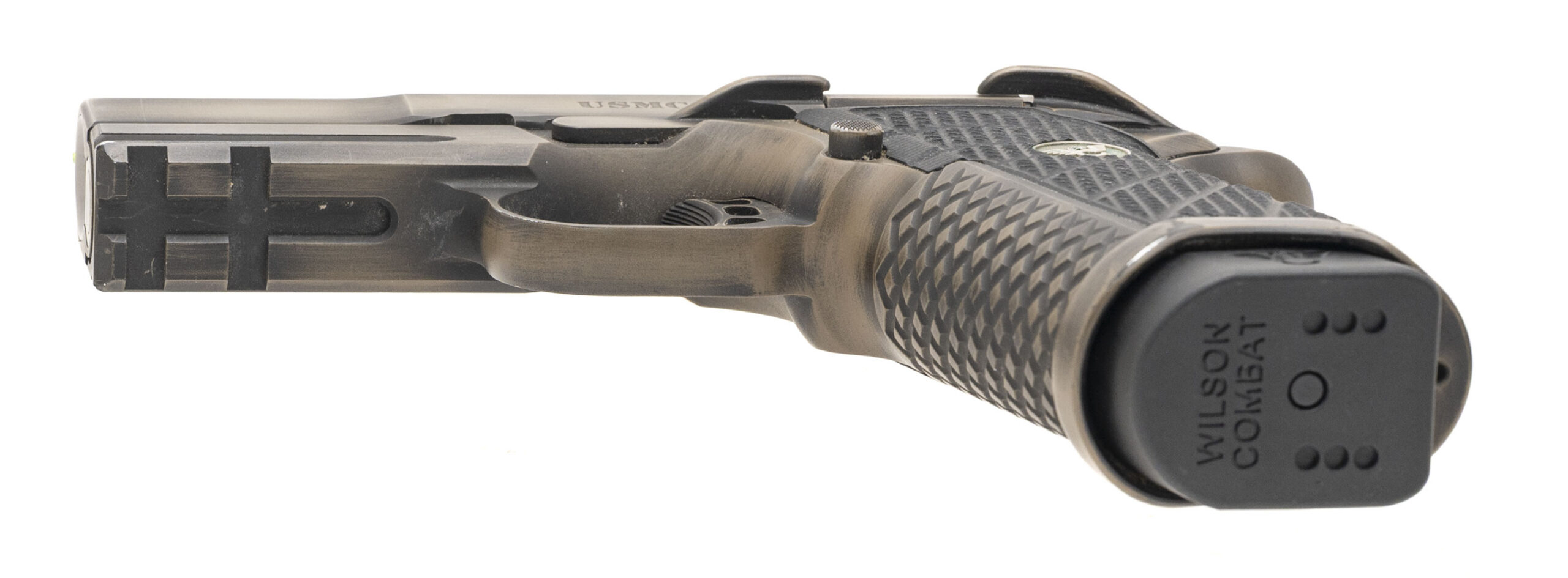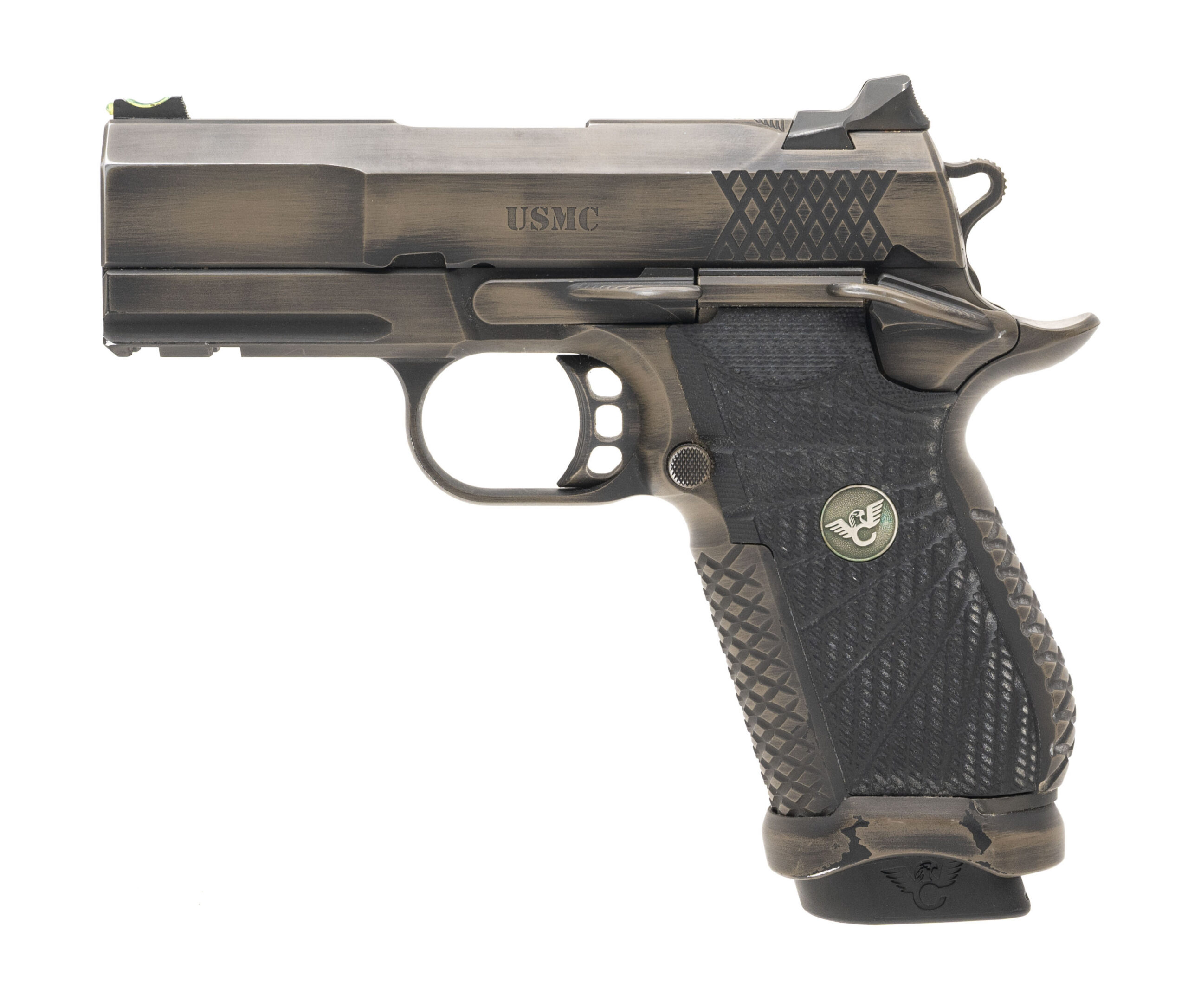 SN: WCX21785. Modern production, 9mm with a 3.25" fluted/crowned barrel. Bore is very good. Compact alloy frame single action pistol with fiber optic front sight, distressed cerakote finish, flared magwell, and aluminum grips. Has USMC (U.S. Marine Corp.) engraved on the slide. Very good condition overall.
