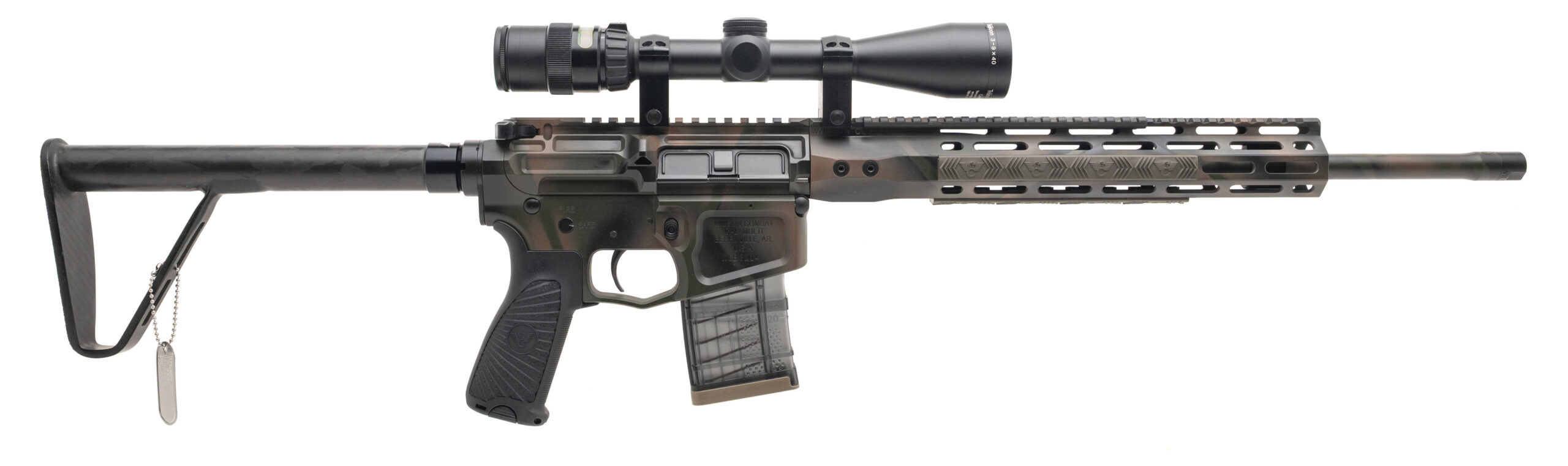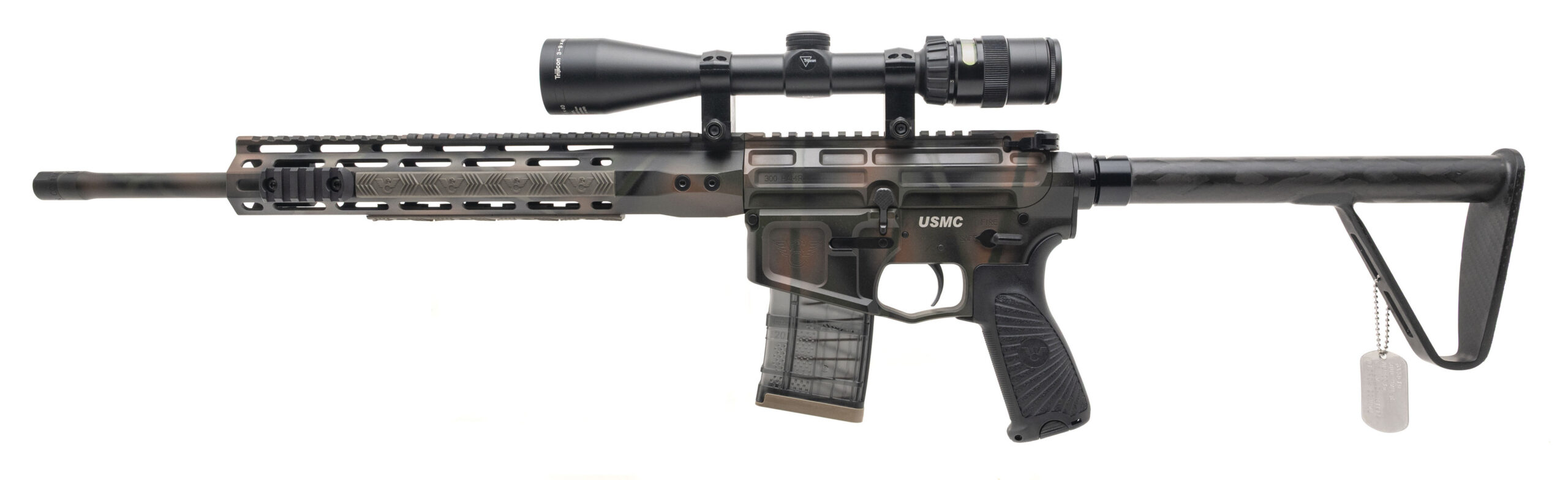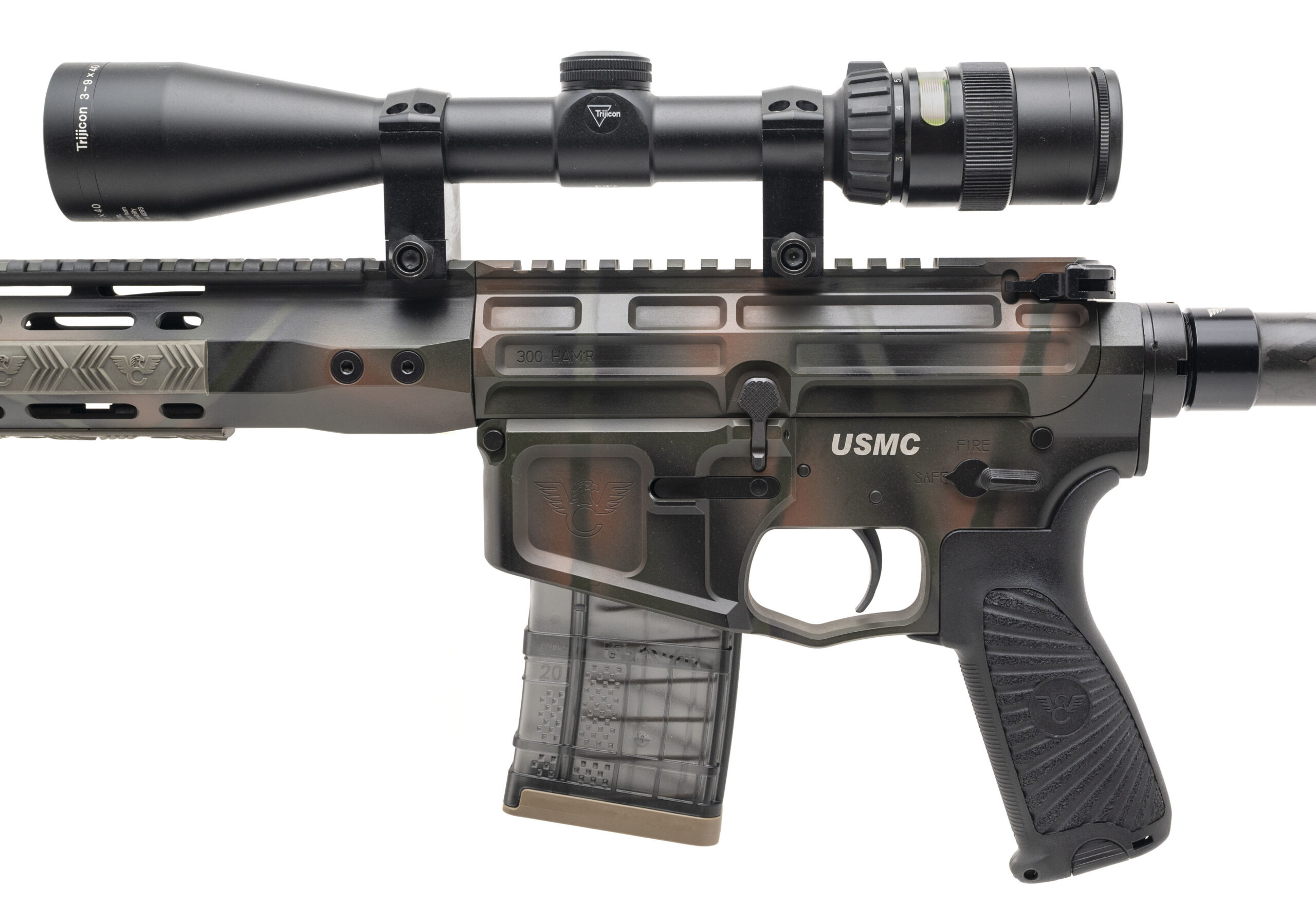SN: WCB3214. Modern production, .300 HAM'R with a 18" threaded barrel. Bore is very good. Semi-auto tactical rifle with a Trijicon 3-19x40mm scope, camo pattern Armor-Tuff finish, and a carbon fiber stock. Has USMC (U.S. Marine Corp.) etched on the lower receiver. Excellent condition overall.